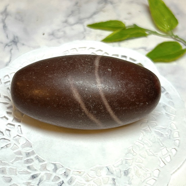 シバリンガム(Shiva Lingam) 産地:インド インドの七大聖地の一つのナルマダ川で採集されているもので、この川の両岸にあるヒンズー教寺院に生殖(子孫繁栄)の象徴として納められています。 この川は雨期になると水量が10メートル以上も上昇し、その急流により削られた岸の穴に堆積岩がたまりその中で長い年月をかけて水流により丸く削られています。 この堆積岩は石英の一種のクリストバル石が集合したもので表面の酸化鉄による焦げ茶色の模様が縁起の良いものとして重宝されています。 原石はいびつなものが多いために、1個1個卵型に 整形して磨いています。 *・゜゚・*・*:.。. .。.:*・゜゚・* *・゜゚・*・*:.。. .。.:*・゜゚・* ・* こちらの商品は店舗や他サイトにて同時に販売しております。 そのため、稀にご注文いただいた時点で、品切れになってしまうこともあります。 大変申し訳ございませんが、その場合はご連絡後、キャンセルとさせていただきます。ご迷惑をおかけしますが ご了承のほどよろしくお願い致します* ・* ゜゚・*:.。..。.:*.。. .。.:** ・* ゜゚・*:.。..。.:*.。. .。.:* 【石について 】 ・明るい場所で撮影しています。 ・小さなキズ、内包物等がある場合がございます。 天然石ゆえになりますので、ご理解の程よろしくお願いします。 ・なるべく実物に近い色合いになるように撮影していますが、お使いのモニターによっては実際の色と若干異なる場合があります。
