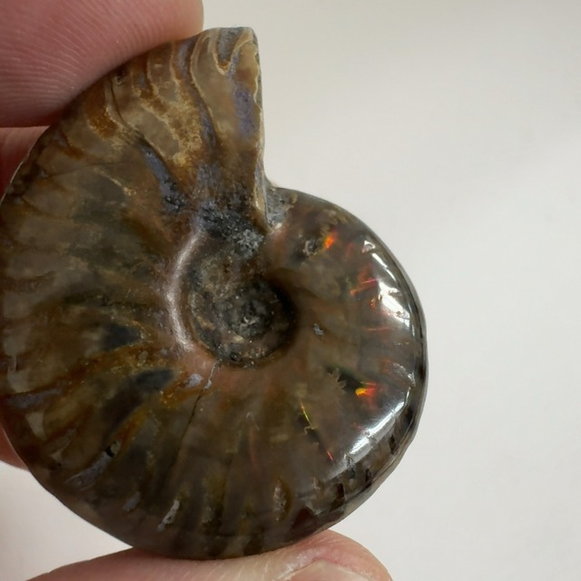 赤いファイヤーが魅力的 学名:Cleoniceras sp.(クリオニセラス) 時代:中生代白亜紀(1億4千年〜6千5百万年前) 産地:Ambarimaniga,Majunga,Madagascar 約40×31×13㎜ 強い赤色の閃光(ファイヤー)を放っているのは、地層中の酸化鉄や珪酸がアンモナイトの殻の表面に薄く付着し、細かなひび割れの部分がオパールのような遊色を浮き出させるため。 オパール化したアンモナイトや、アンモライトとよく間違われますが、別のものになります。 *・゜゚・*・*:.。. .。.:*・゜゚・* *・゜゚・*・*:.。. .。.:*・゜゚・* ・* こちらの商品は店舗や他サイトにて同時に販売しております。 そのため、稀にご注文いただいた時点で、品切れになってしまうこともあります。 大変申し訳ございませんが、その場合はご連絡後、キャンセルとさせていただきます。ご迷惑をおかけしますが ご了承のほどよろしくお願い致します* ・* ゜゚・*:.。..。.:*.。. .。.:** ・* ゜゚・*:.。..。.:*.。. .。.:* 【石について 】 ・明るい場所で撮影しています。 ・小さなキズ、内包物等がある場合がございます。 天然石ゆえになりますので、ご理解の程よろしくお願いします。 ・なるべく実物に近い色合いになるように撮影していますが、お使いのモニターによっては実際の色と若干異なる場合があります。
