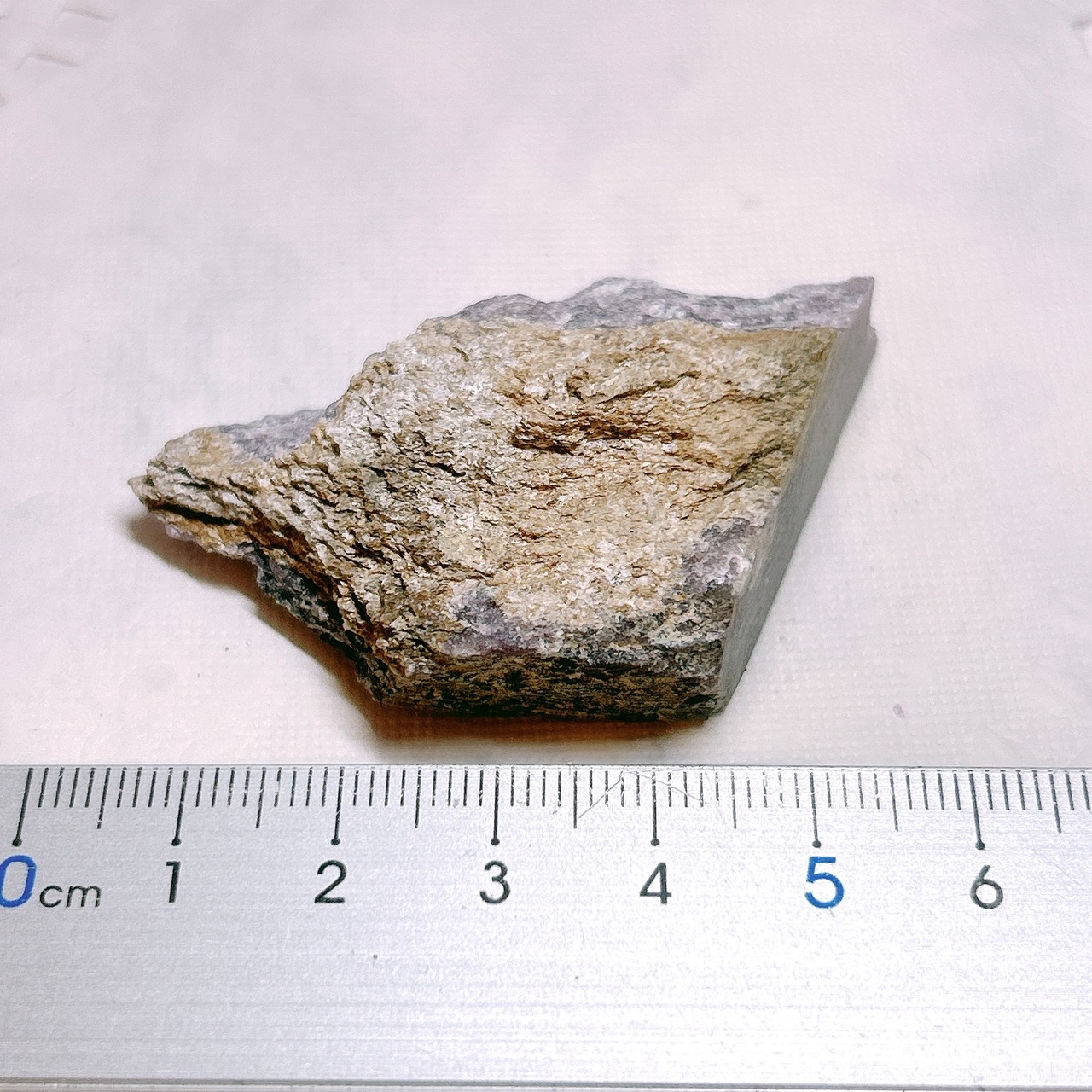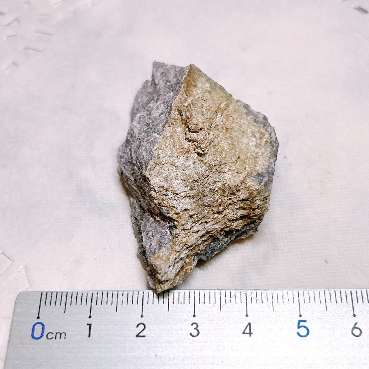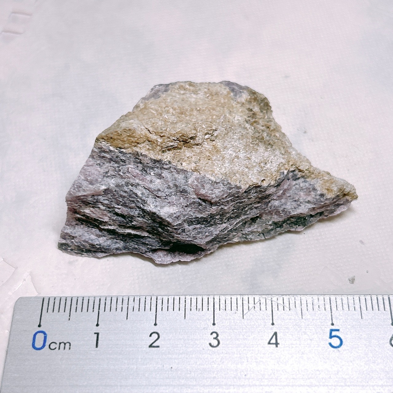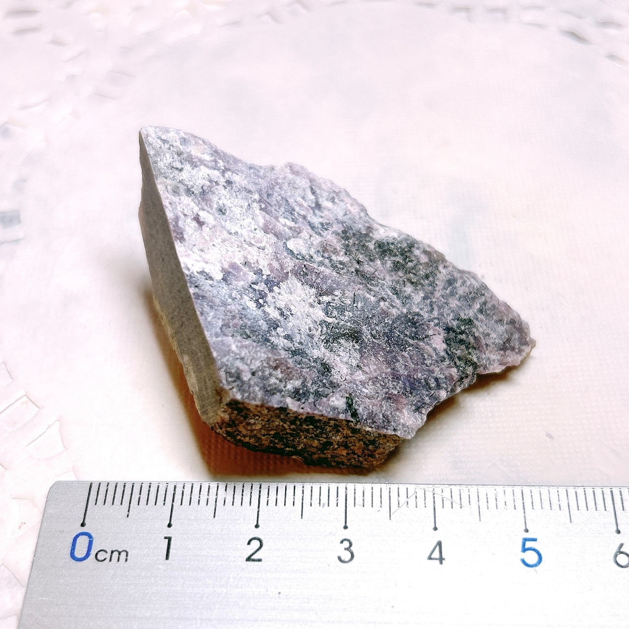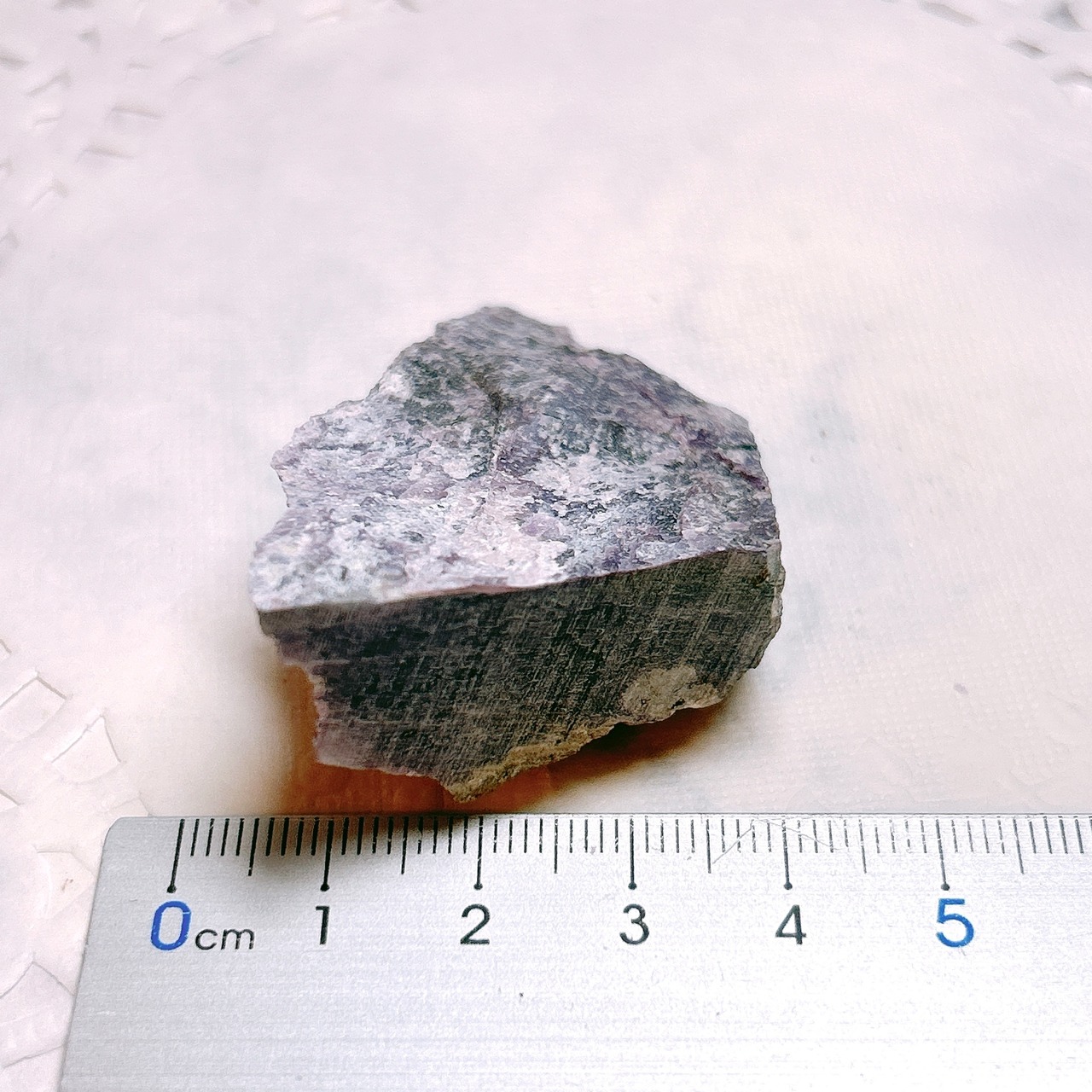 渦巻き状、羽状、毛状、針状の美しい紫色の模様になり、黒色のエジリン、オレンジ色のテイナクサイト、白色透明感がある微斜長石を伴っています。