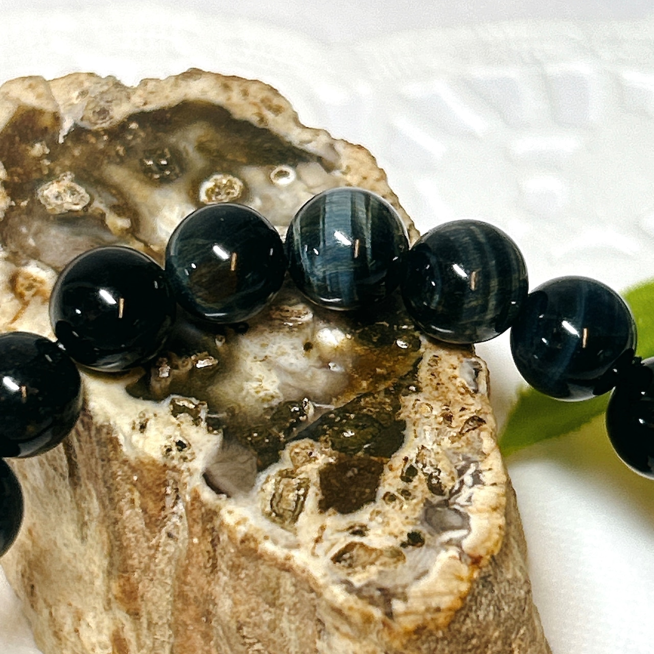単斜晶系に属する、細かくてしなやかな繊維状の結晶のクロシドライトが平行に混入したもので、これをカボションカットすると光線の反応で鷹の目のように見えるところから別名、「ホークスアイ」とも呼ばれています。