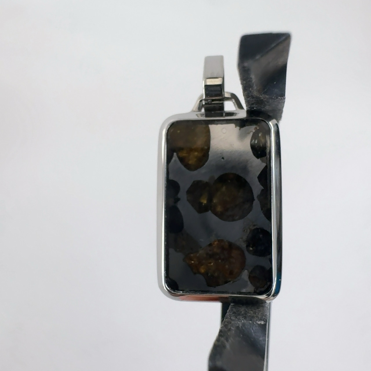 後ろから光を当てると橄欖石(宝石の名前はペリドット)が透けて美しいためにスライスして販売されることが多い。