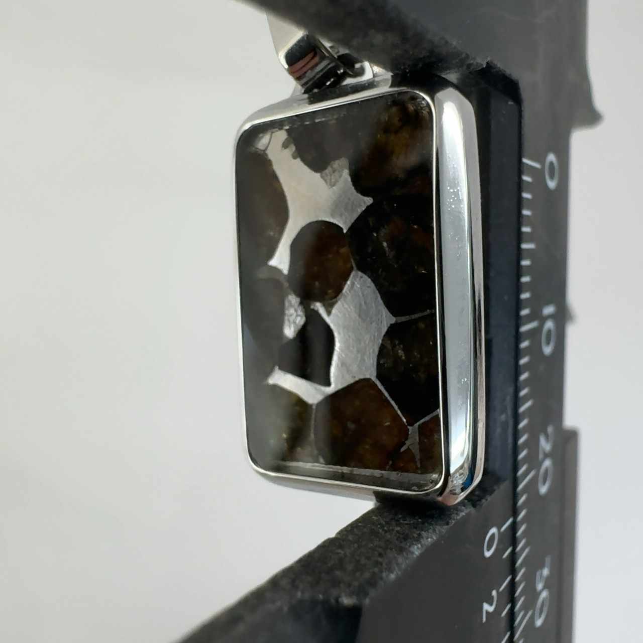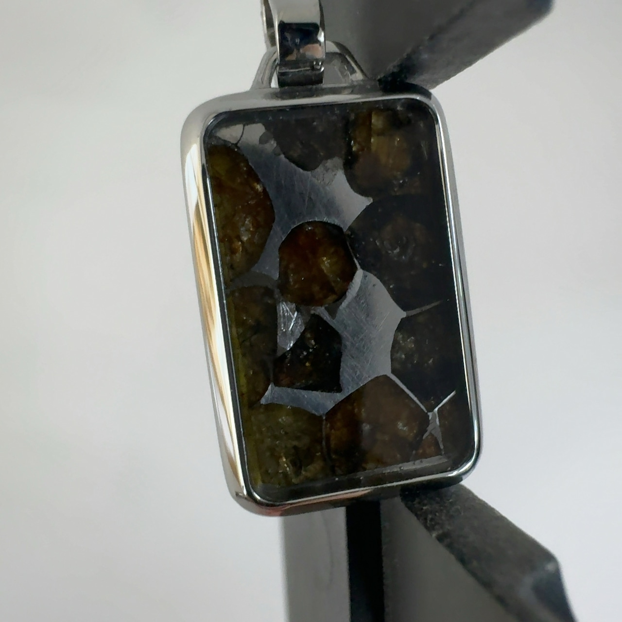 後ろから光を当てると橄欖石(宝石の名前はペリドット)が透けて美しいためにスライスして販売されることが多い。