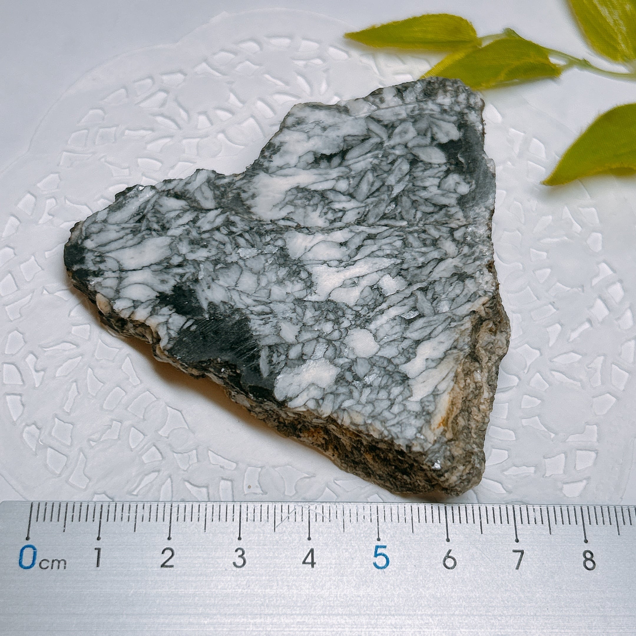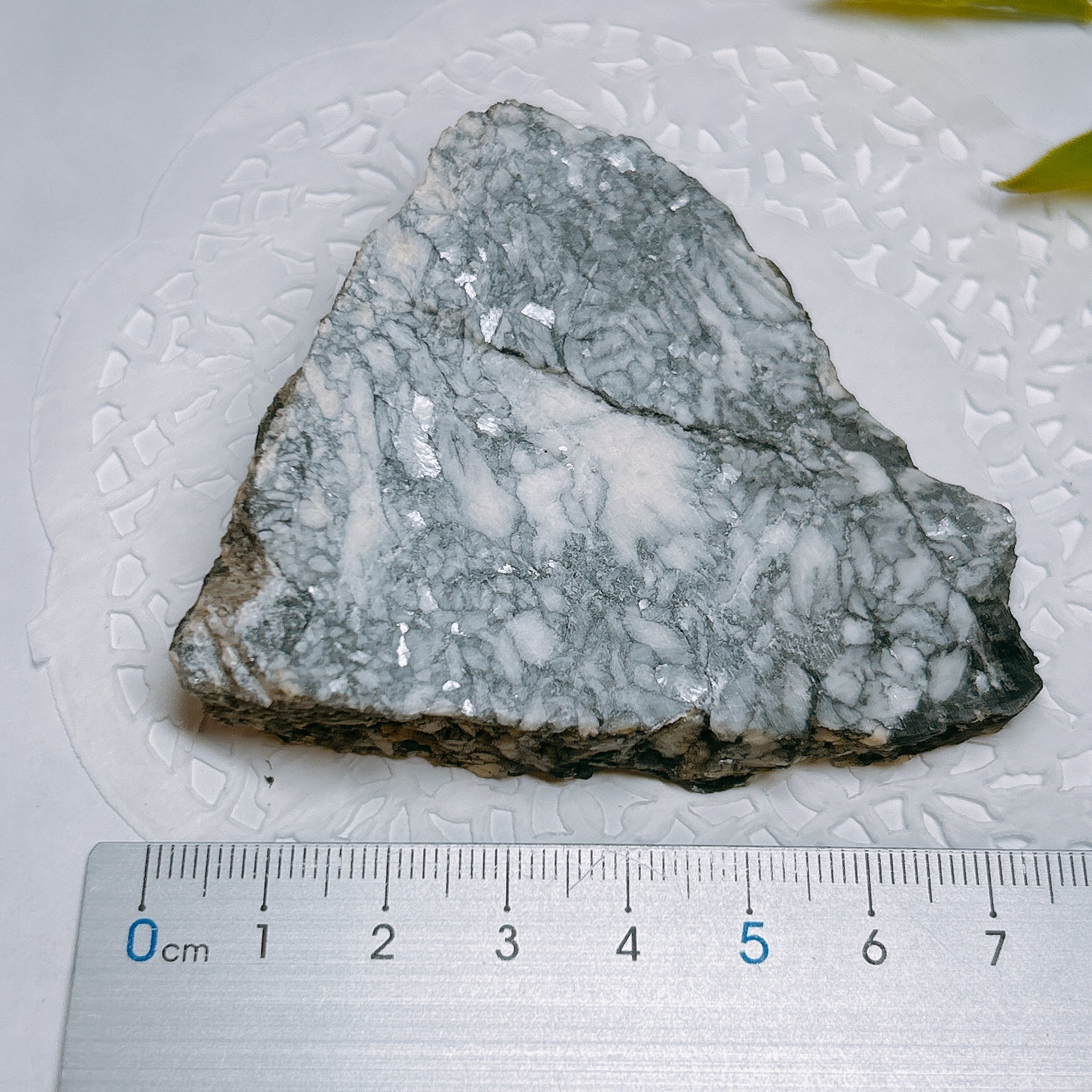 石墨に汚染された黒いドロマイトに含まれている、白色のマグネサイトの模様