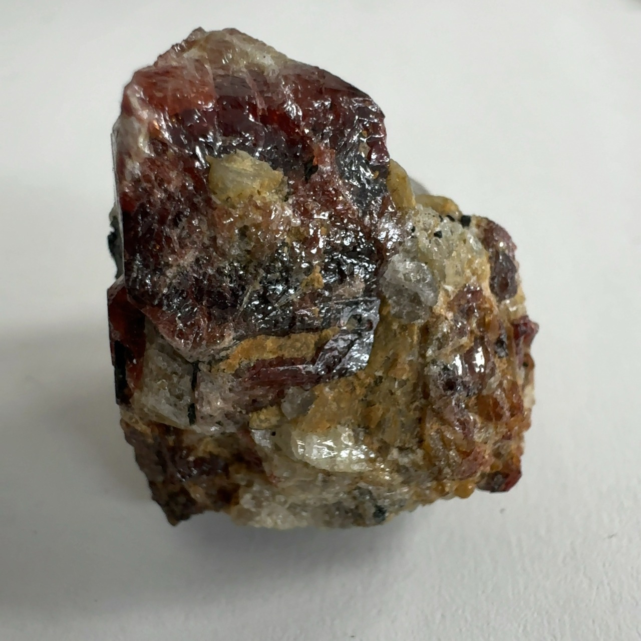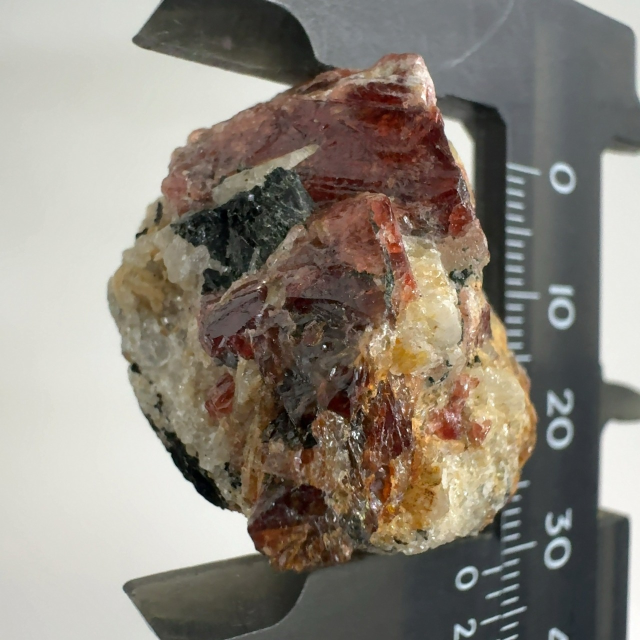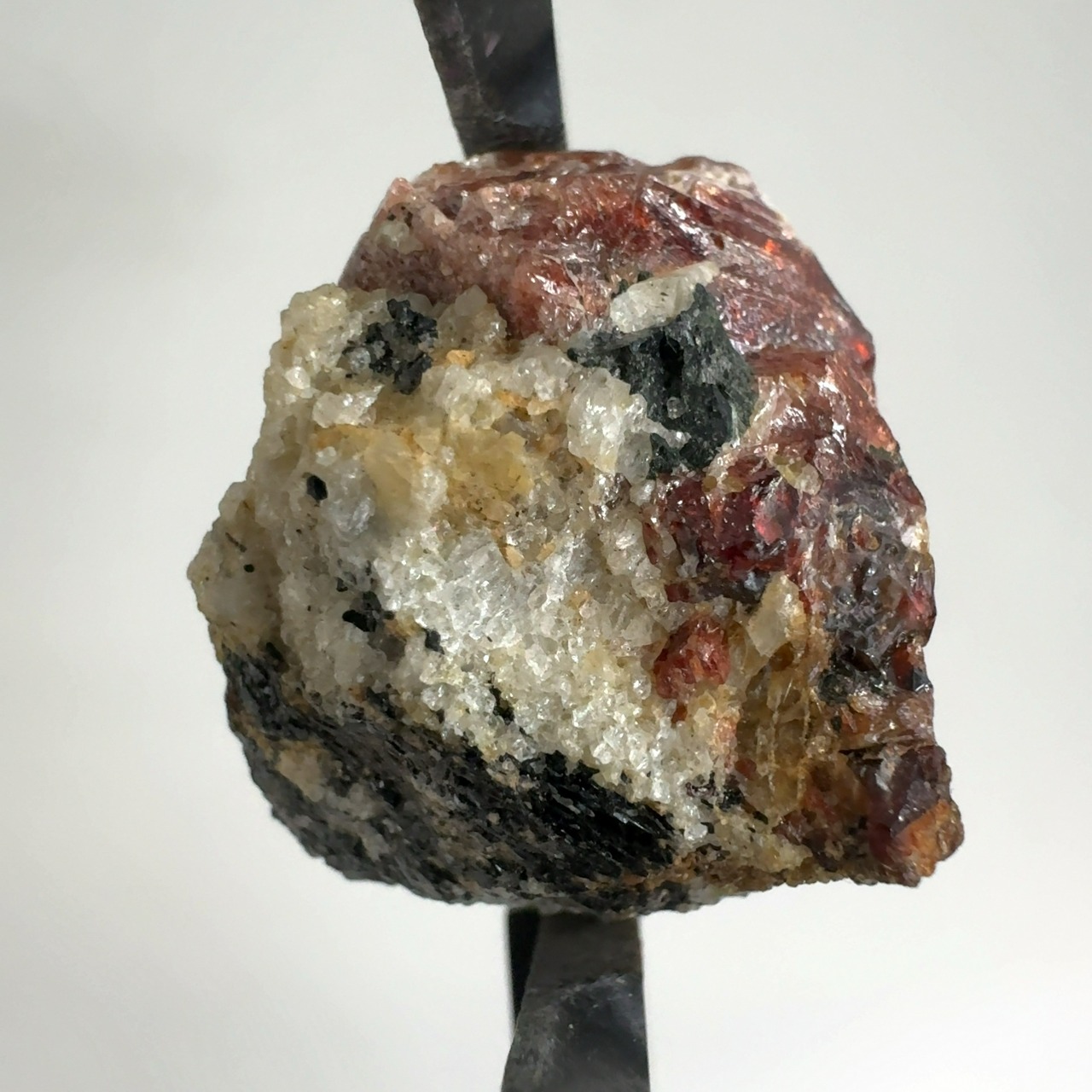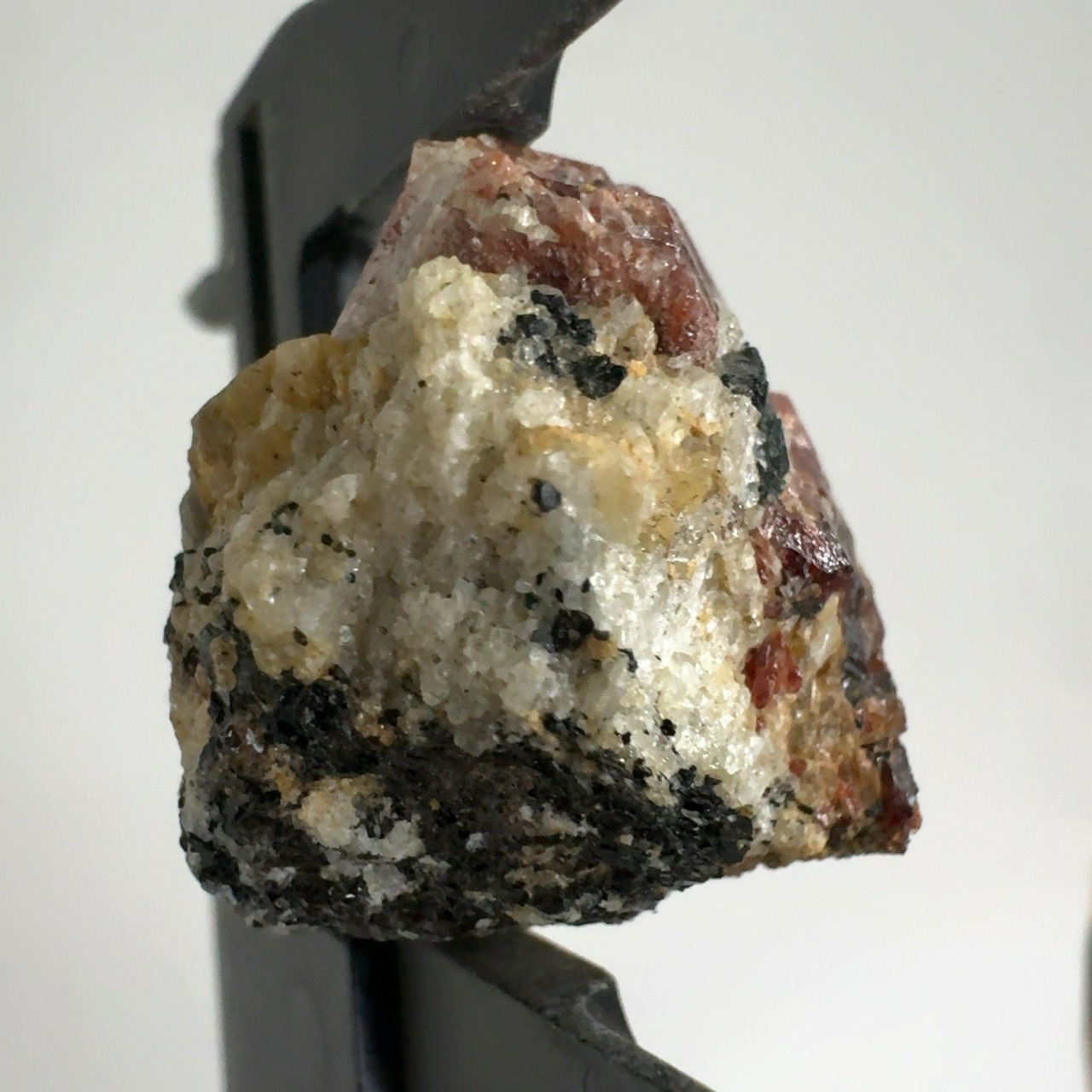 ペグマタイト(火成岩の一種で主に石英、長石、黒雲母)の母岩中の赤褐色が本鉱。