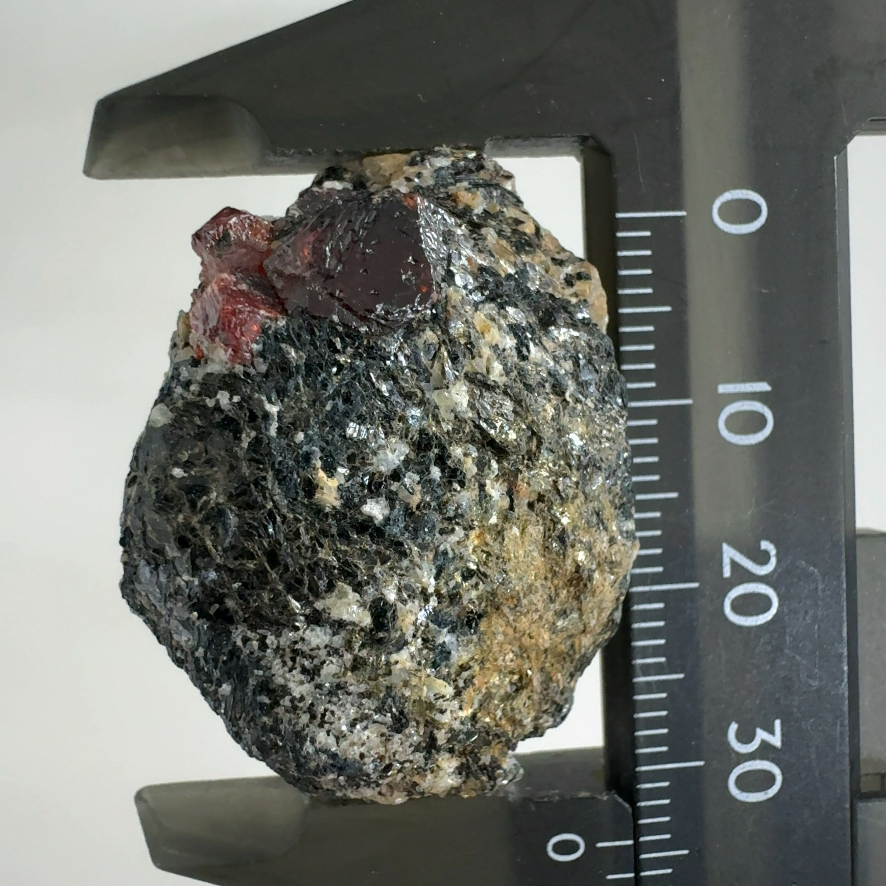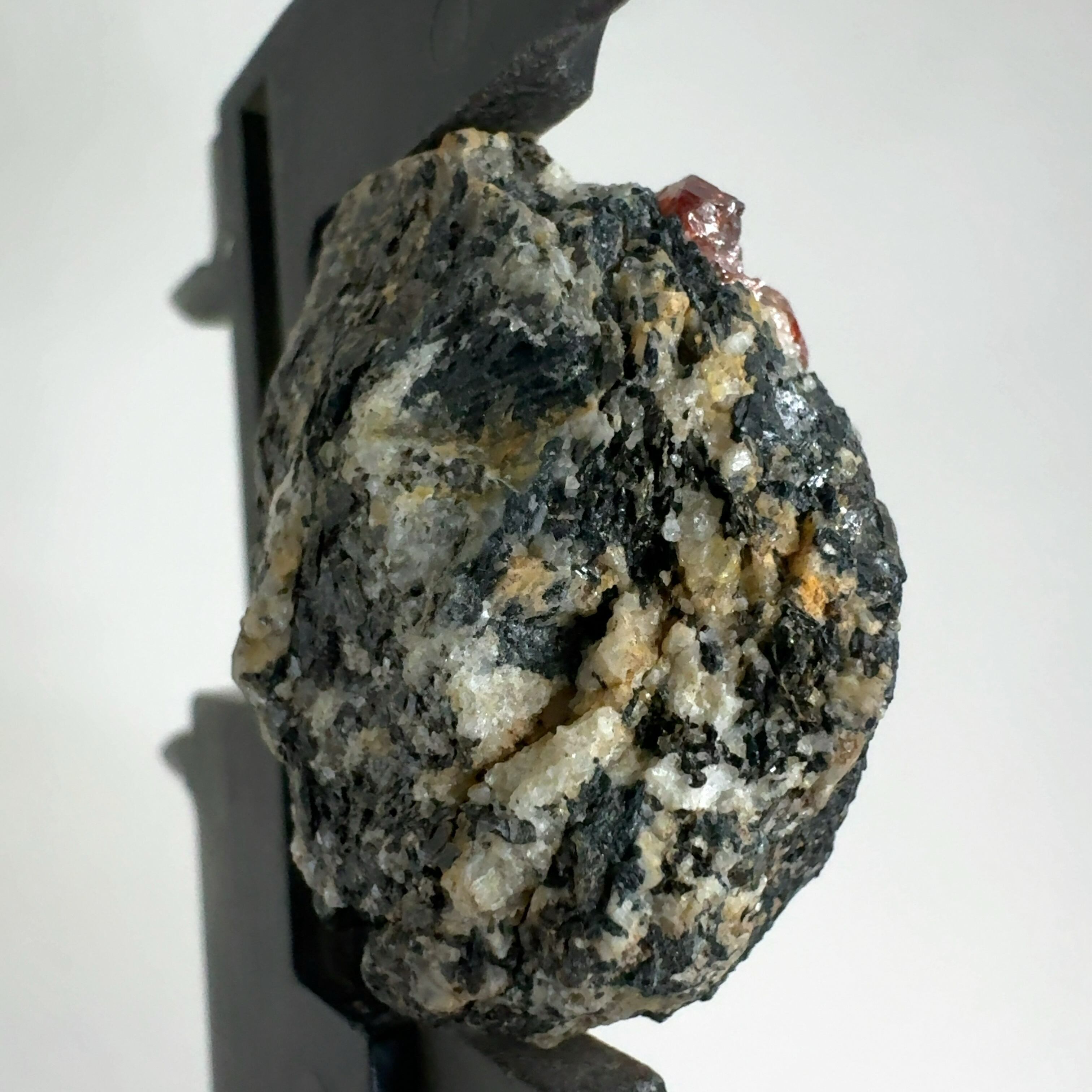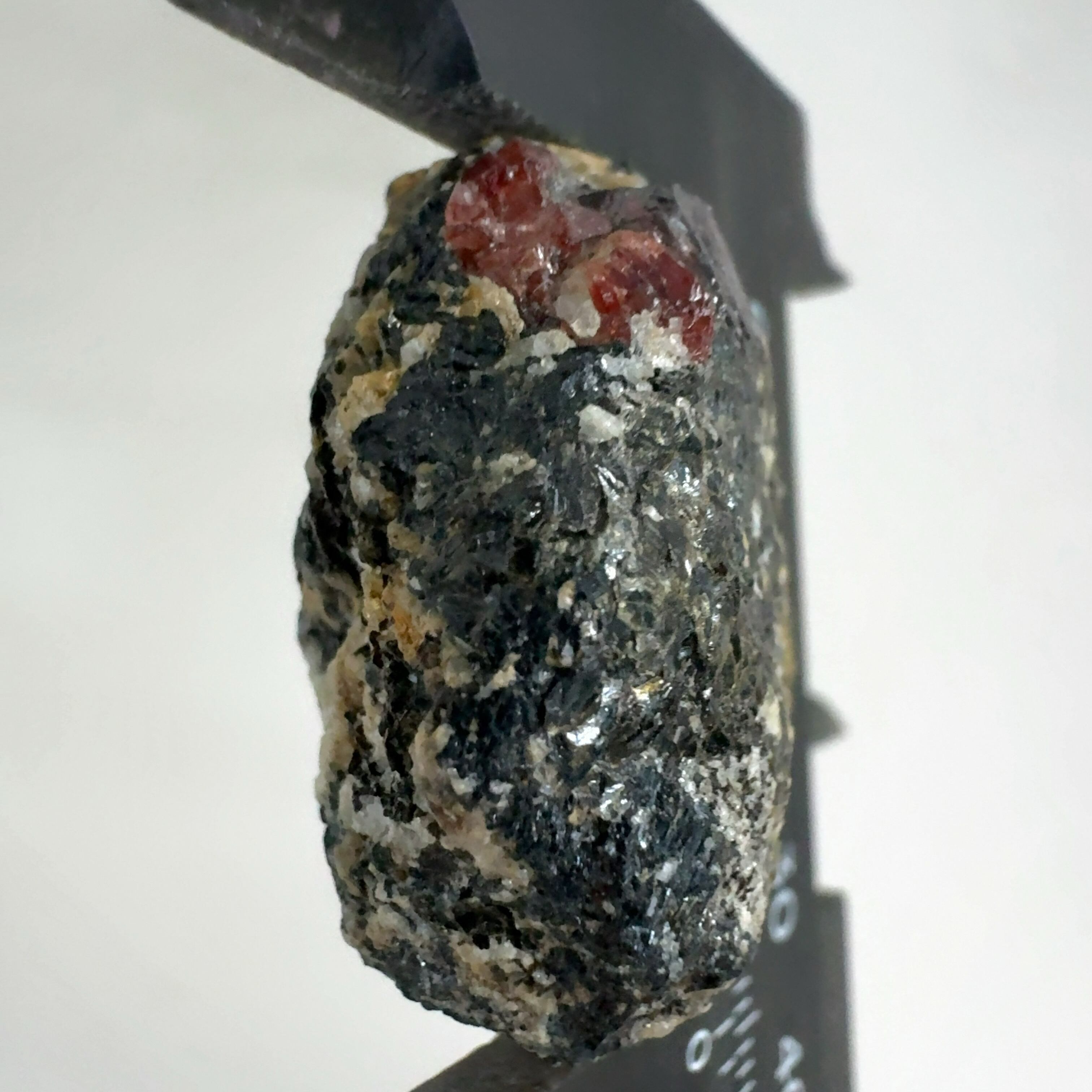 ペグマタイト(火成岩の一種で主に石英、長石、黒雲母)の母岩中の赤褐色が本鉱。