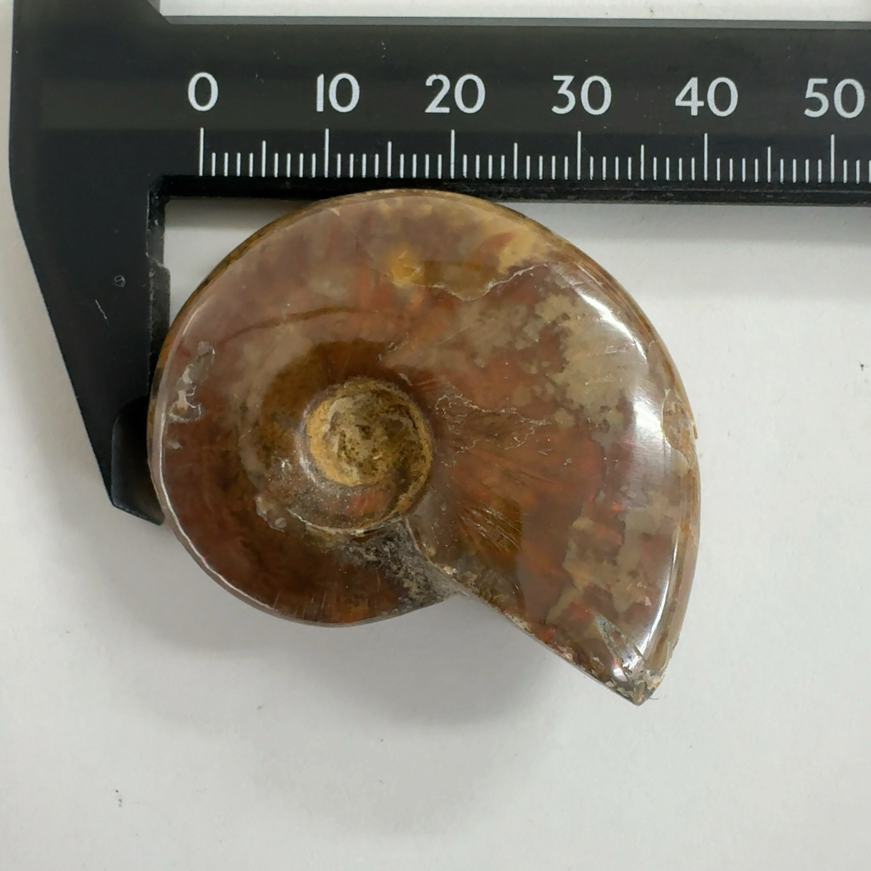 強い赤色の閃光(ファイヤー)を放っているのは、地層中の酸化鉄や珪酸がアンモナイトの殻の表面に薄く付着し、細かなひび割れの部分がオパールのような遊色を浮き出させるため。