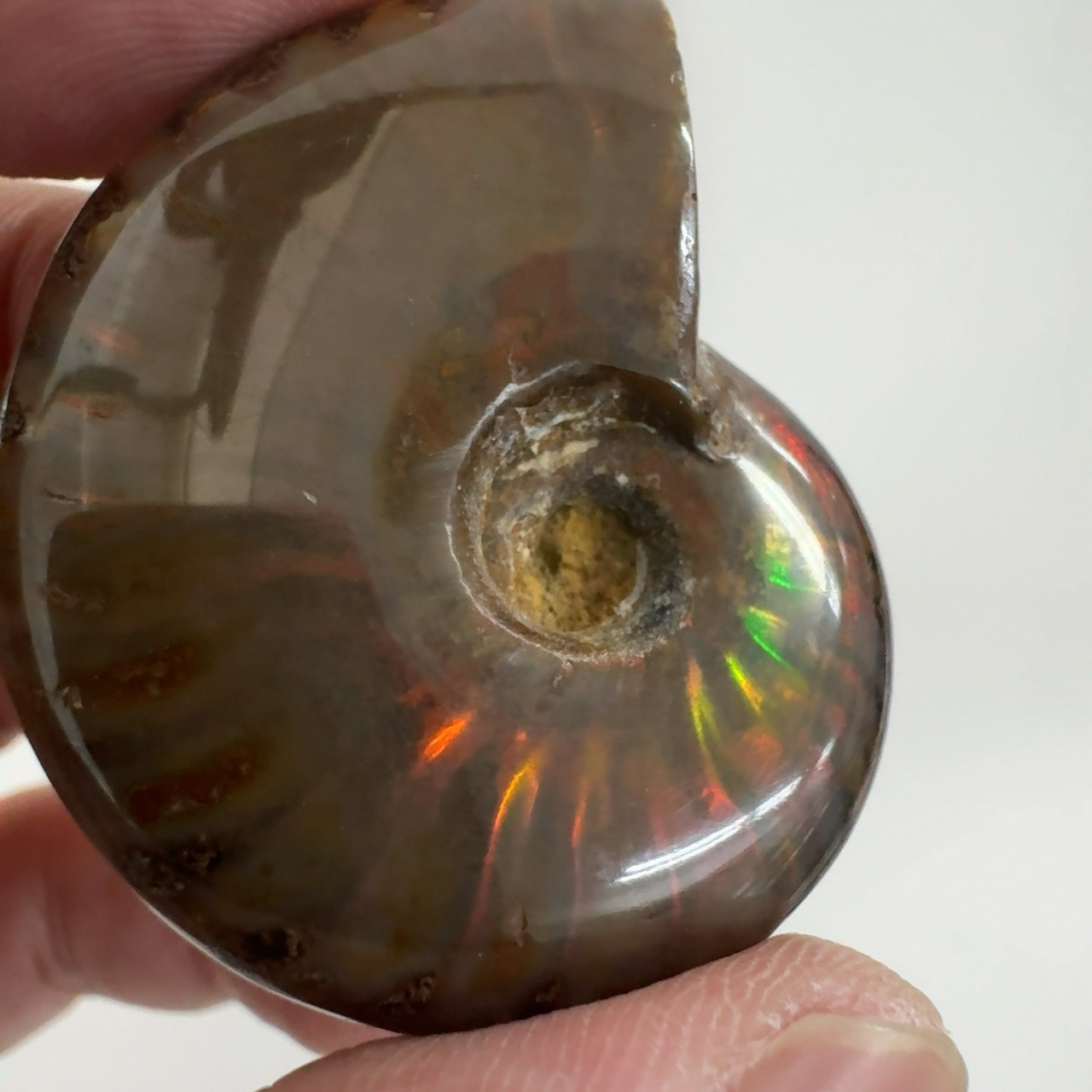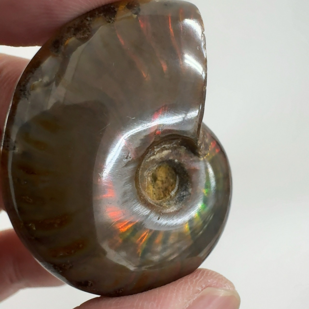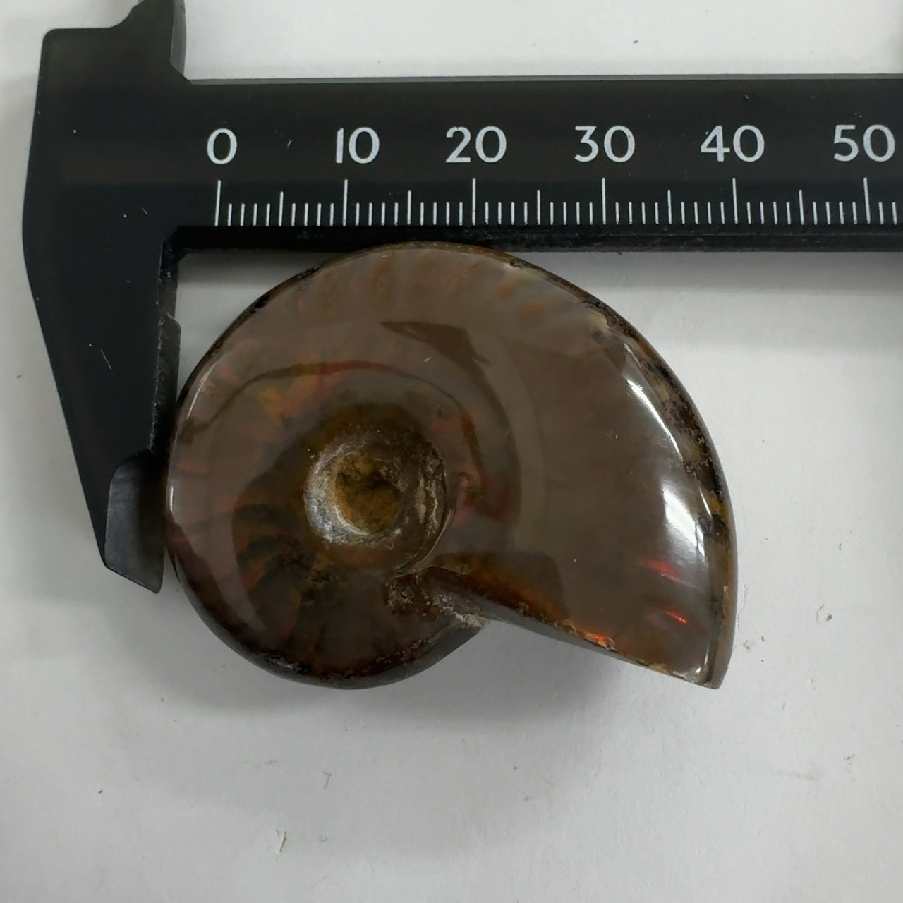 強い赤色の閃光(ファイヤー)を放っているのは、地層中の酸化鉄や珪酸がアンモナイトの殻の表面に薄く付着し、細かなひび割れの部分がオパールのような遊色を浮き出させるため。
