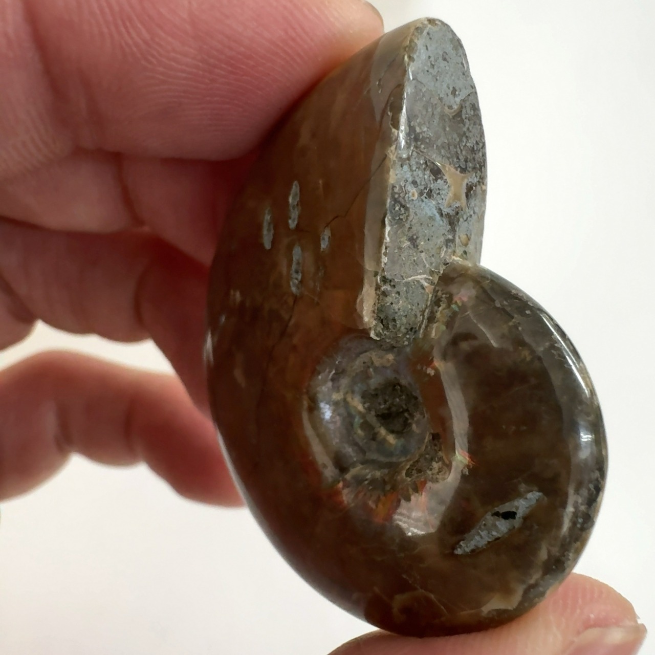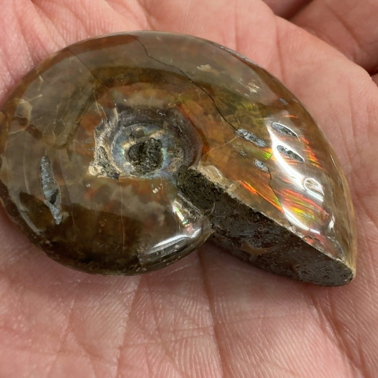 強い赤色の閃光(ファイヤー)を放っているのは、地層中の酸化鉄や珪酸がアンモナイトの殻の表面に薄く付着し、細かなひび割れの部分がオパールのような遊色を浮き出させるため。
