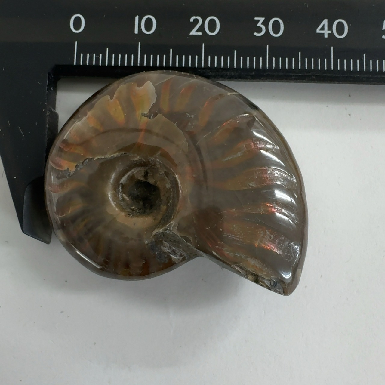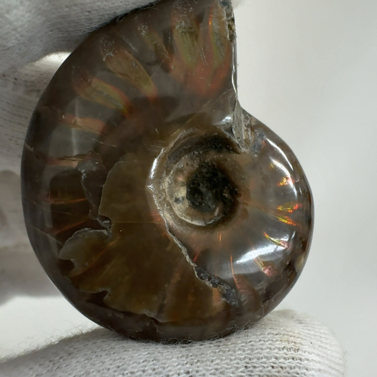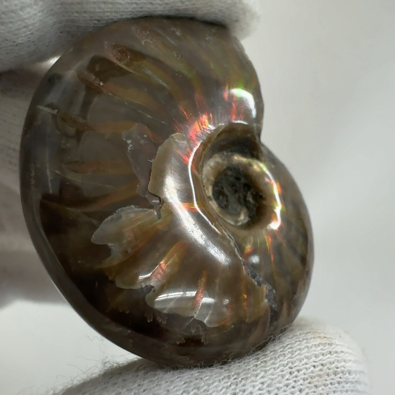 強い赤色の閃光(ファイヤー)を放っているのは、地層中の酸化鉄や珪酸がアンモナイトの殻の表面に薄く付着し、細かなひび割れの部分がオパールのような遊色を浮き出させるため。