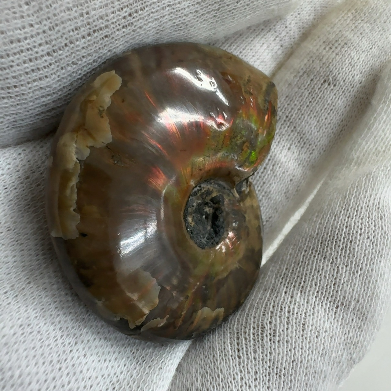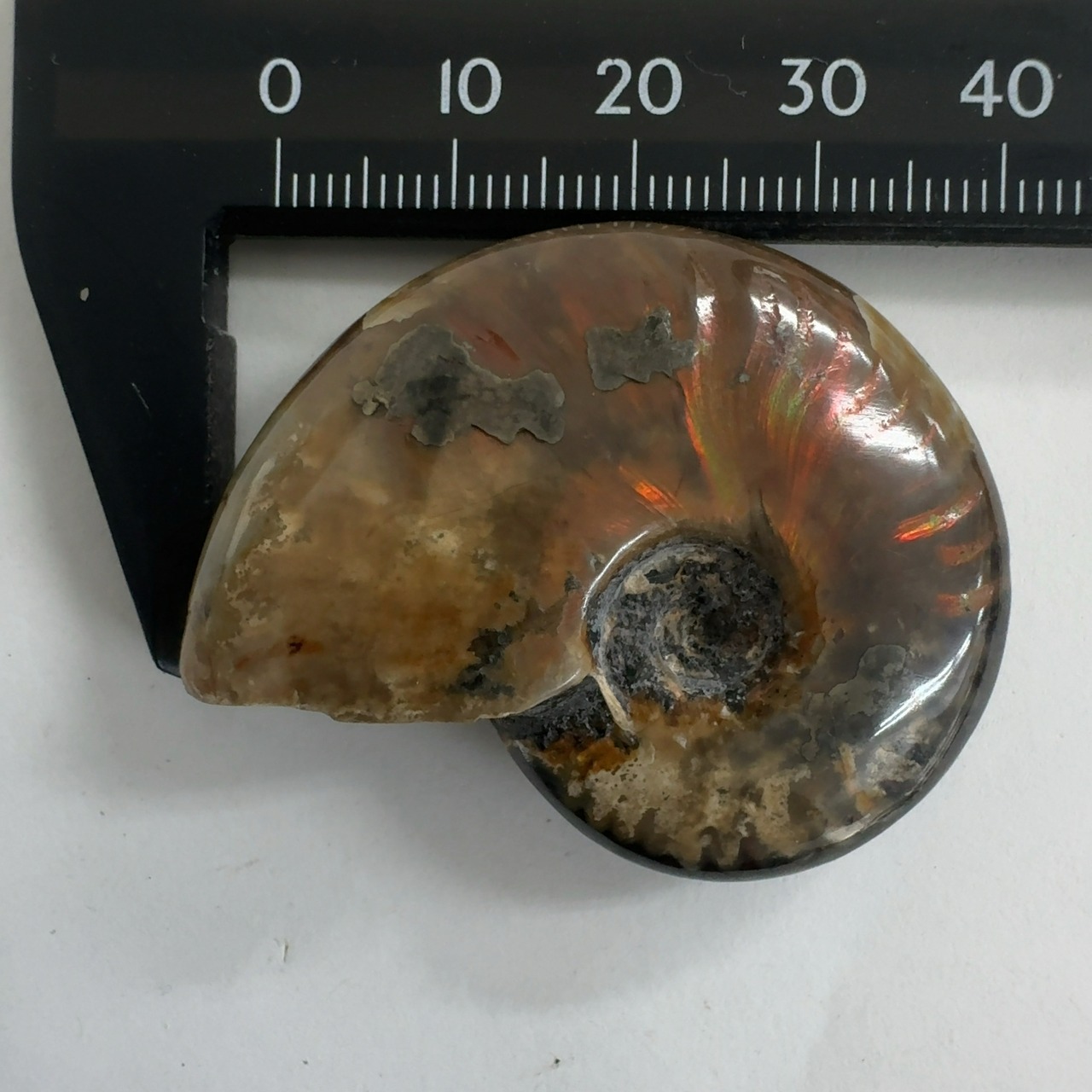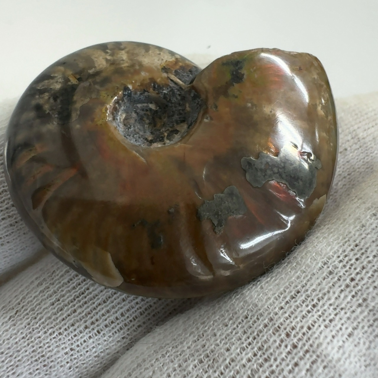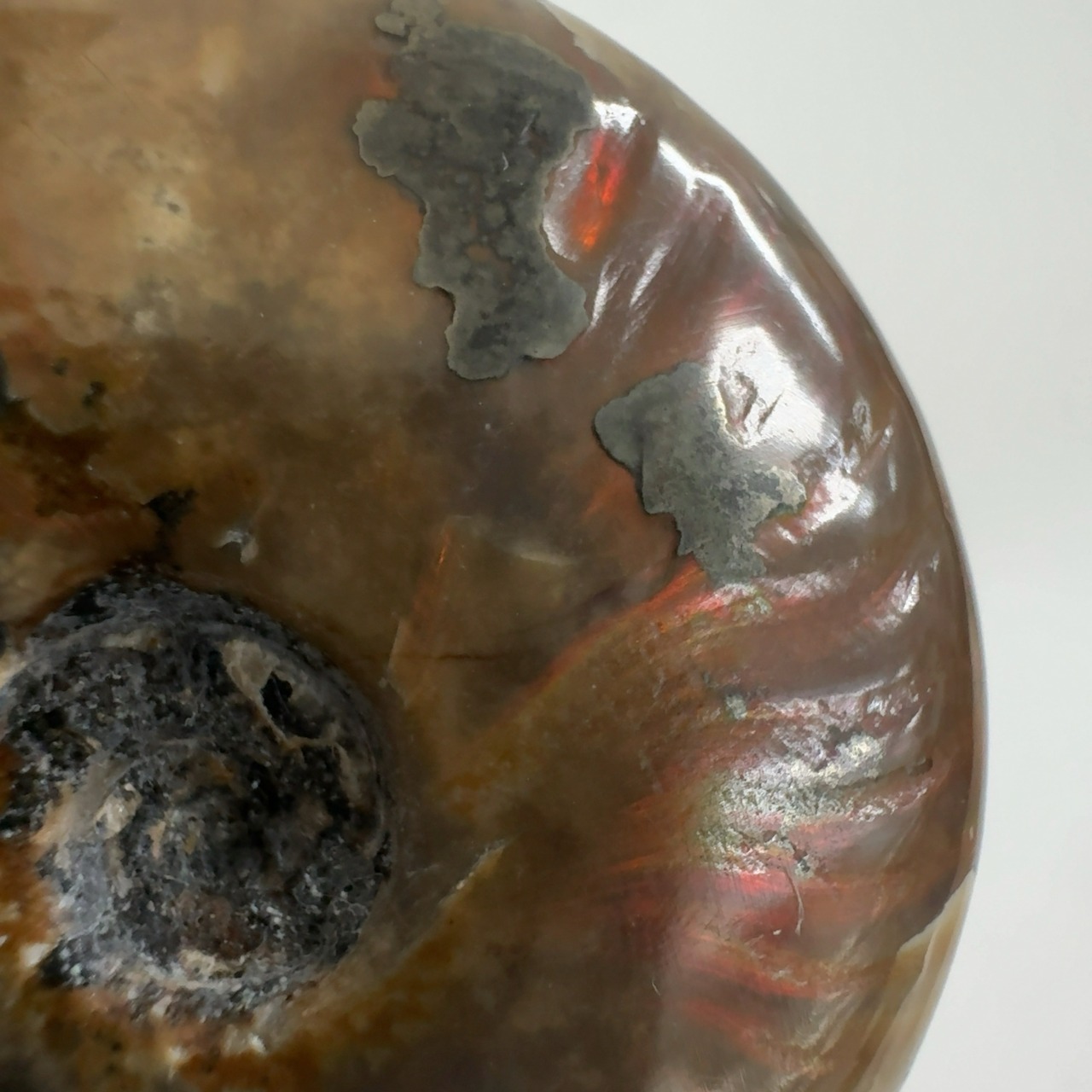 強い赤色の閃光(ファイヤー)を放っているのは、地層中の酸化鉄や珪酸がアンモナイトの殻の表面に薄く付着し、細かなひび割れの部分がオパールのような遊色を浮き出させるため。