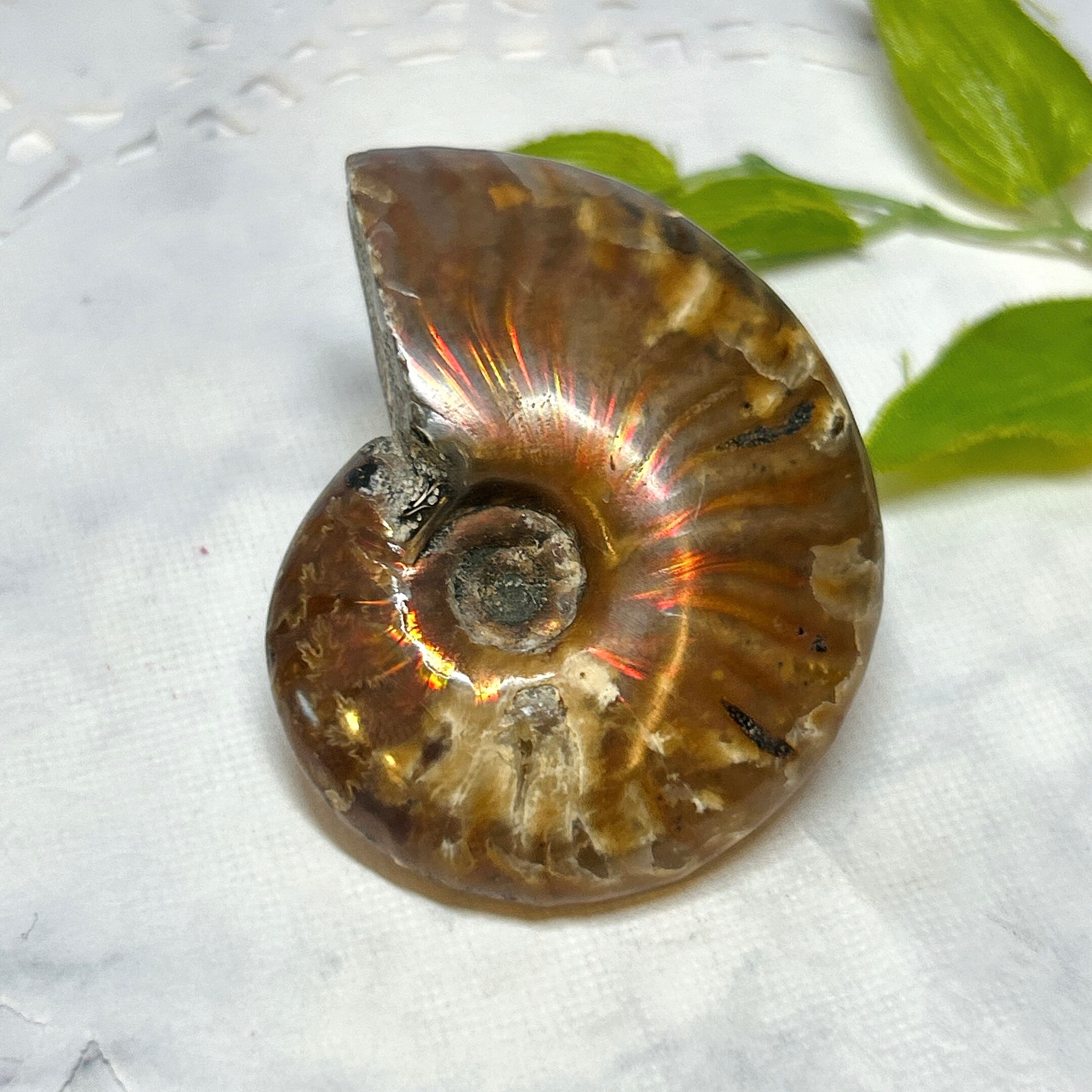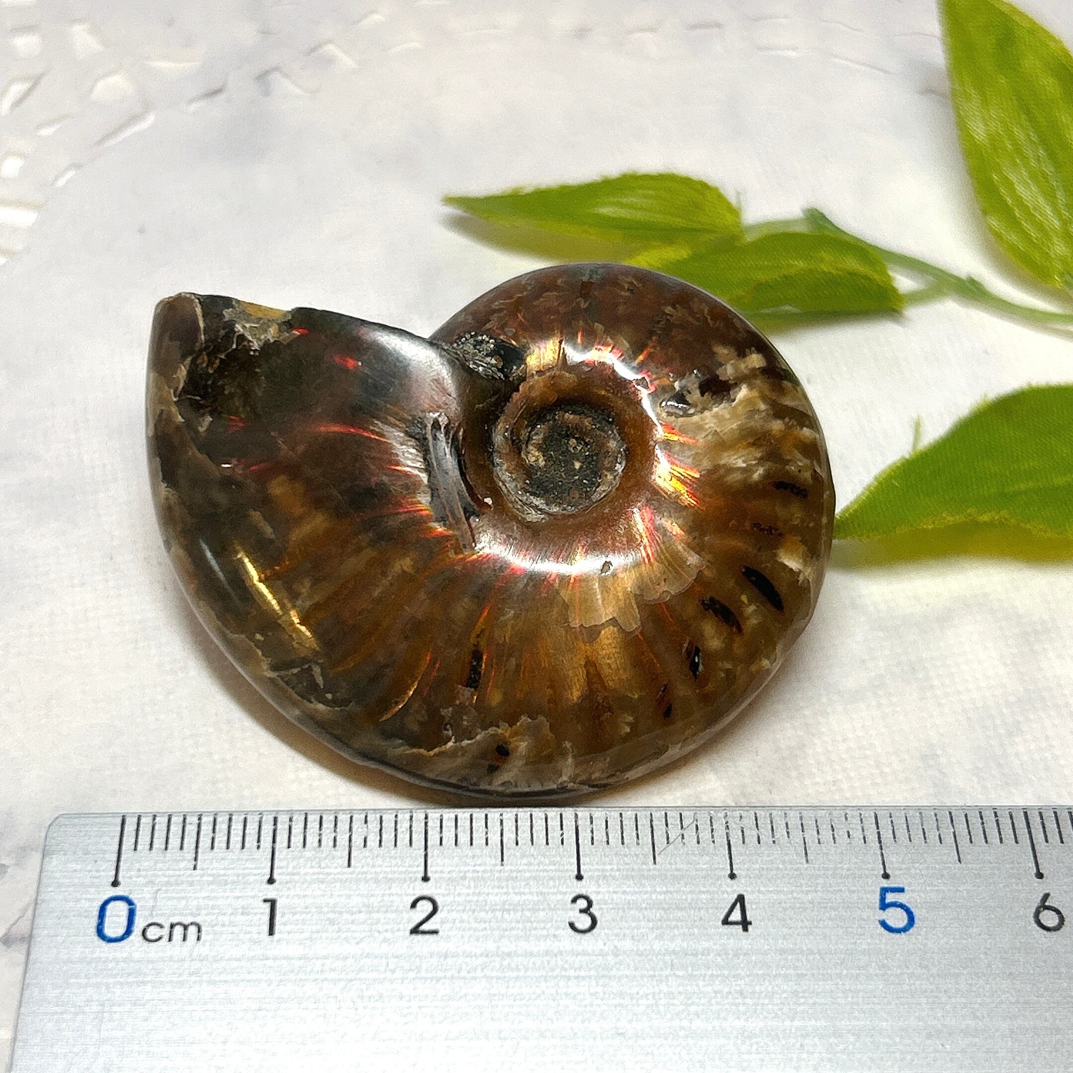強い赤色の閃光(ファイヤー)を放っているのは、地層中の酸化鉄や珪酸がアンモナイトの殻の表面に薄く付着し、細かなひび割れの部分がオパールのような遊色を浮き出させるため。