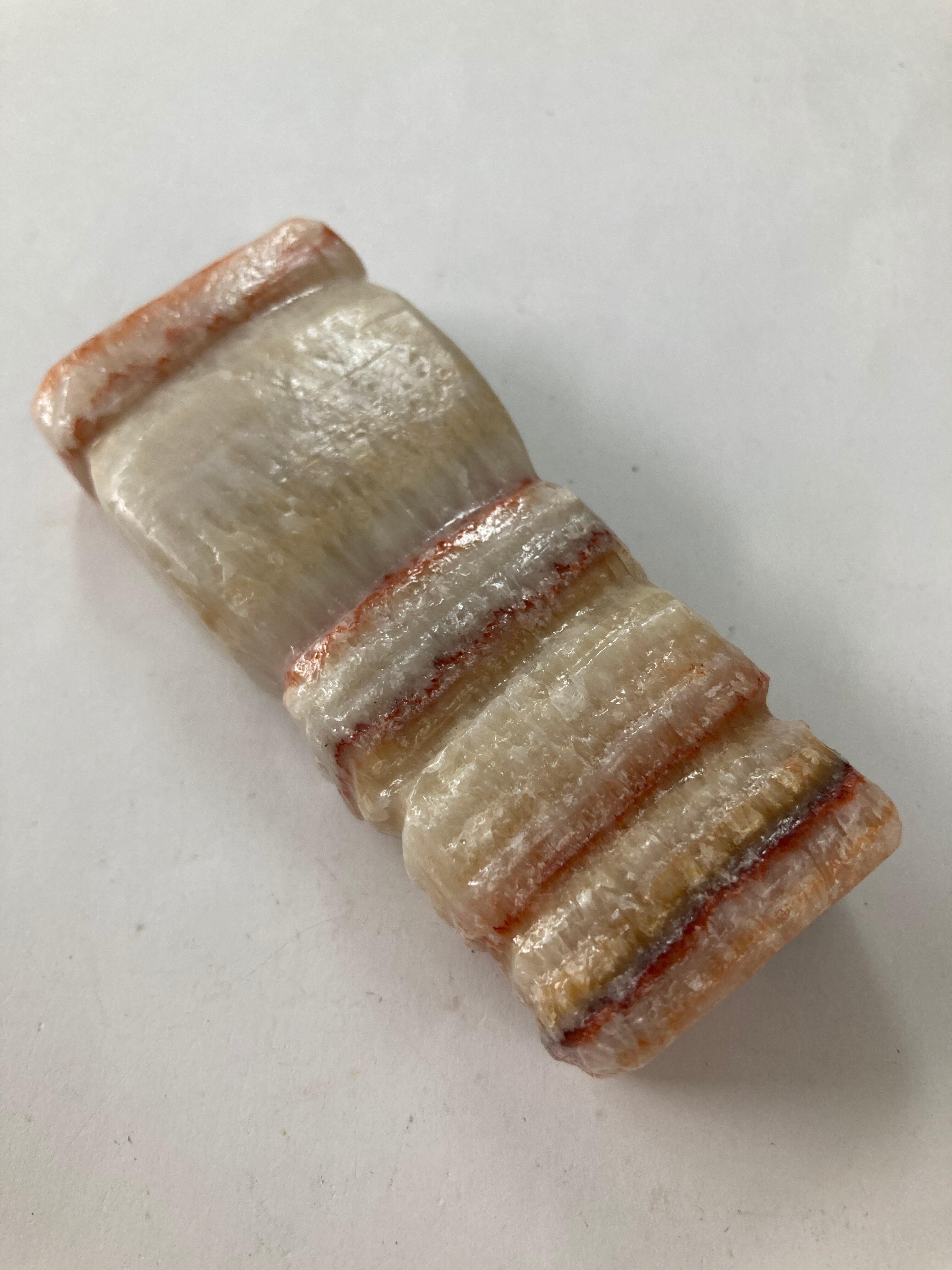その名も豚肉石。方解石とあられ石が層になっています。