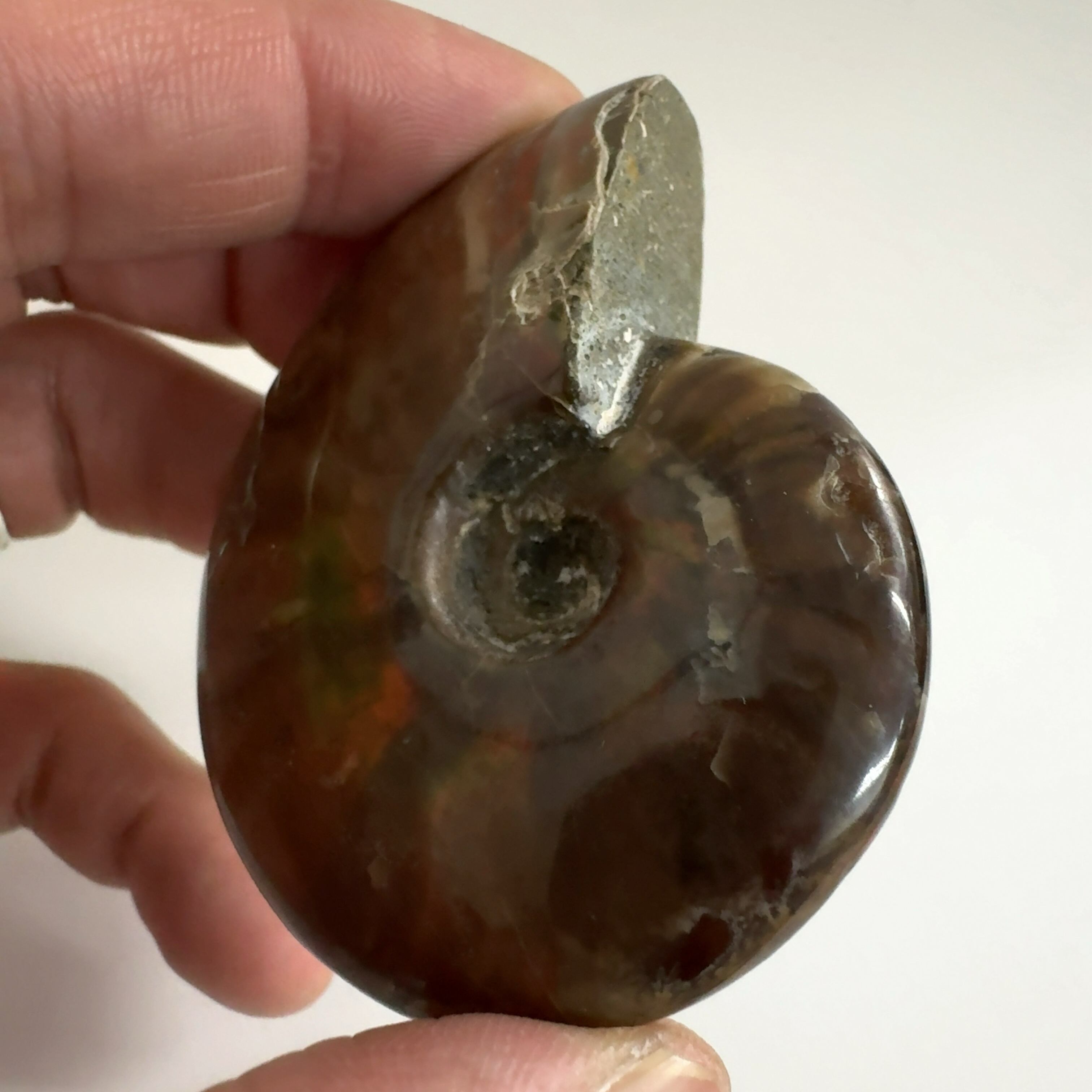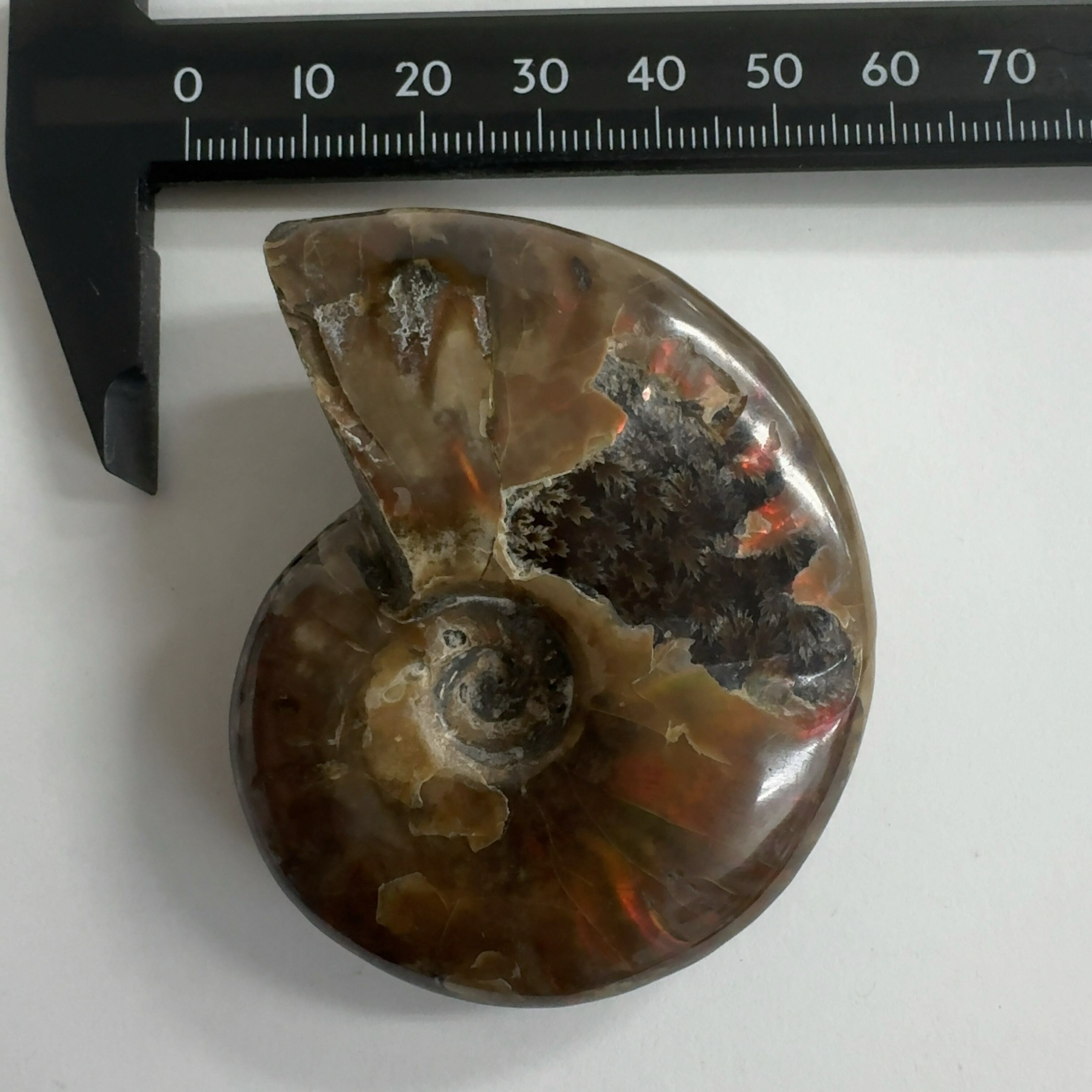 強い赤色の閃光(ファイヤー)を放っているのは、地層中の酸化鉄や珪酸がアンモナイトの殻の表面に薄く付着し、細かなひび割れの部分がオパールのような遊色を浮き出させるため。