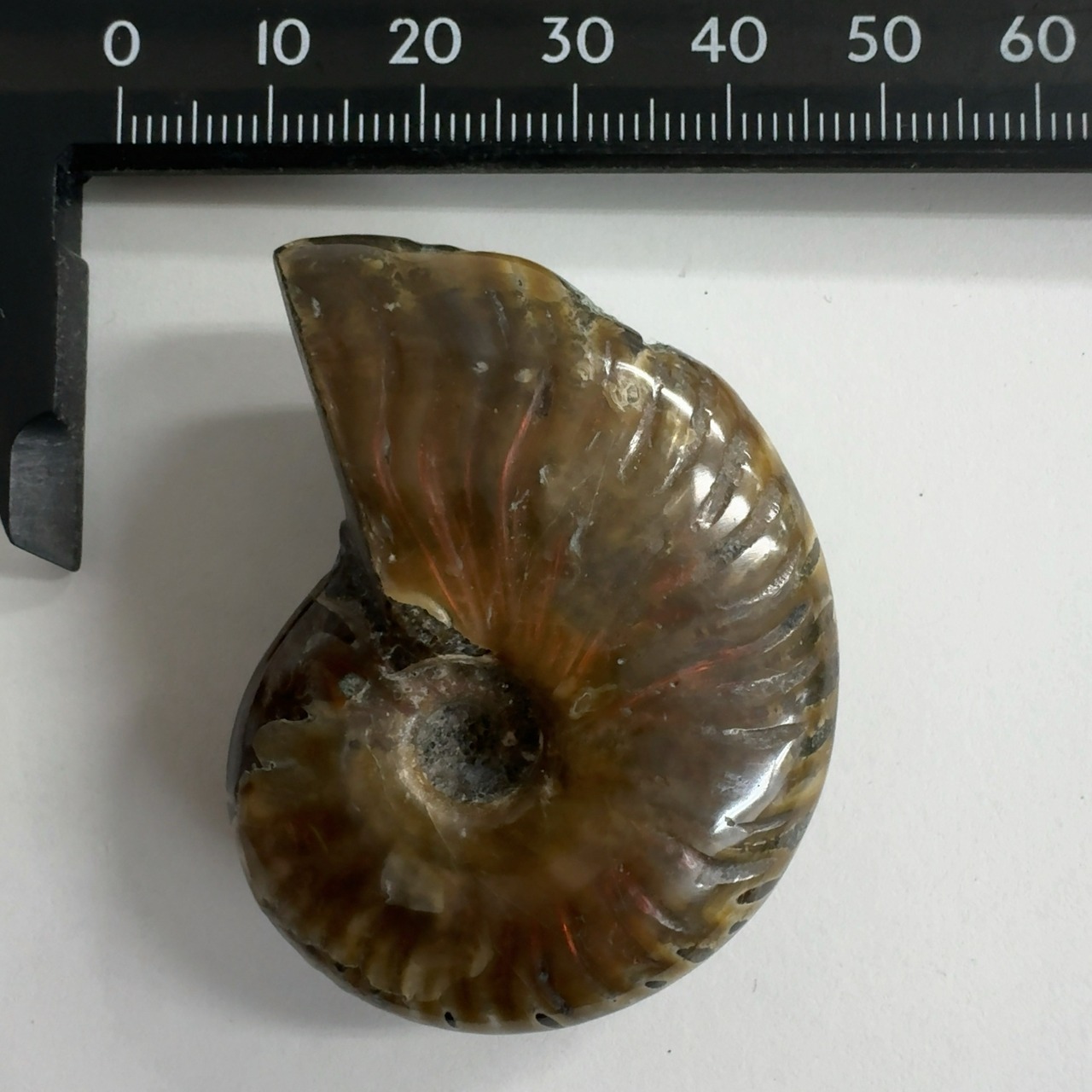 強い赤色の閃光(ファイヤー)を放っているのは、地層中の酸化鉄や珪酸がアンモナイトの殻の表面に薄く付着し、細かなひび割れの部分がオパールのような遊色を浮き出させるため。