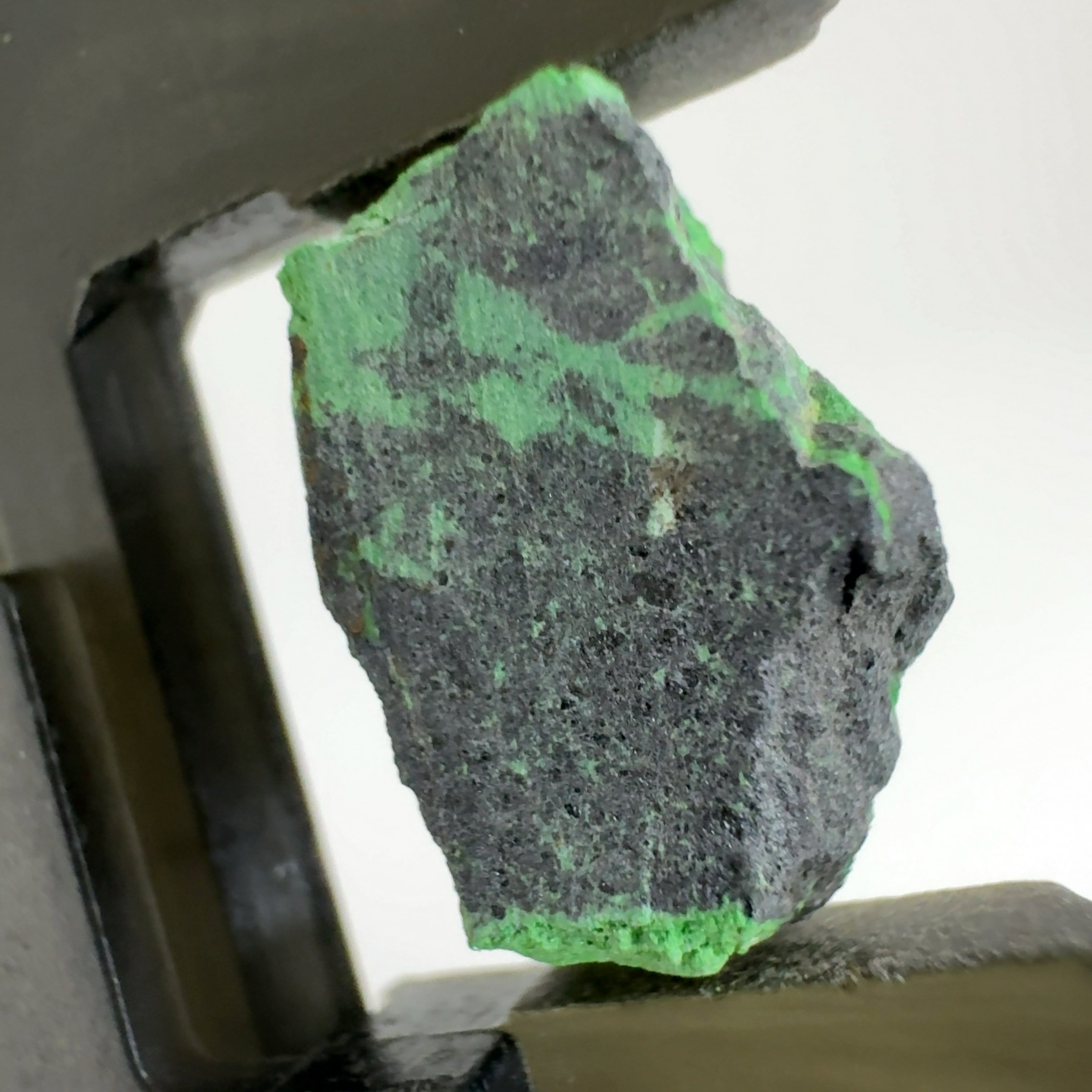 クロム鉄鉱の表面に、濃い緑色の微細な十二面体結晶で付着しています。