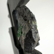 クロム鉄鉱の表面に、濃い緑色の微細な十二面体結晶で付着しています。