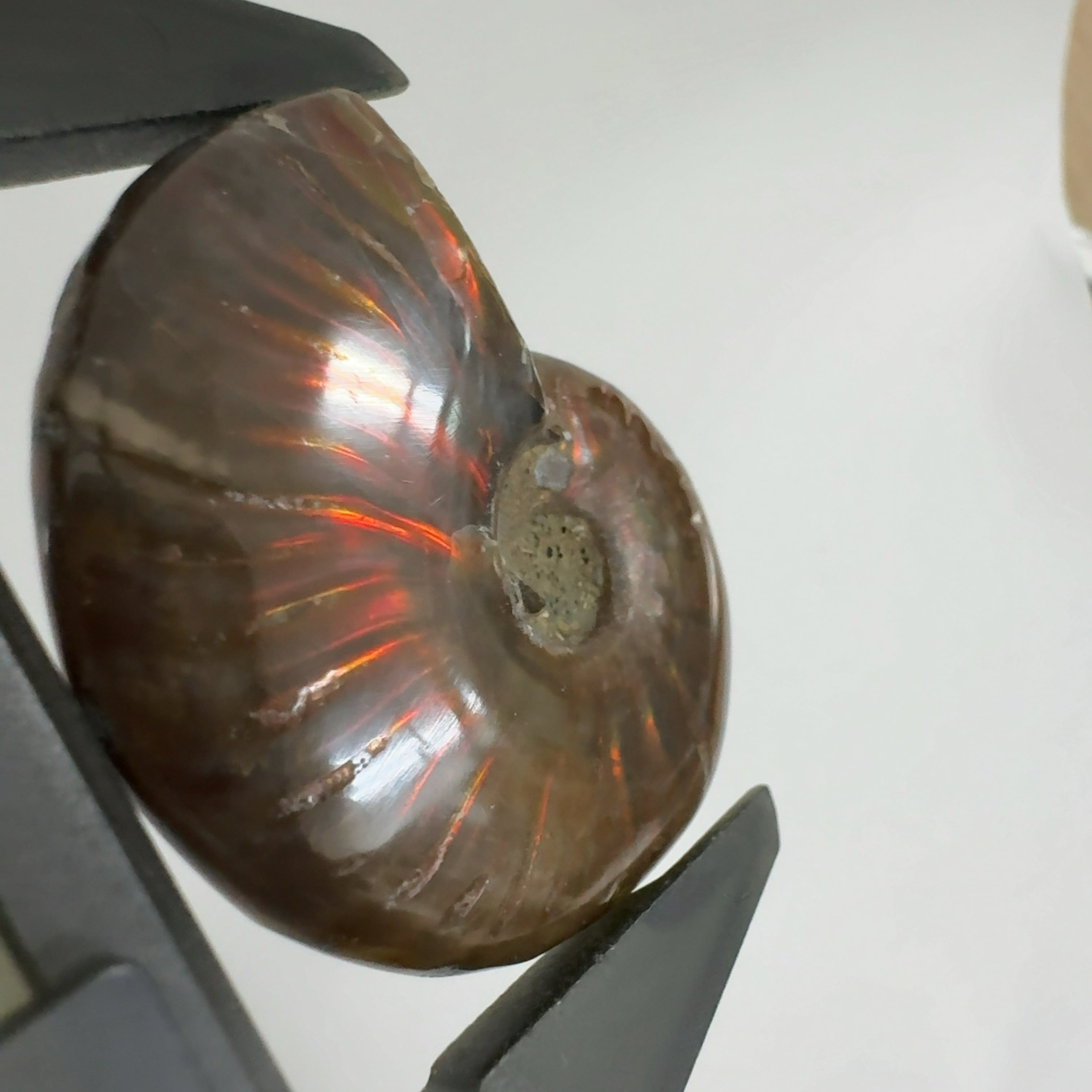 強い赤色の閃光(ファイヤー)を放っているのは、地層中の酸化鉄や珪酸がアンモナイトの殻の表面に薄く付着し、細かなひび割れの部分がオパールのような遊色を浮き出させるため。