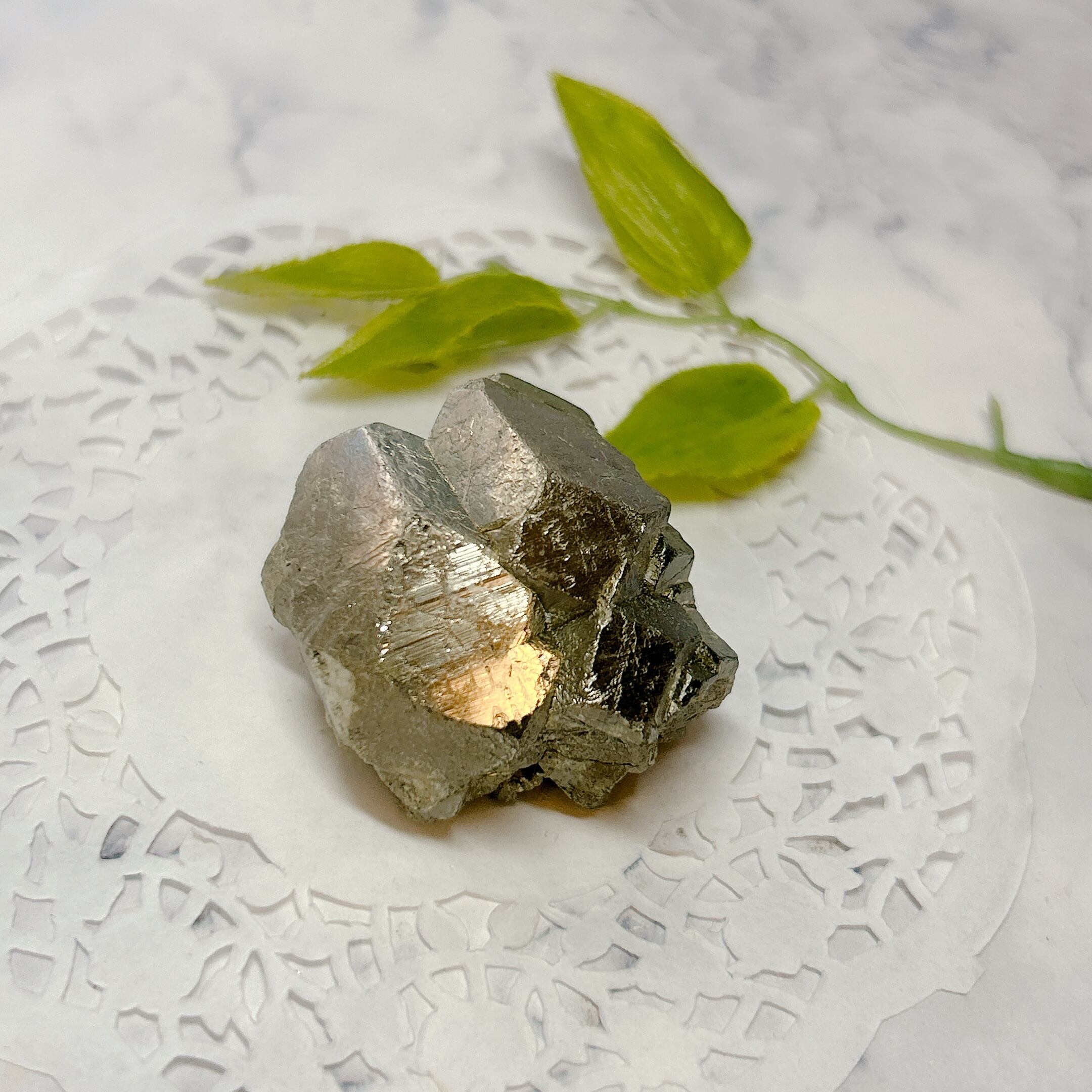 硫黄と鉄の化合物。黄金色の美しい光沢および、立方体、五画十二面体、八面体、二十四面体、又はそれらが合わさった形など様々な結晶をするので標本として人気があります。