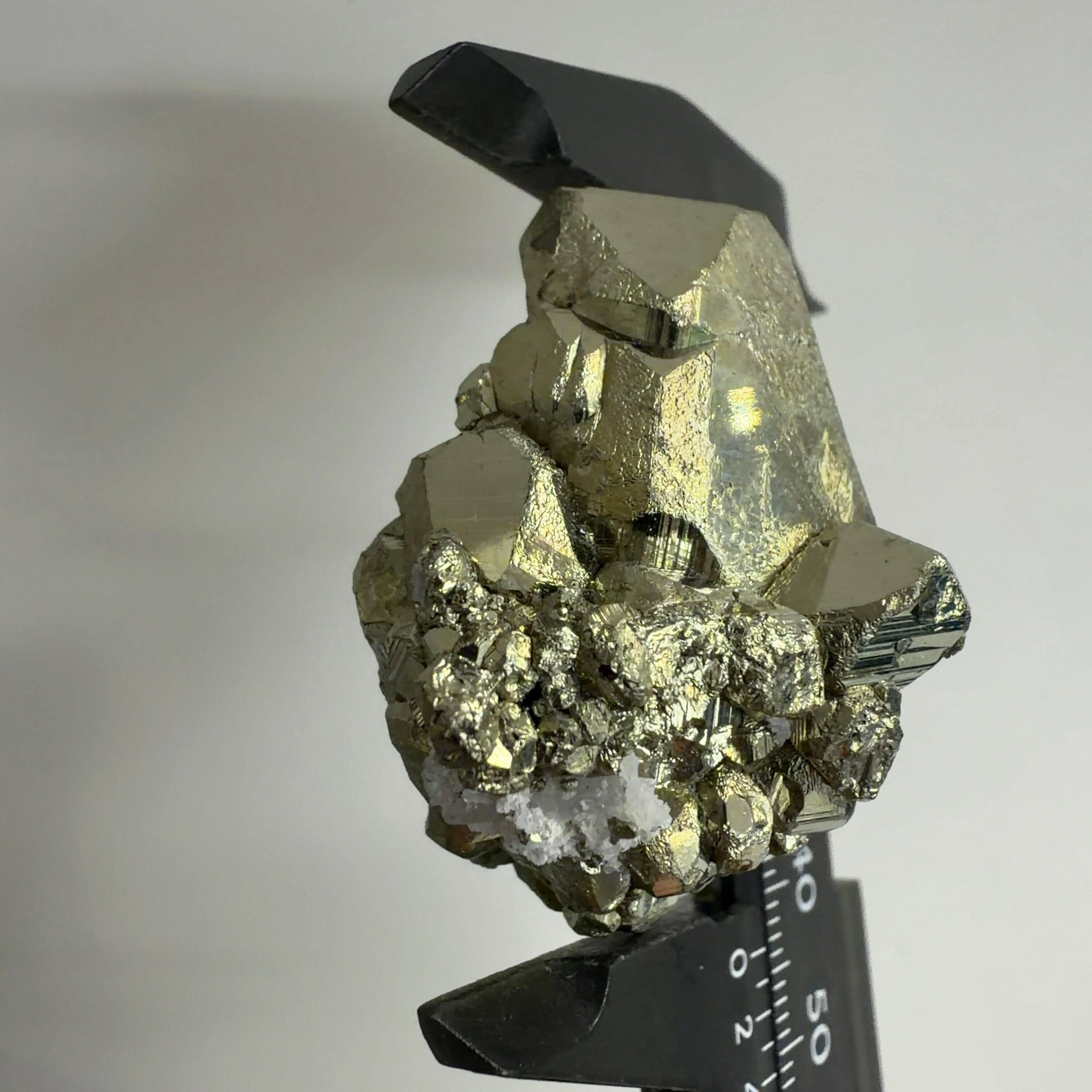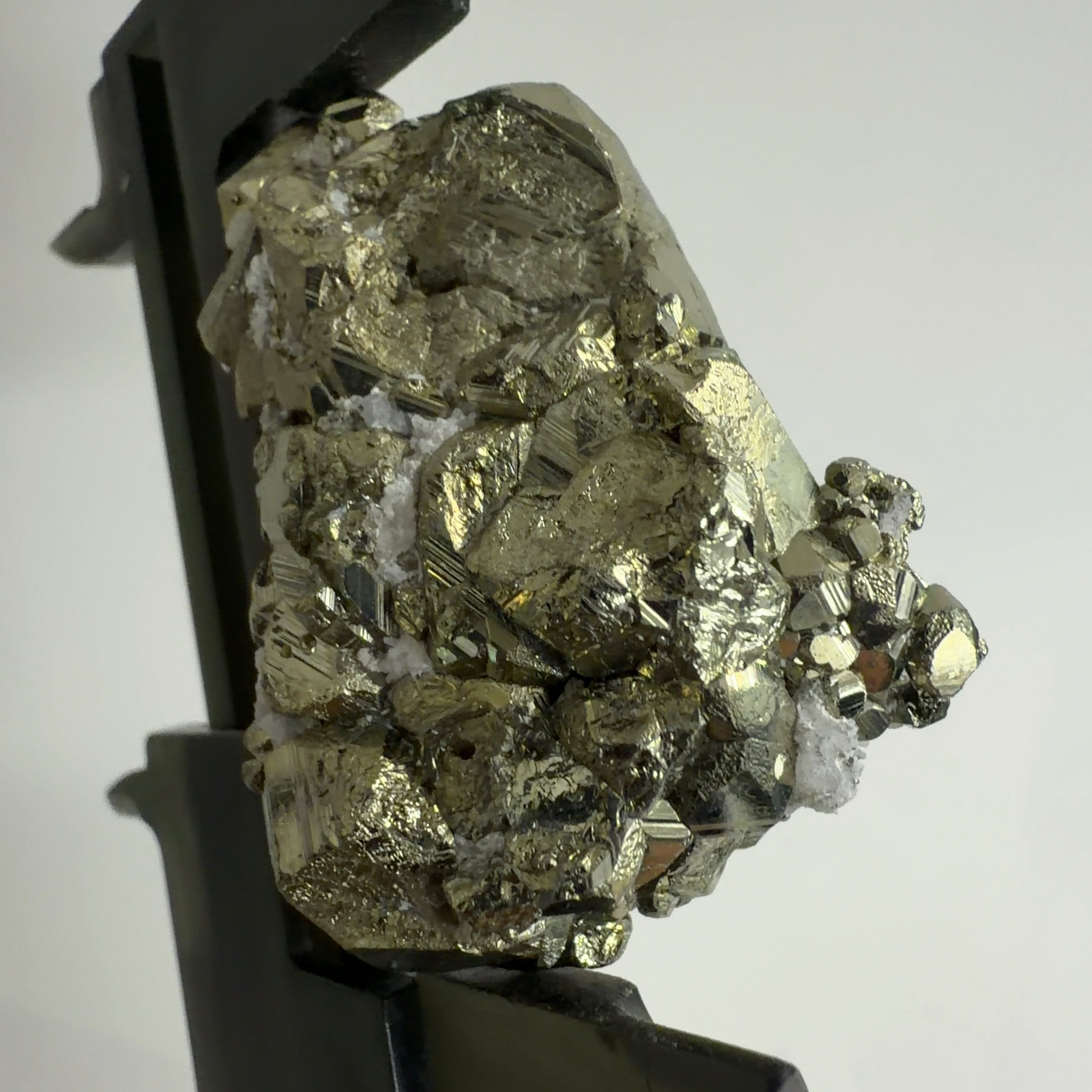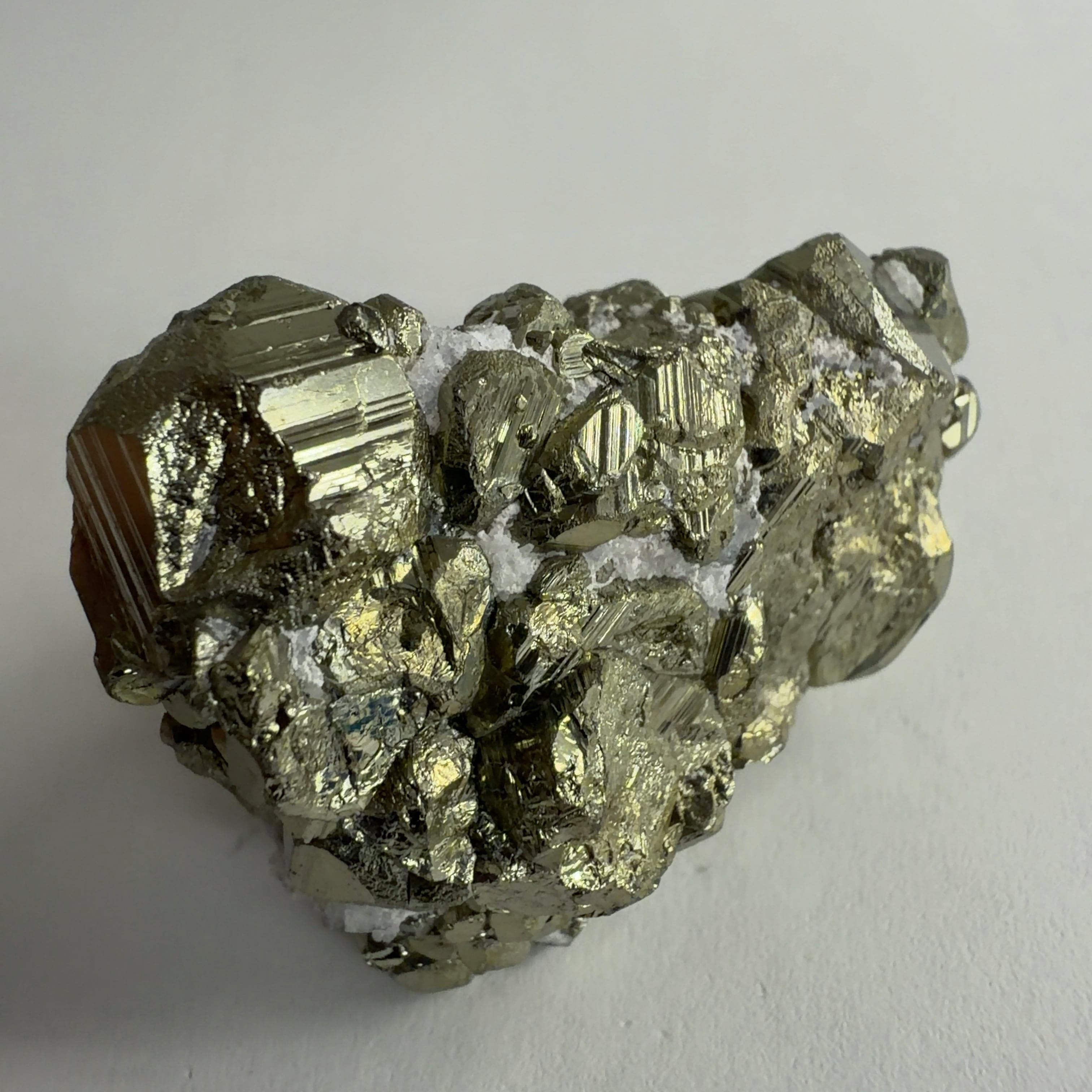 硫黄と鉄の化合物。黄金色の美しい光沢および、立方体、五画十二面体、八面体、二十四面体、又はそれらが合わさった形など様々な結晶をするので標本として人気があります。