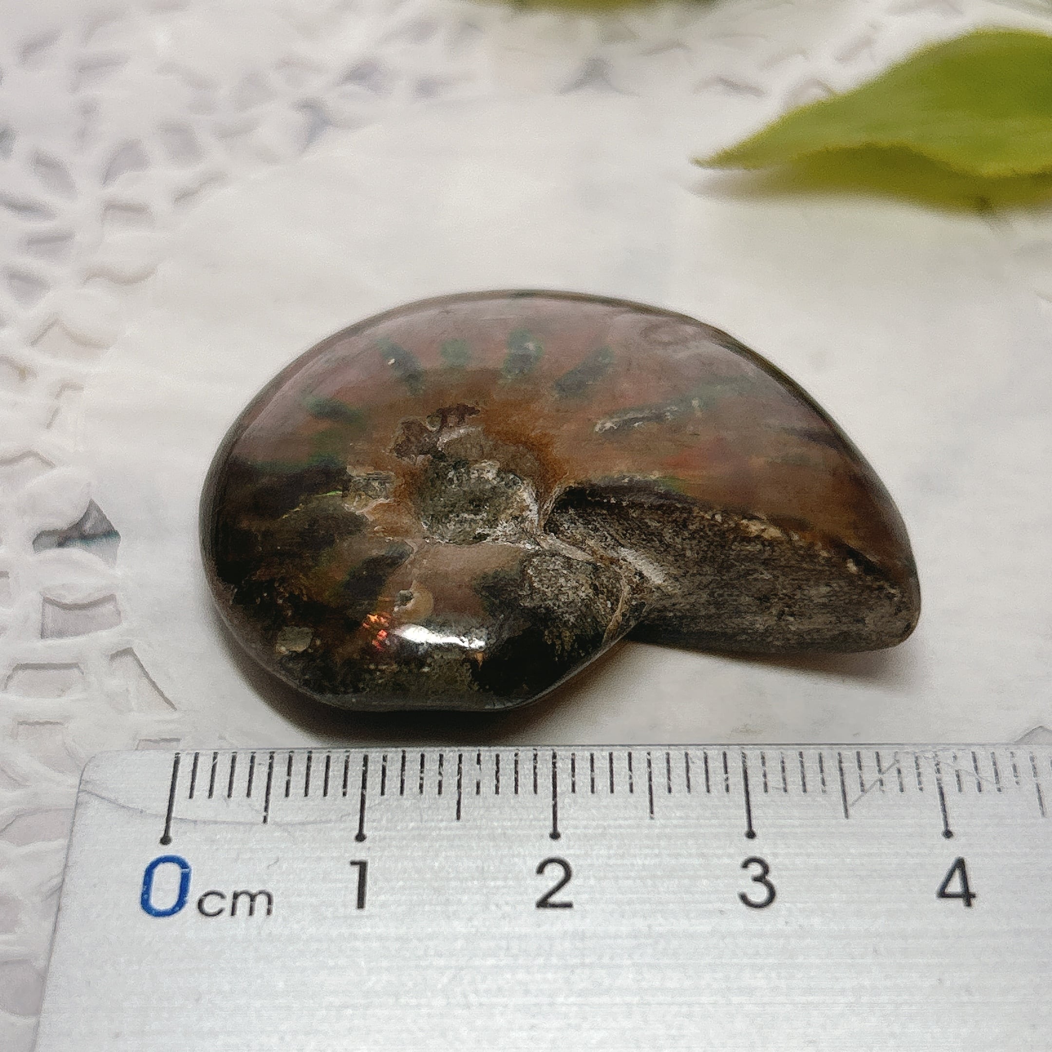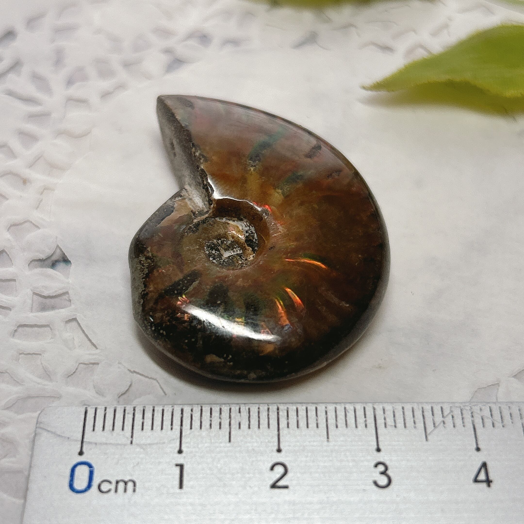 強い赤色の閃光(ファイヤー)を放っているのは、地層中の酸化鉄や珪酸がアンモナイトの殻の表面に薄く付着し、細かなひび割れの部分がオパールのような遊色を浮き出させるため。