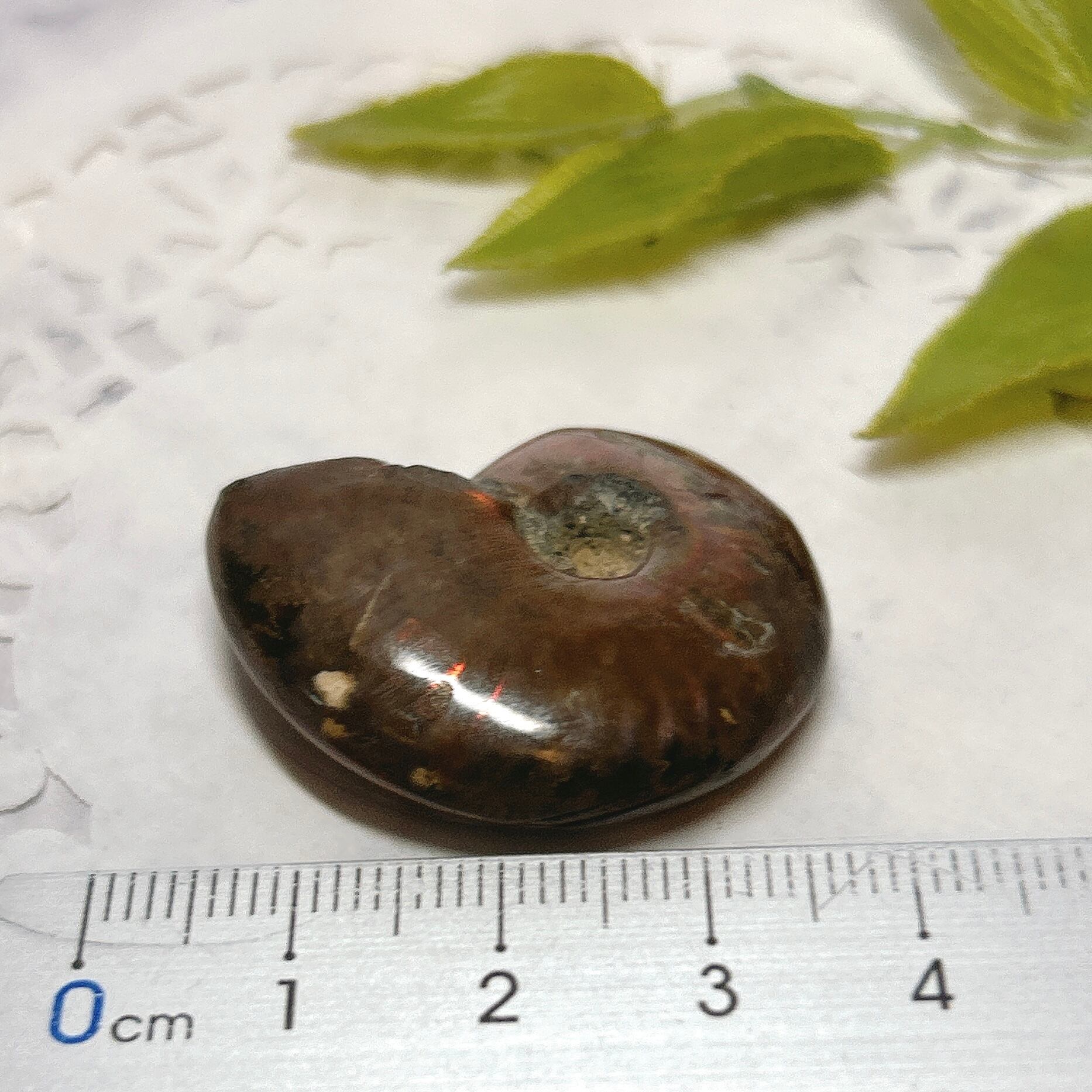 強い赤色の閃光(ファイヤー)を放っているのは、地層中の酸化鉄や珪酸がアンモナイトの殻の表面に薄く付着し、細かなひび割れの部分がオパールのような遊色を浮き出させるため。