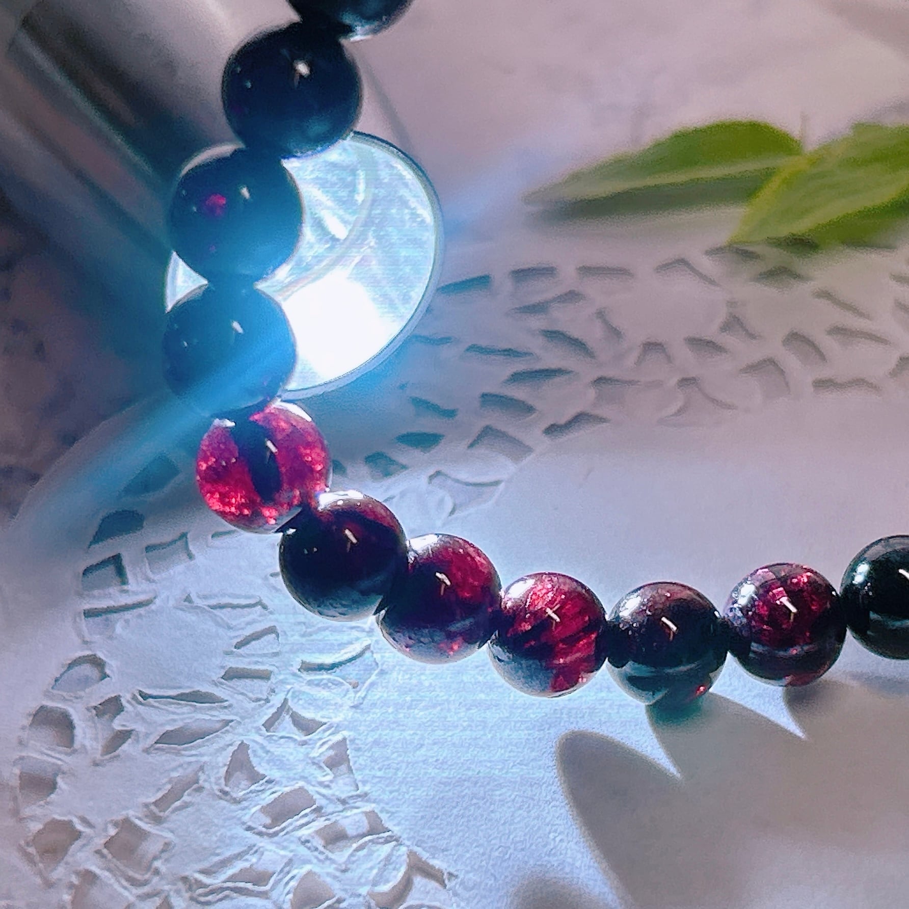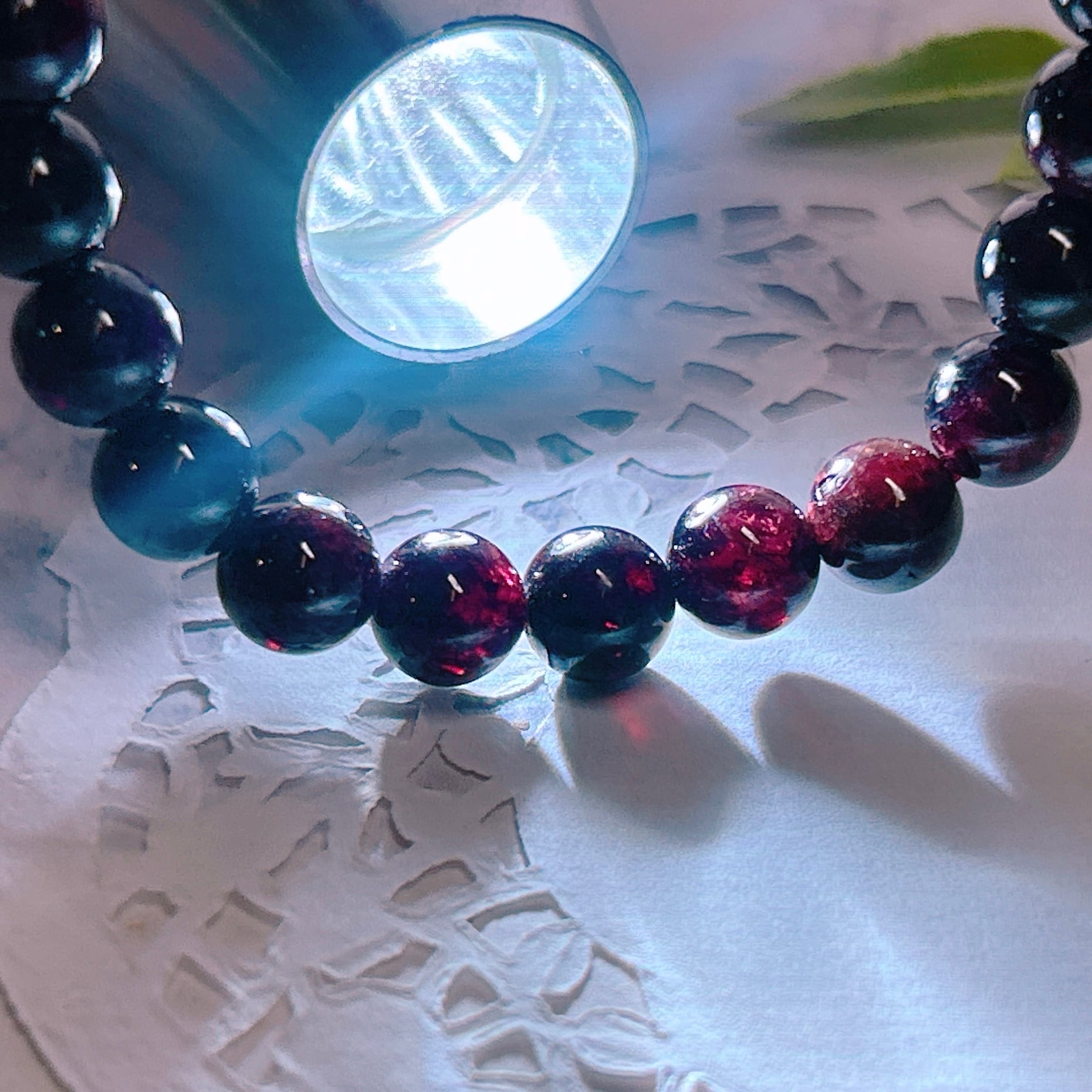 一見黒っぽく見えますが、光を当てると、ガーネット特有の赤色が観察できます。