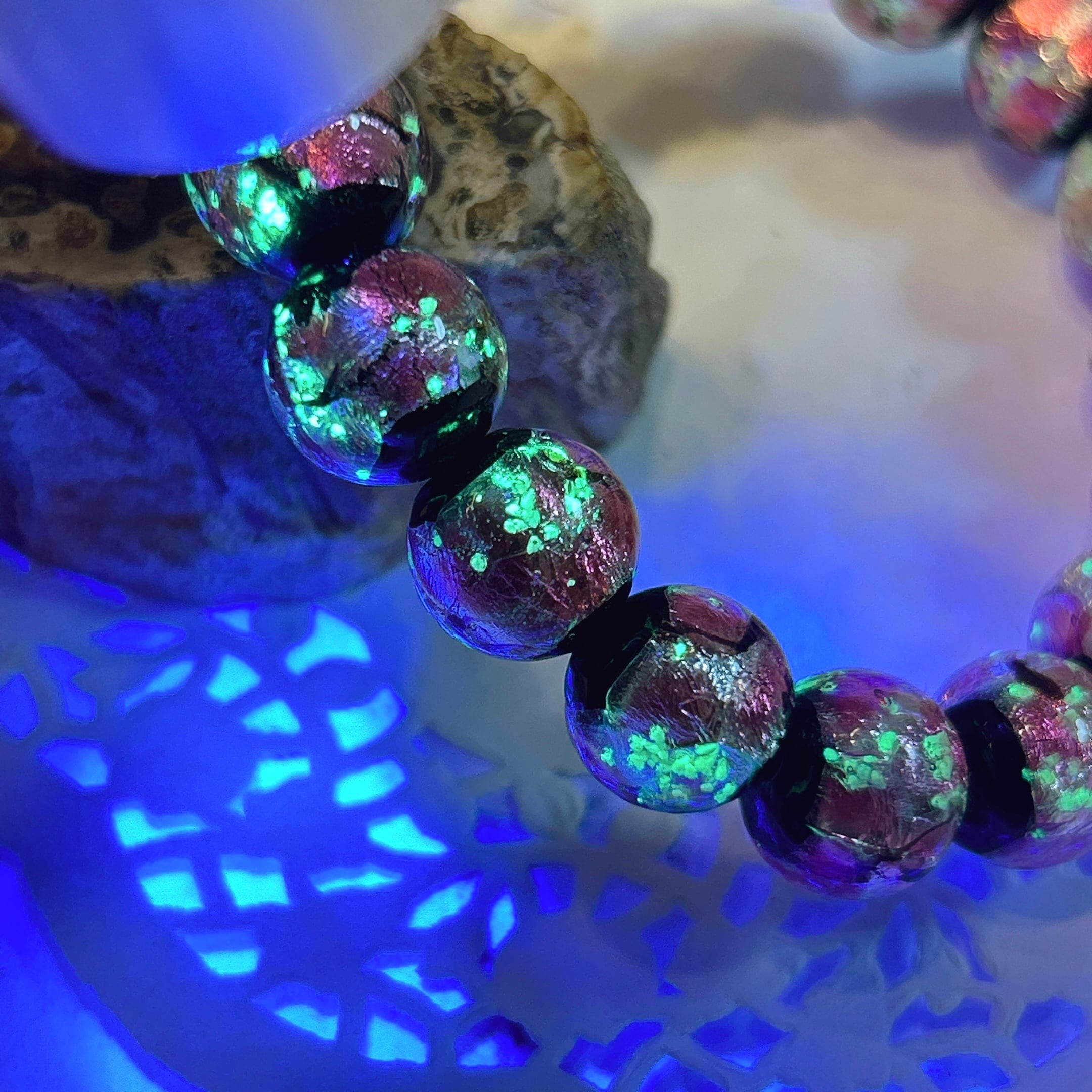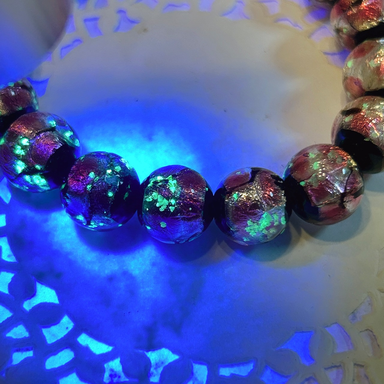 ピンクのビーズにブラックライトを当てると、緑の光が浮かび上がる不思議なホタルガラス。
