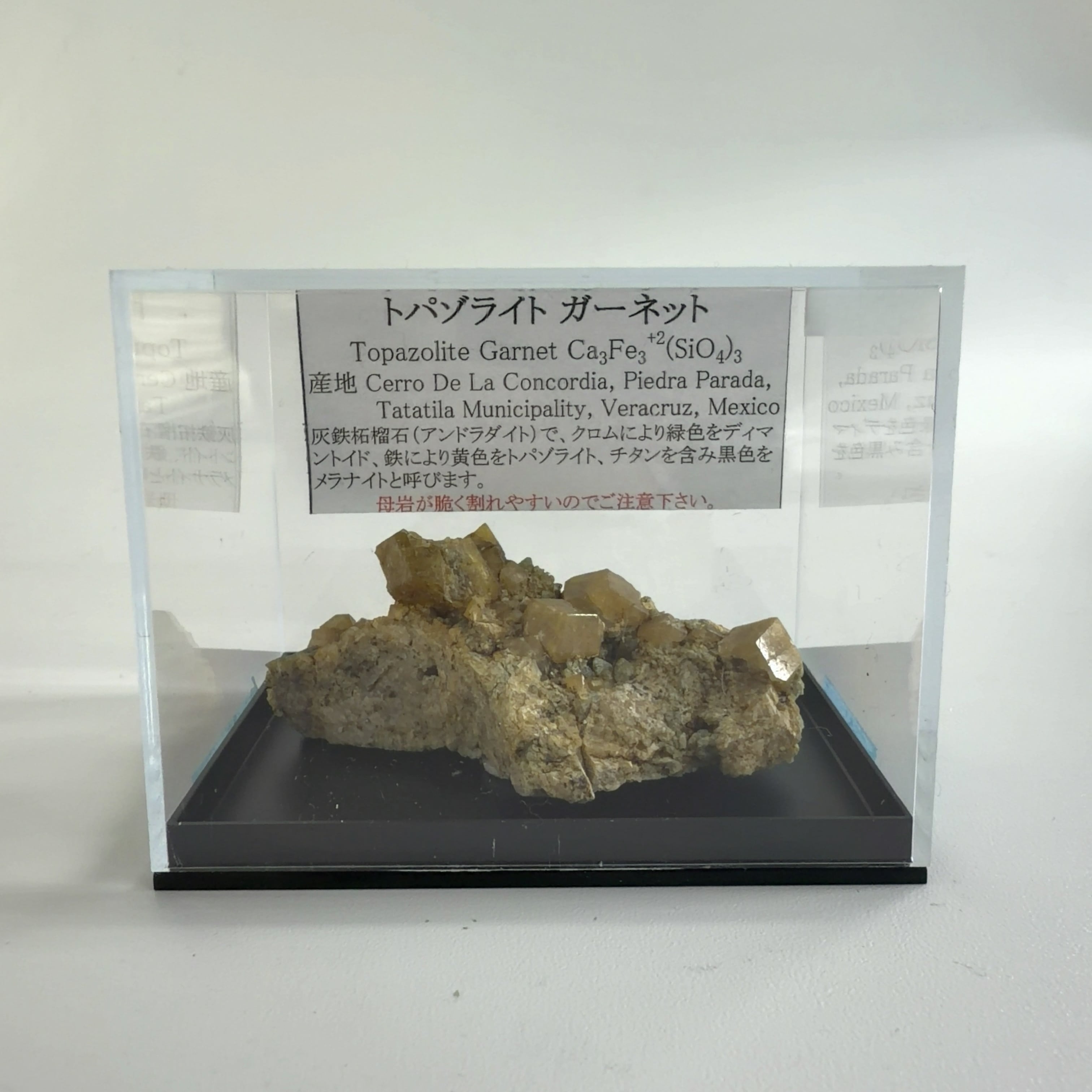 灰鉄柘榴石(アンドラダイト)で、クロムにより緑色をディマントイド、鉄により黄色をトパゾライト、チタンを含み黒色をメラナイトと呼びます。