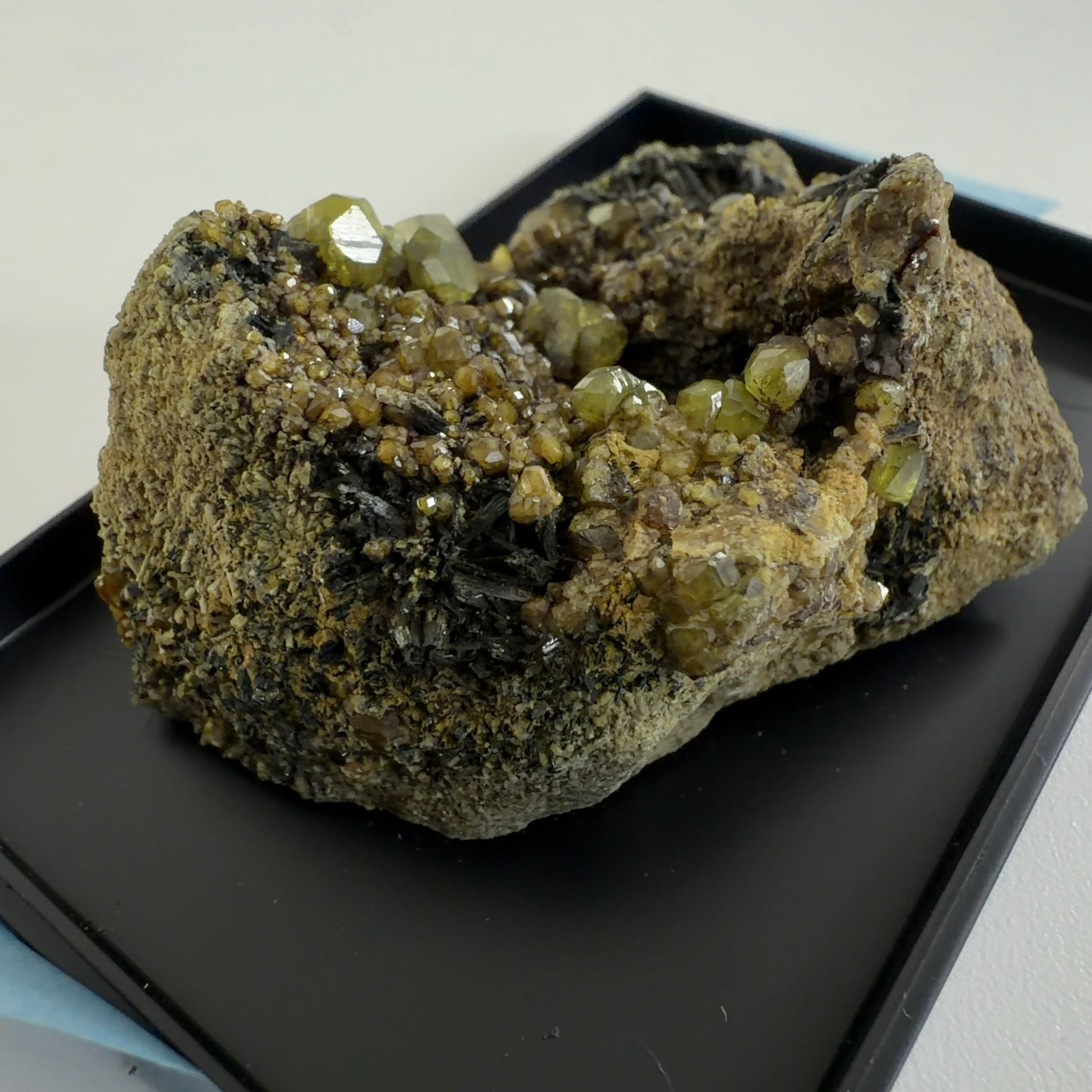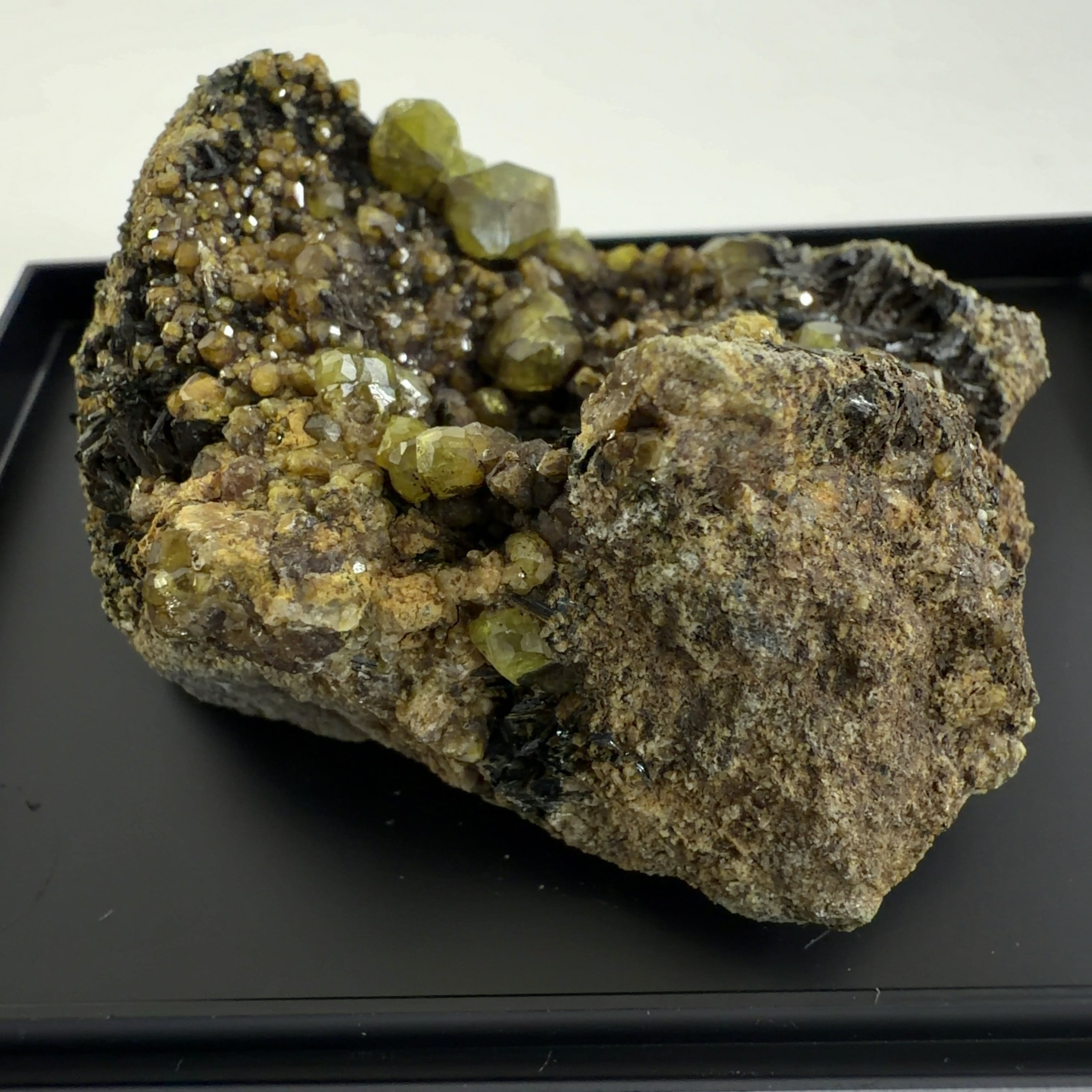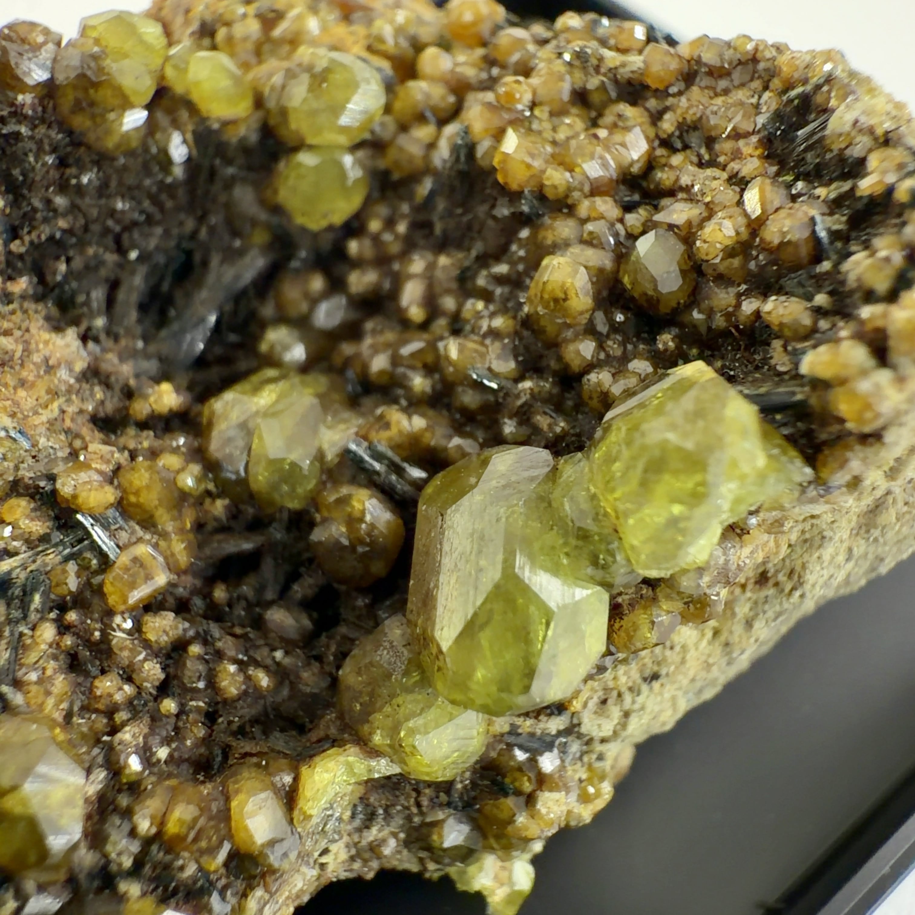 灰鉄柘榴石(アンドラダイト)で、クロムにより緑色をディマントイド、鉄により黄色をトパゾライト、チタンを含み黒色をメラナイトと呼びます。