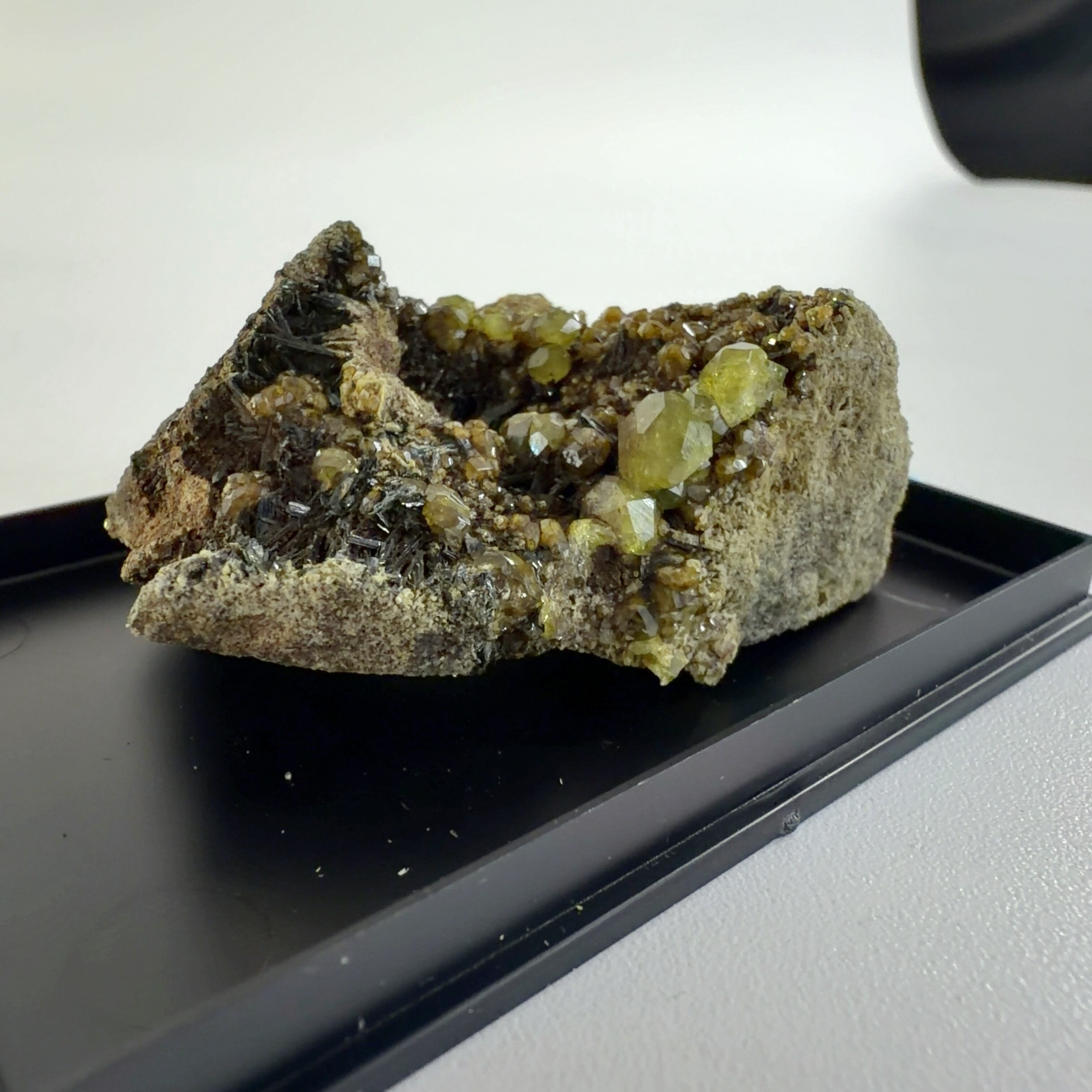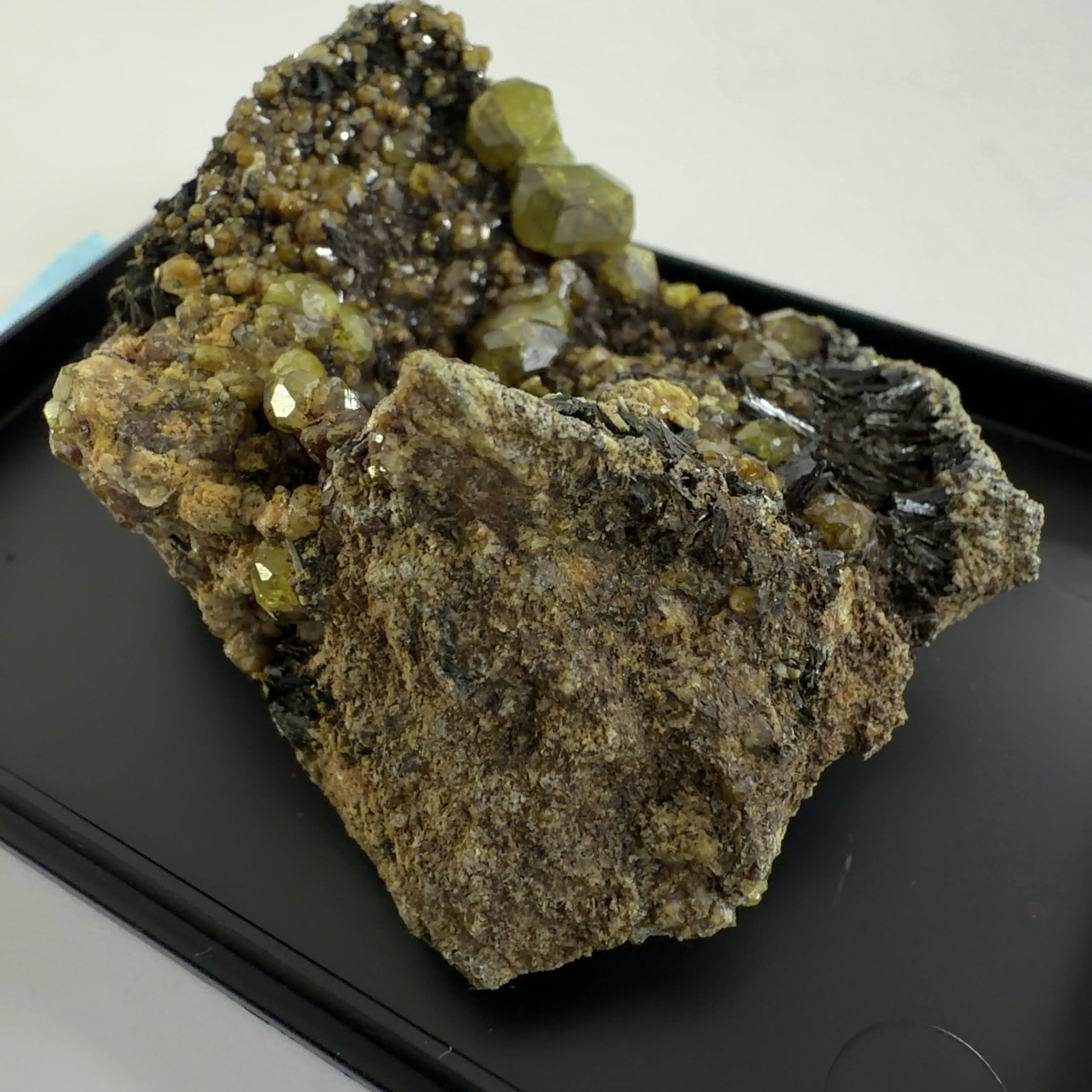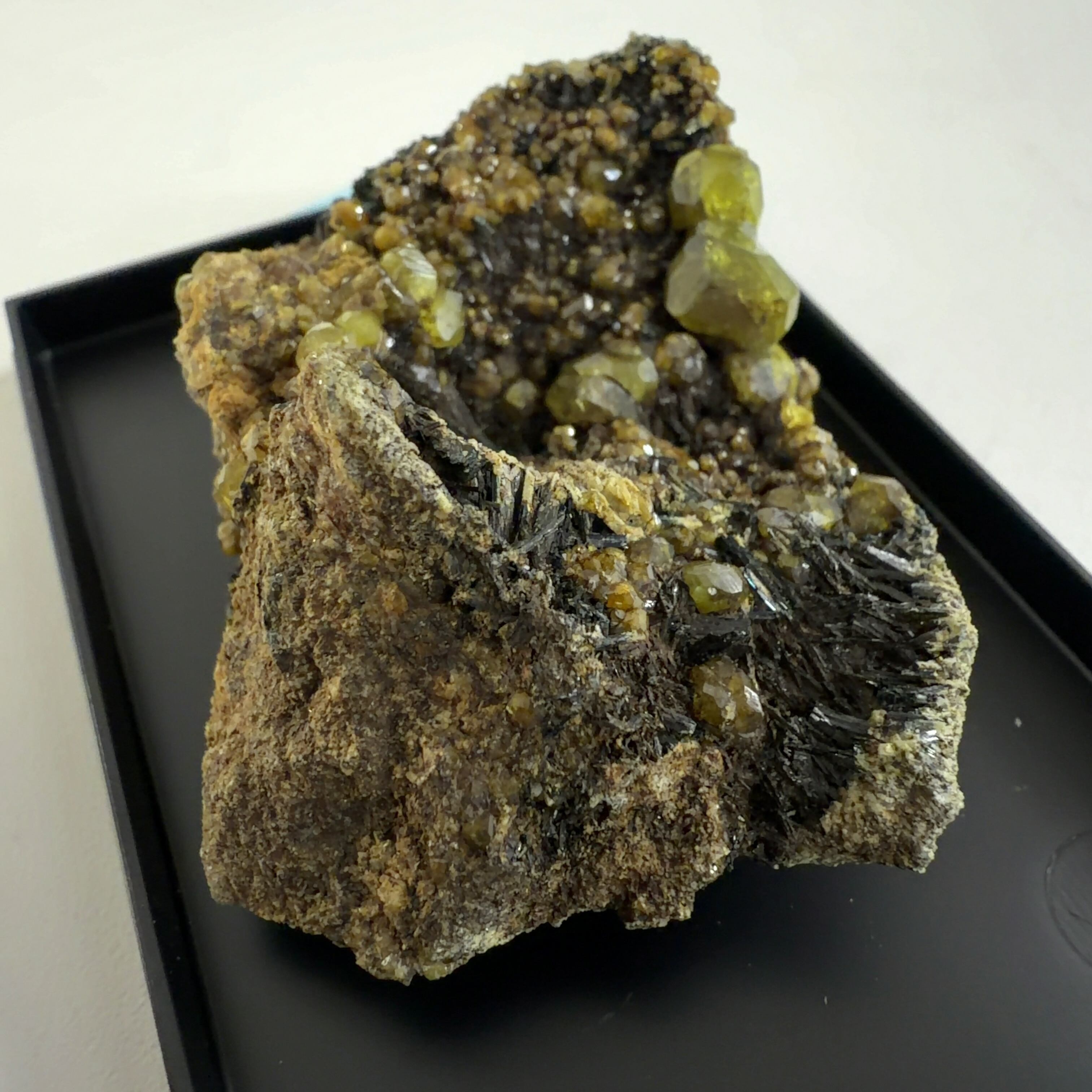灰鉄柘榴石(アンドラダイト)で、クロムにより緑色をディマントイド、鉄により黄色をトパゾライト、チタンを含み黒色をメラナイトと呼びます。