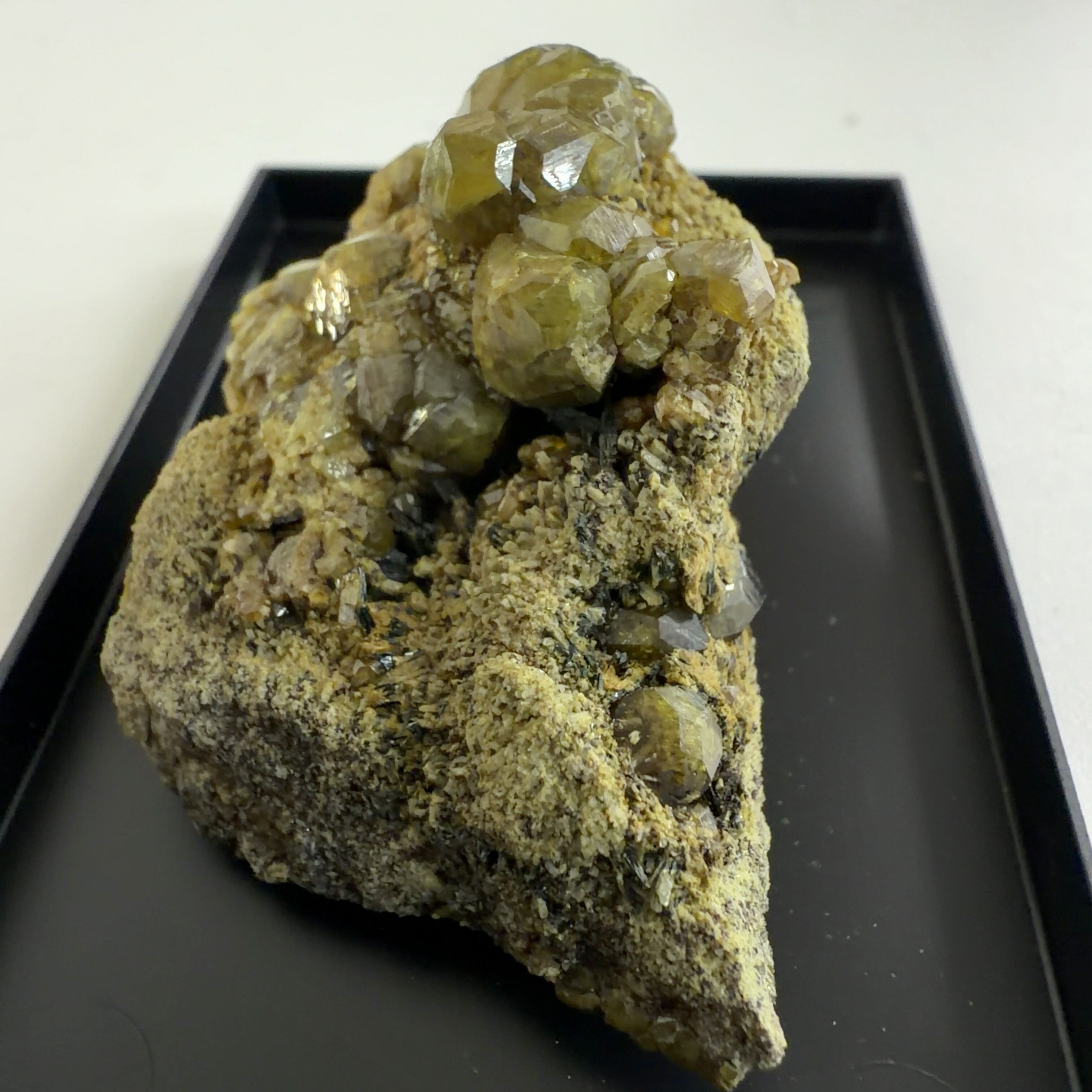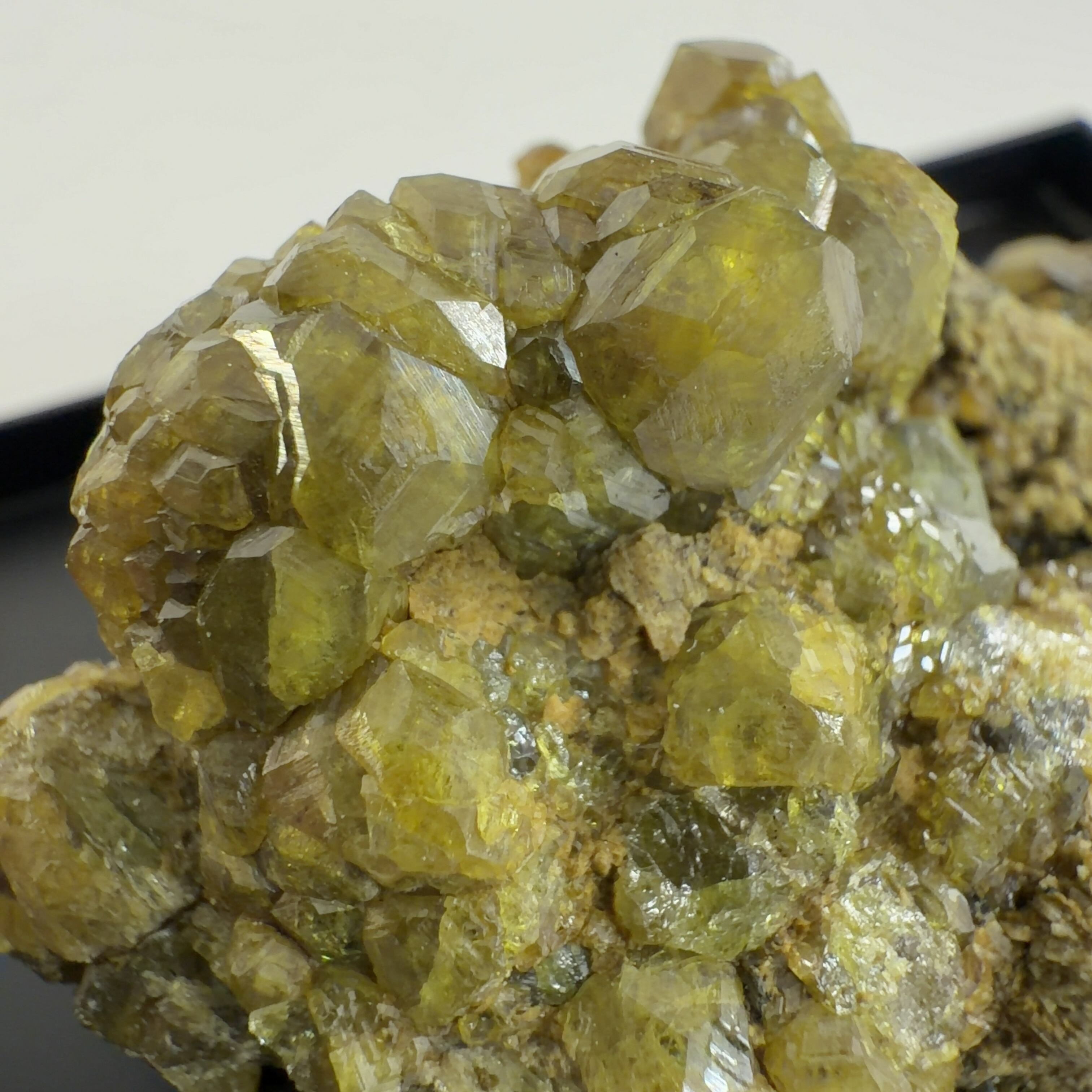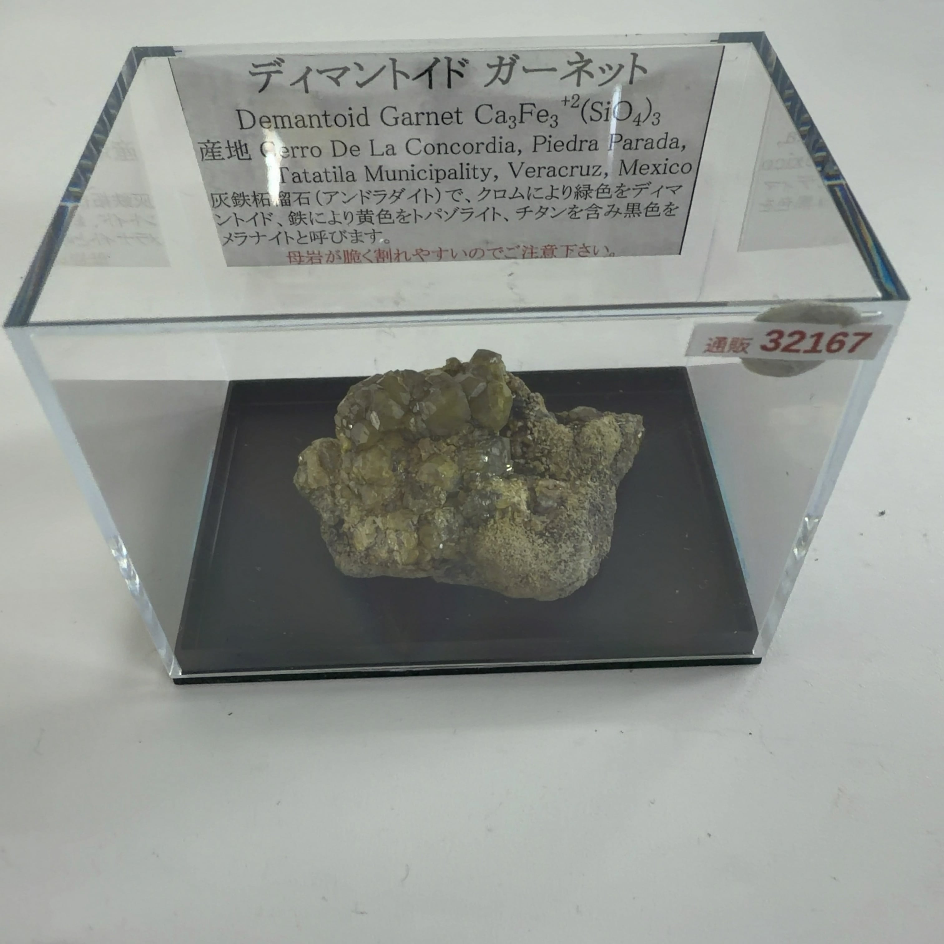 灰鉄柘榴石(アンドラダイト)で、クロムにより緑色をディマントイド、鉄により黄色をトパゾライト、チタンを含み黒色をメラナイトと呼びます。