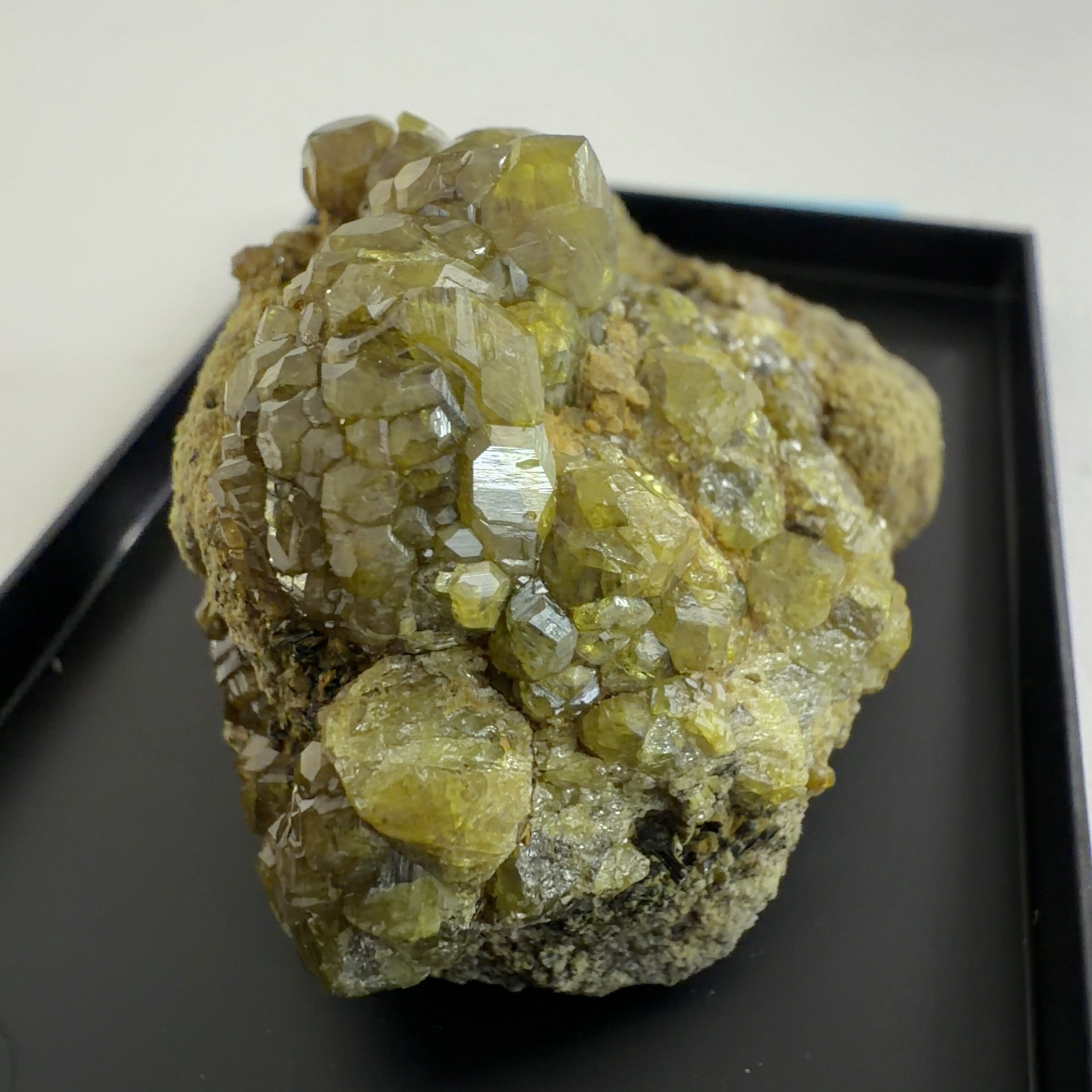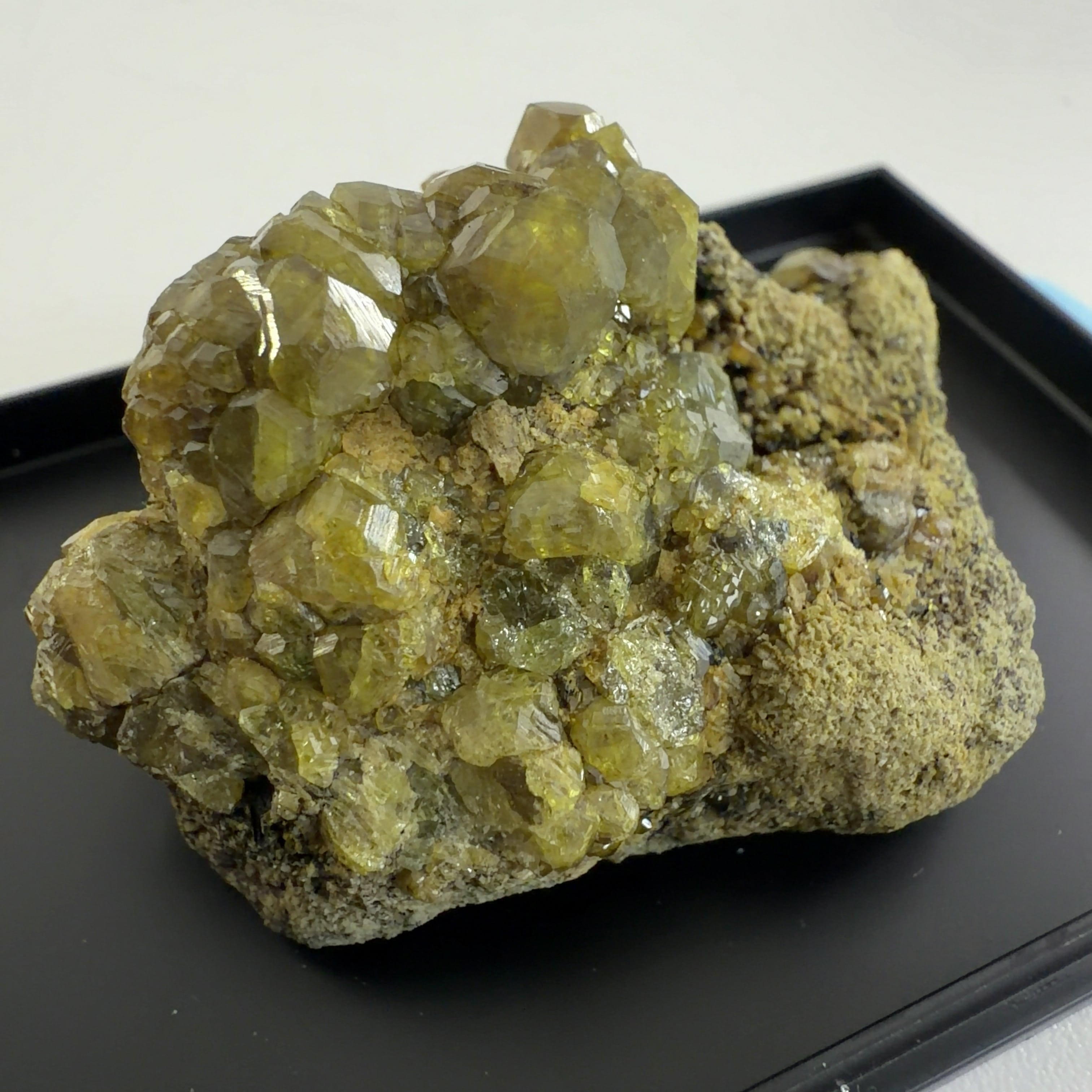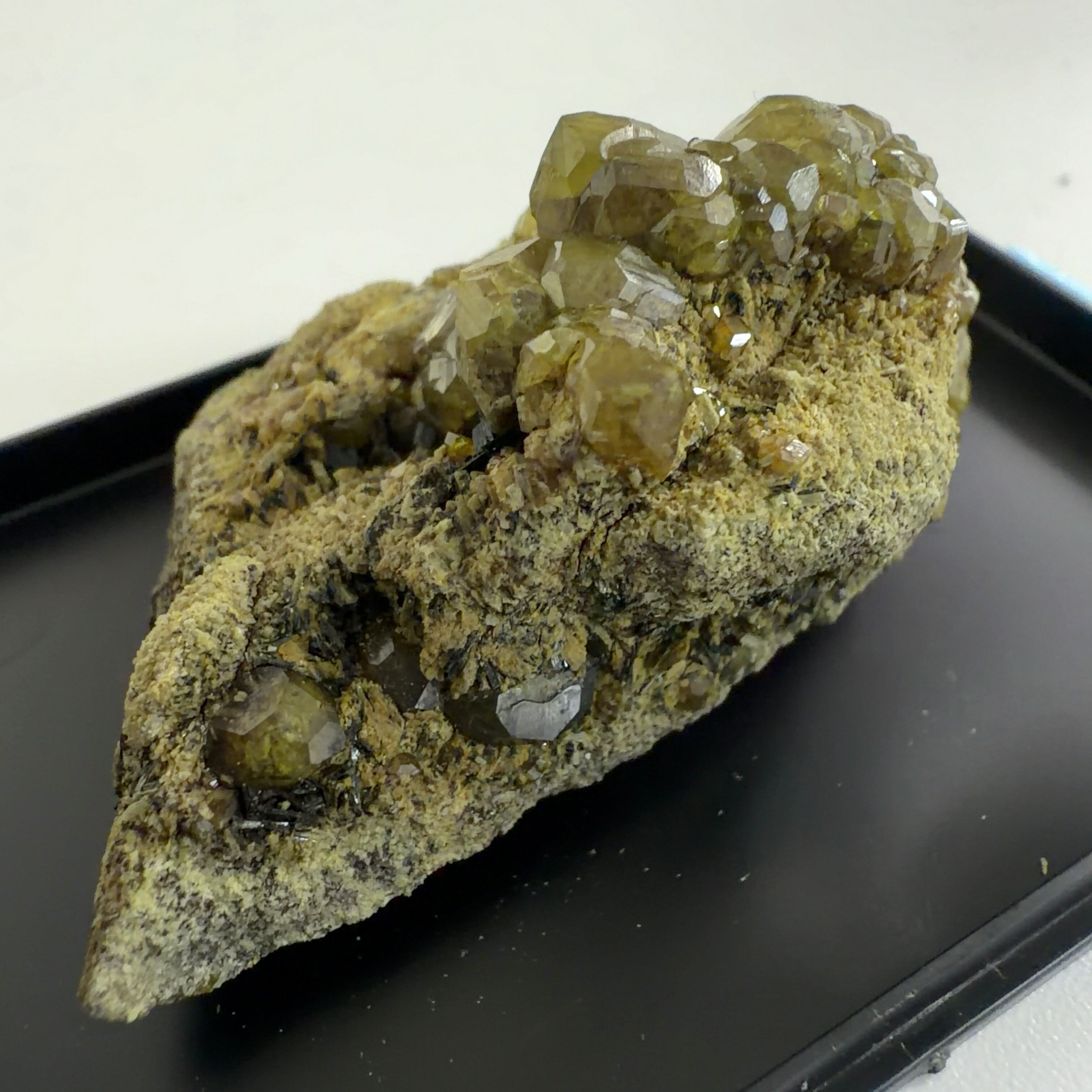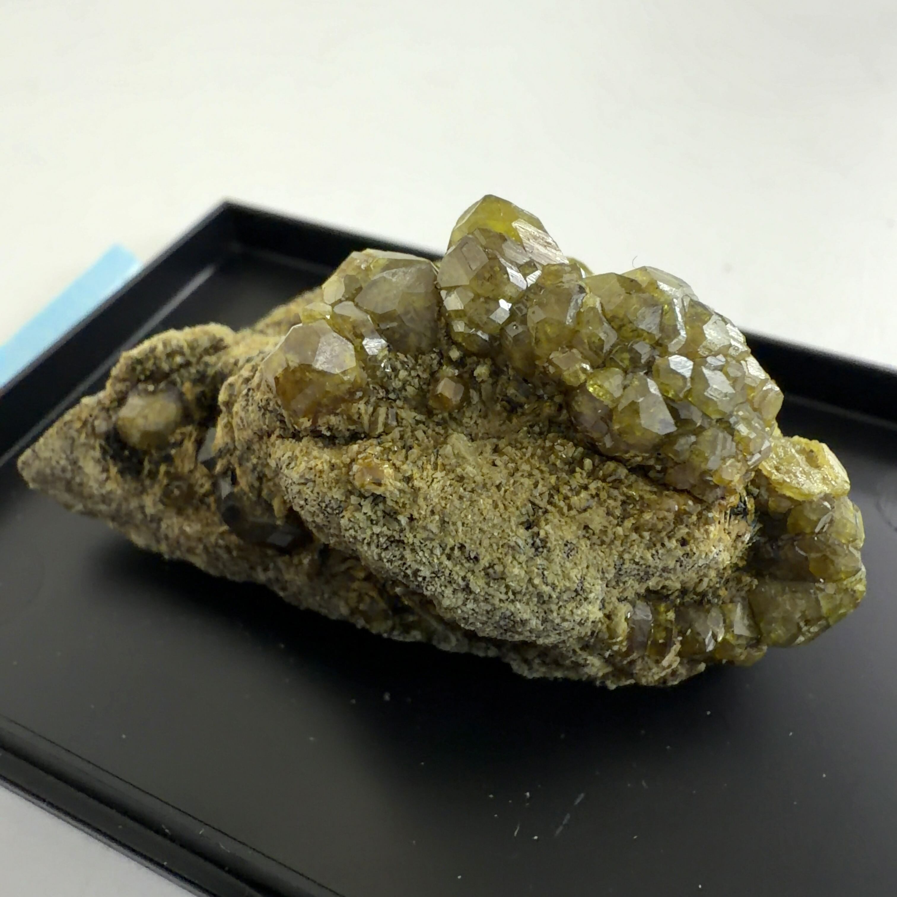 灰鉄柘榴石(アンドラダイト)で、クロムにより緑色をディマントイド、鉄により黄色をトパゾライト、チタンを含み黒色をメラナイトと呼びます。