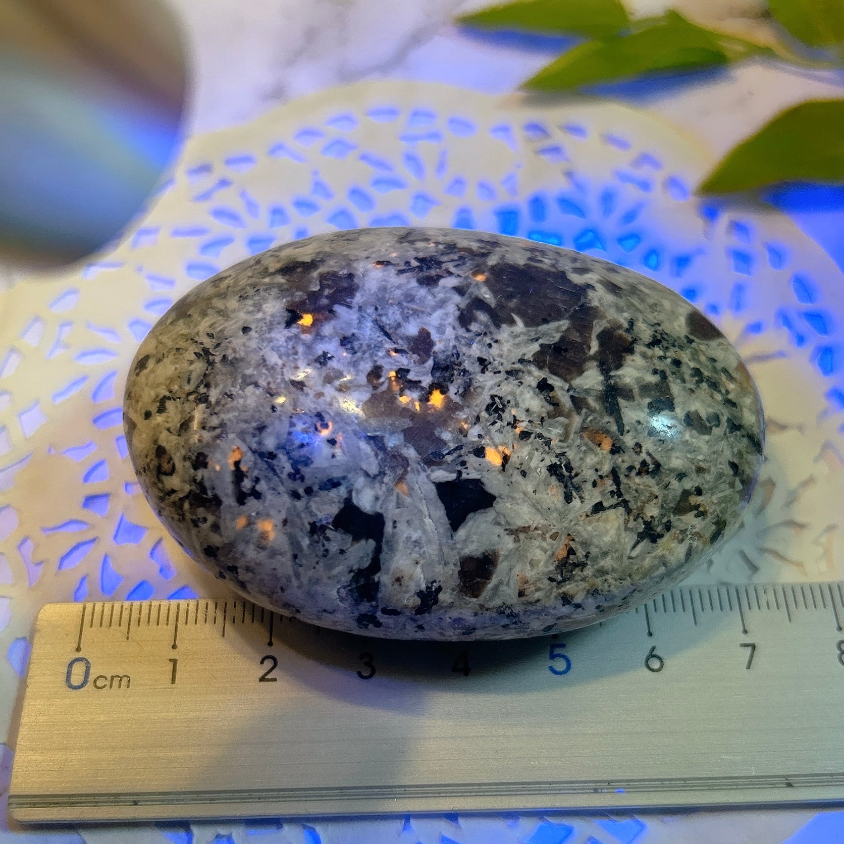 また、カリフォルニアの地質学者であり蛍光性鉱物の収集家でもあるゲイブ・レイナ(Gabe Reyna)が、含まれる蛍光性鉱物が方ソーダ石(sodalite、ソーダライト)であることを明らかにしました。