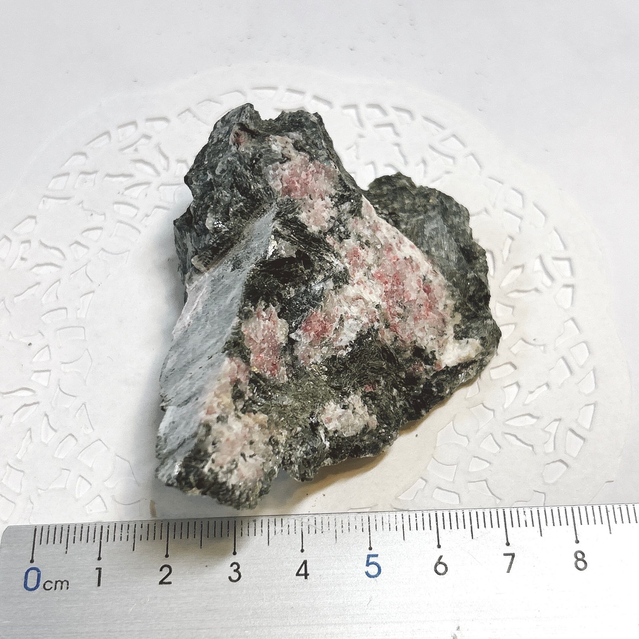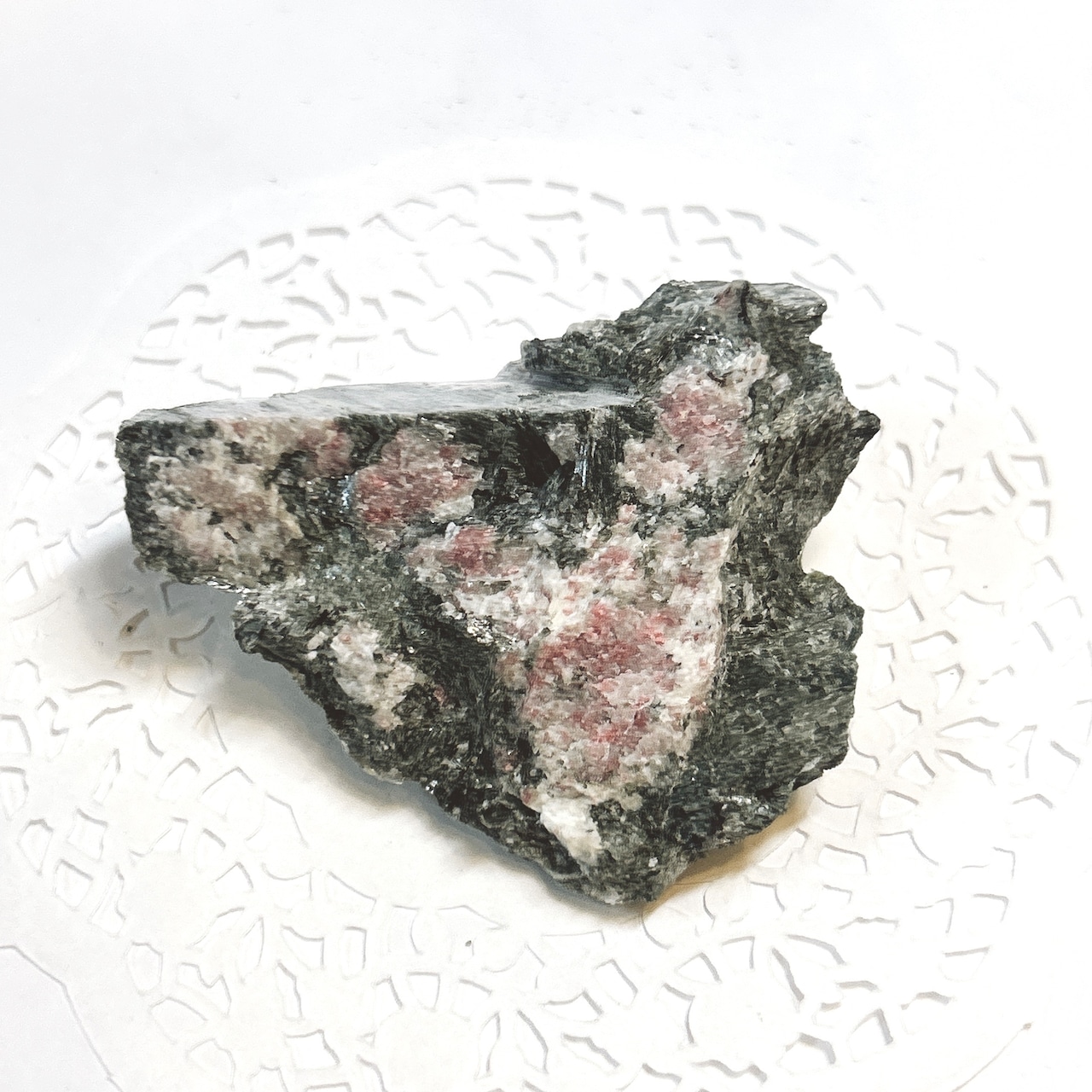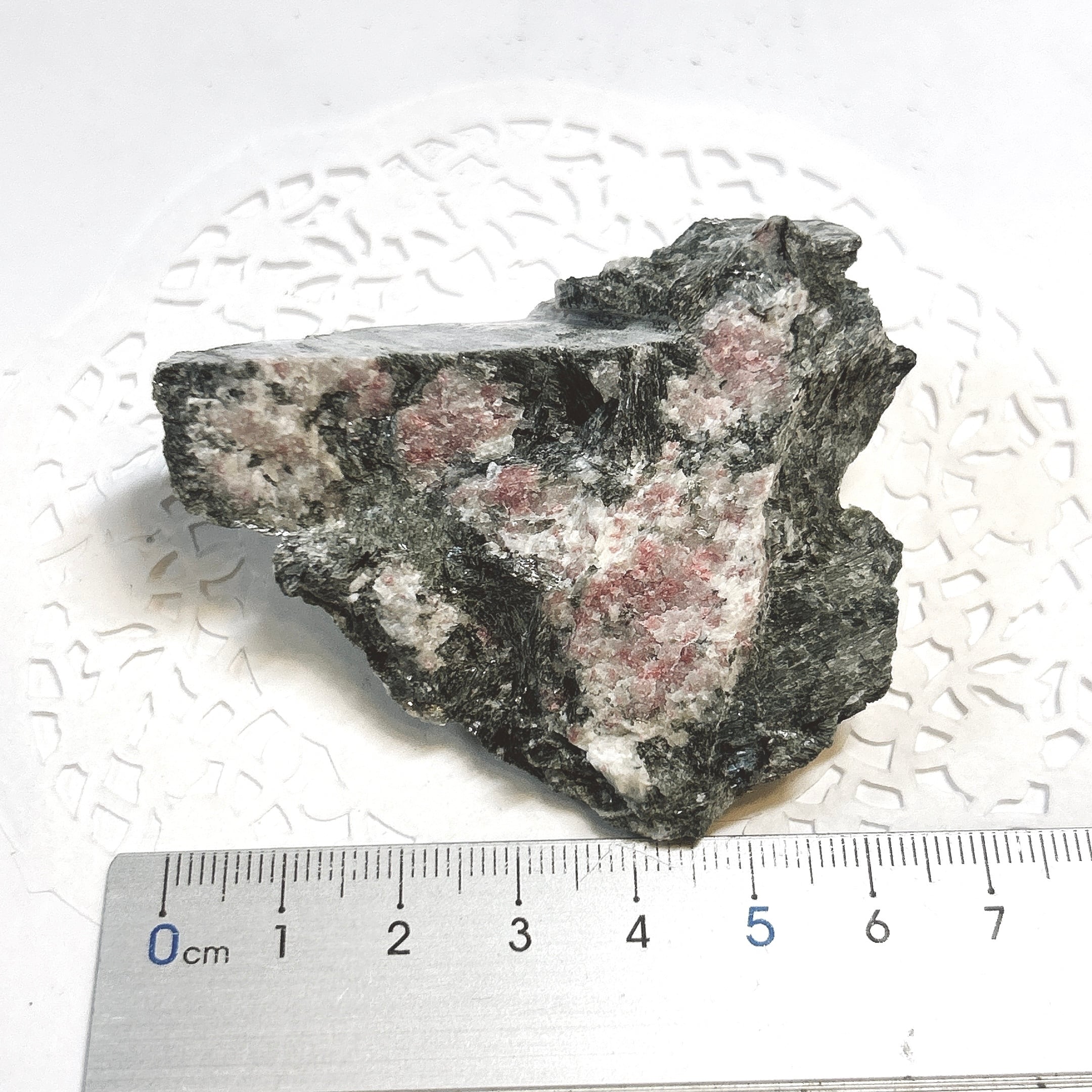 灰簾石の一種で、マンガンを含んで、ピンク色になったものをチューライトといいます。