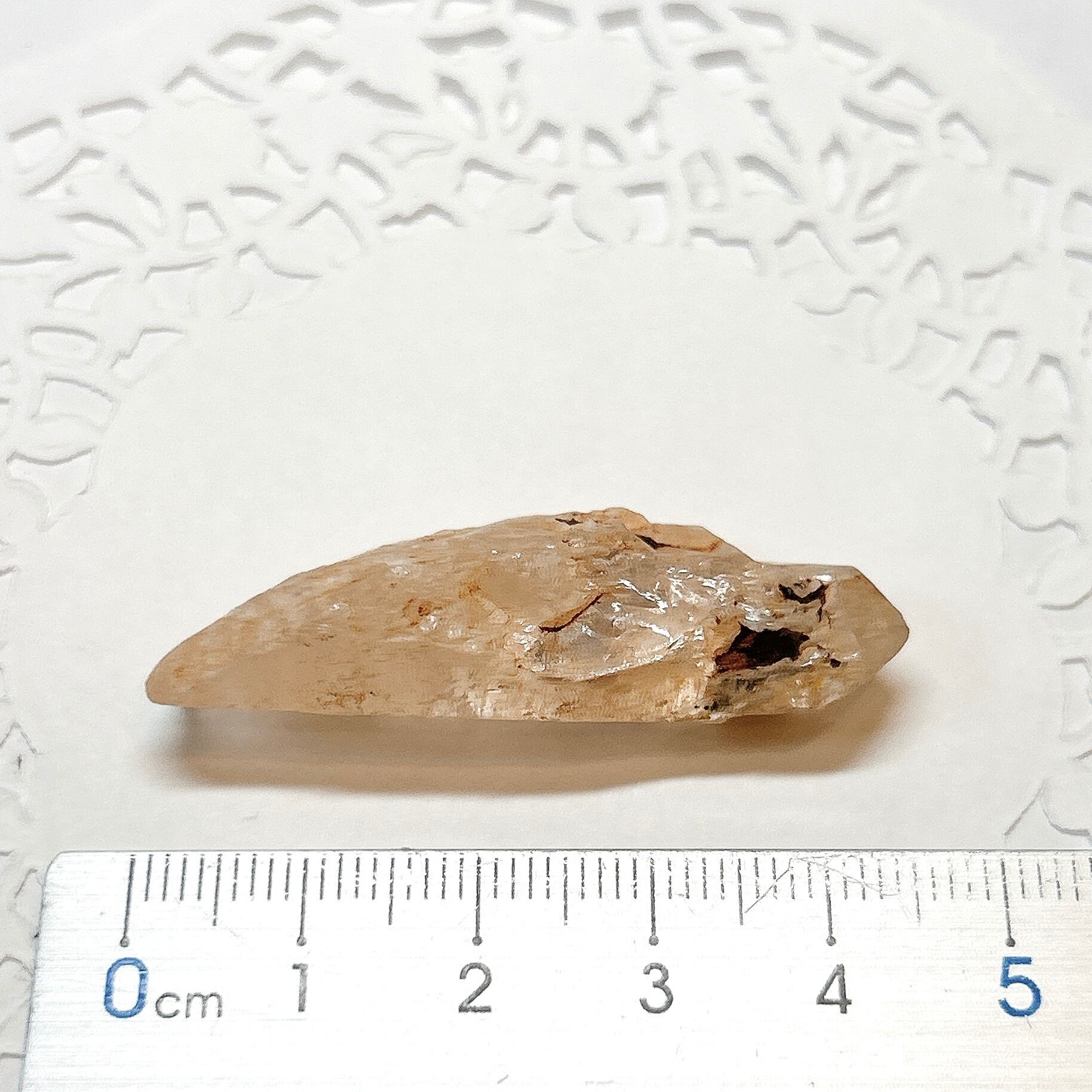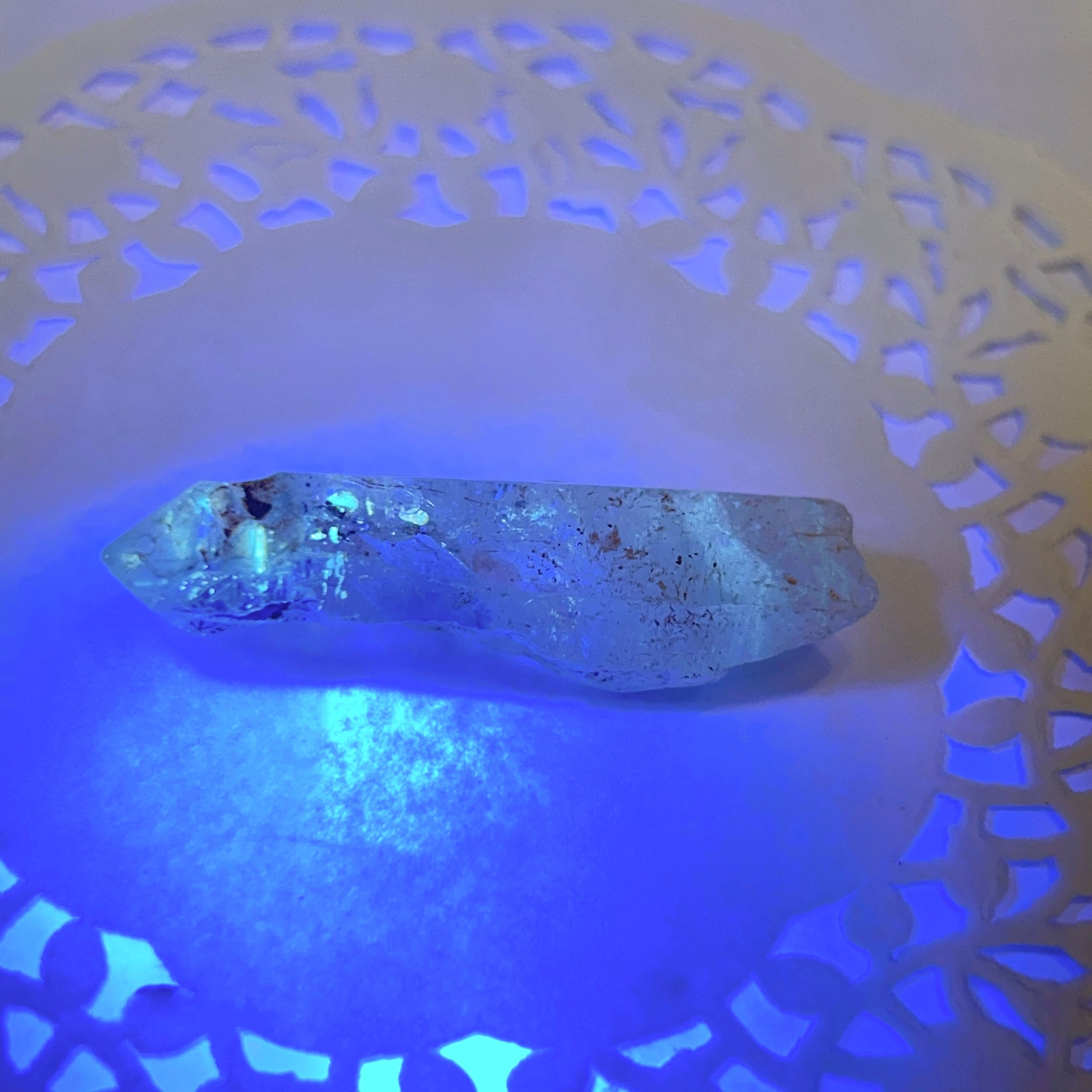 長波紫外線ライトを照射する事により、黄色や青白く蛍光します。2023年にマダガスカルで水晶の品質がよく、蛍光も非常によくわかる良品が発見されました。