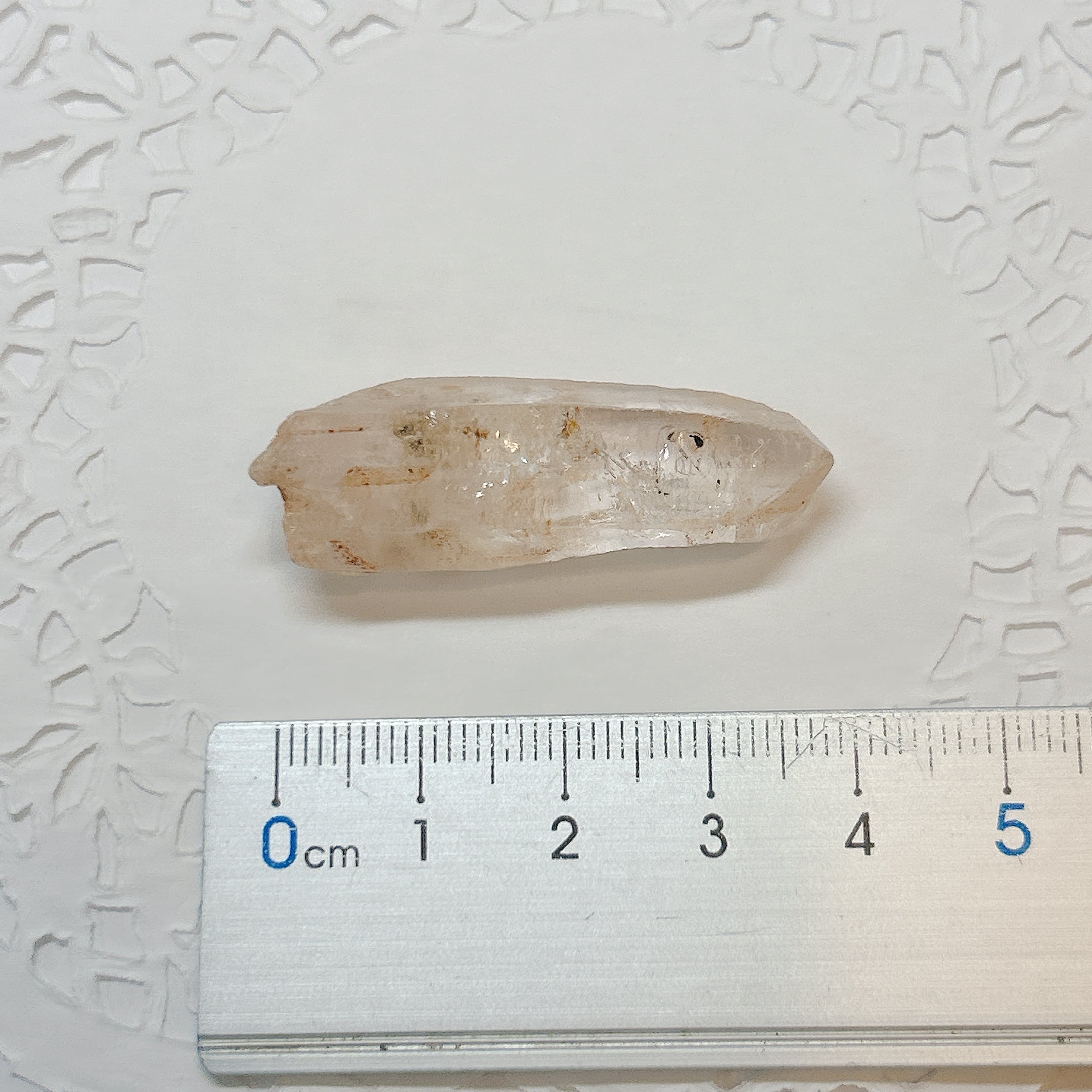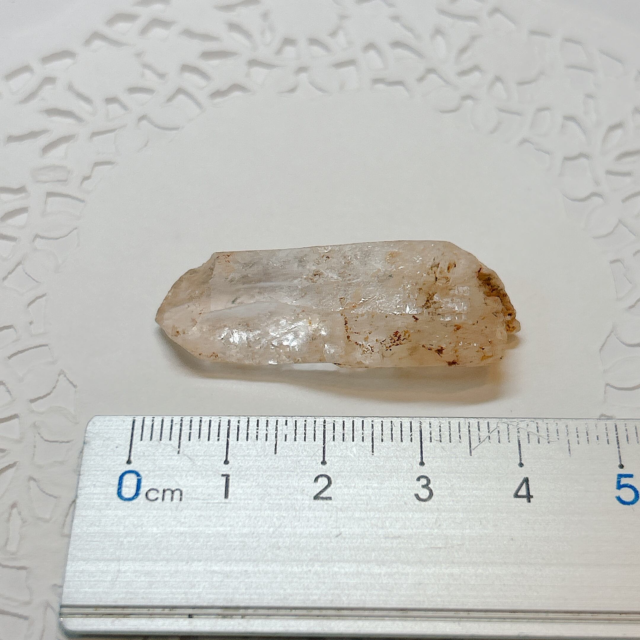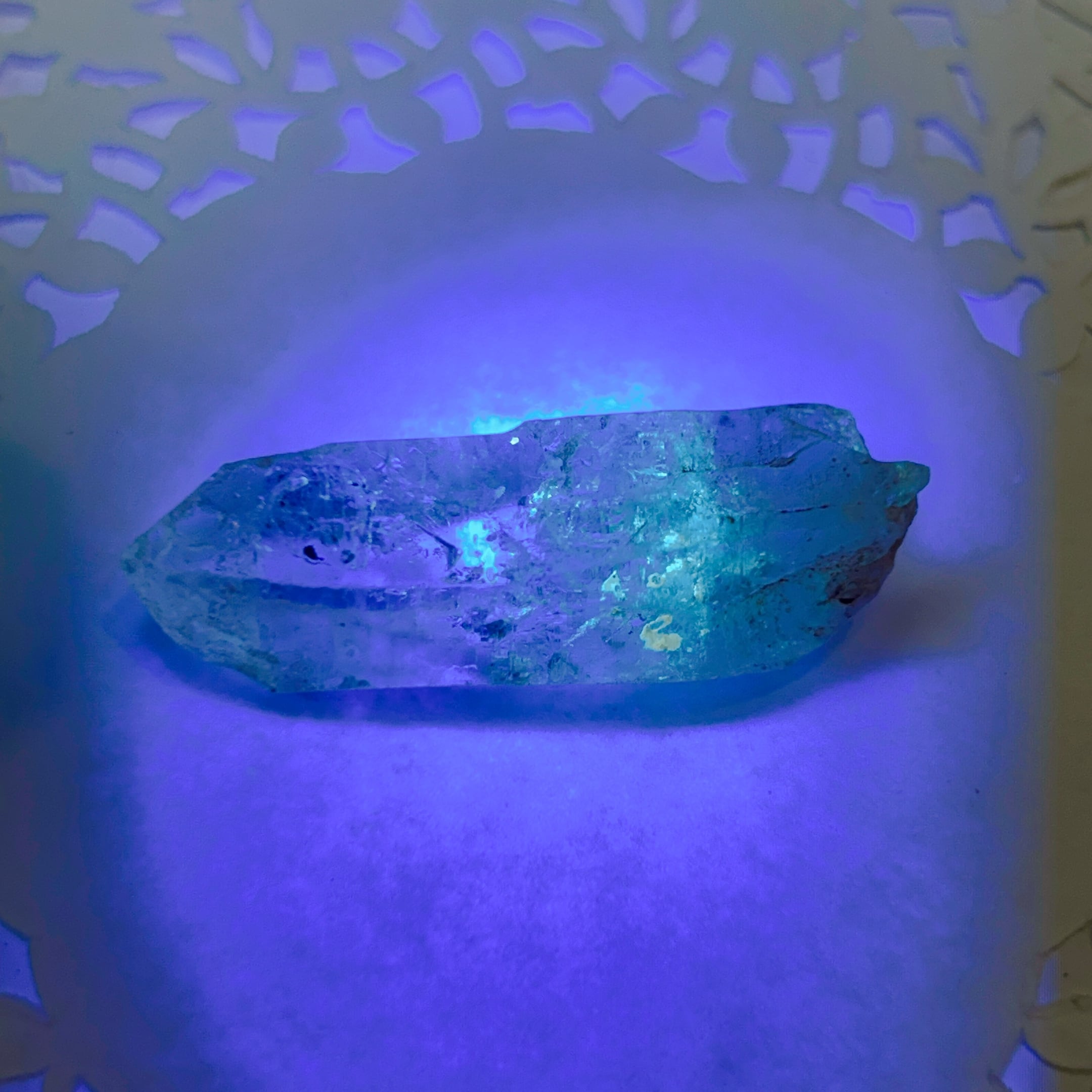 長波紫外線ライトを照射する事により、黄色や青白く蛍光します。2023年にマダガスカルで水晶の品質がよく、蛍光も非常によくわかる良品が発見されました。