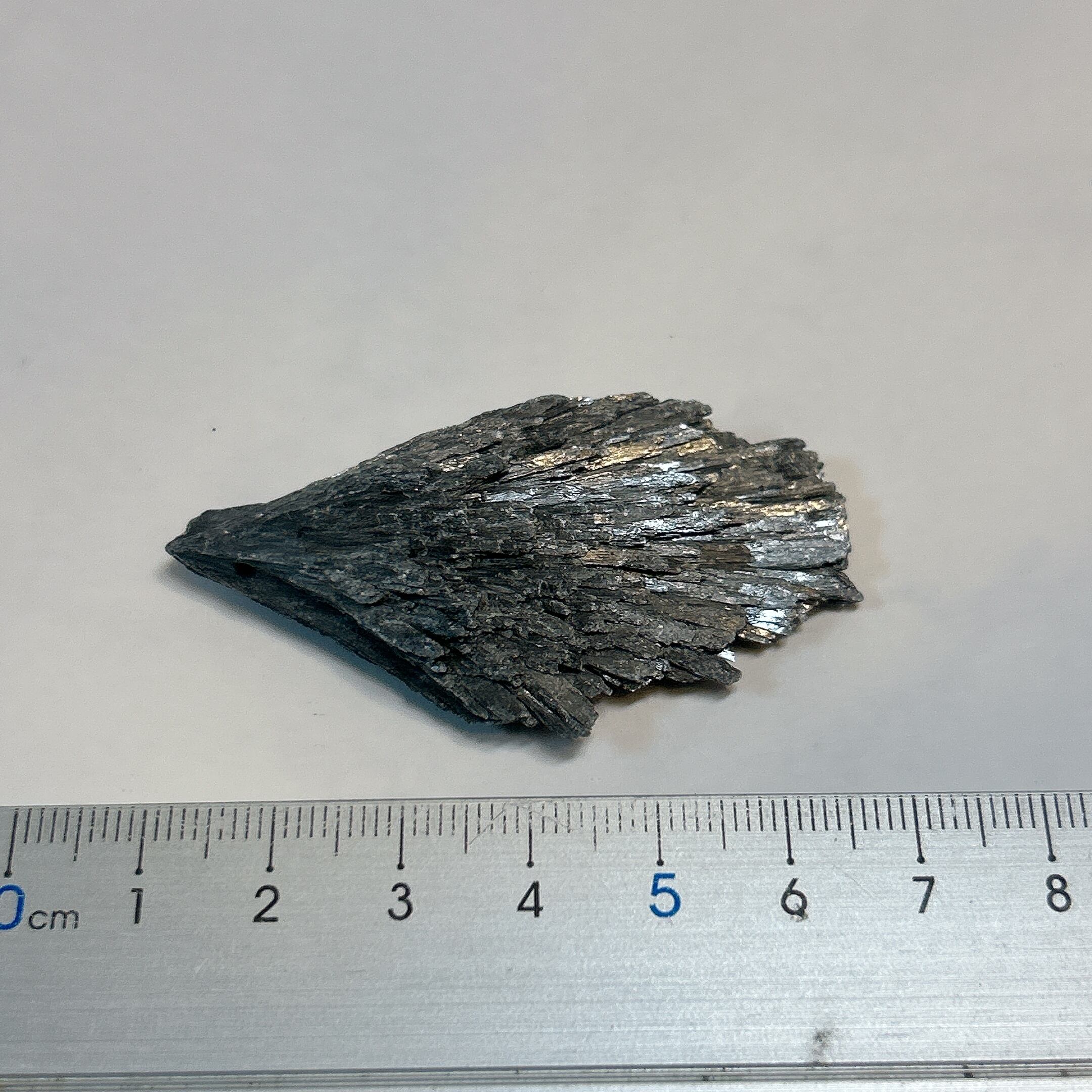 和名は「らんしょうせき」。アルミのケイ酸塩鉱物。向きによってモース硬度が異なる性質(二硬性)を示す。微量に含まれる成分によって、青、緑、橙、黒などの色があります。扇状の形から”Vassoura de Bruxa”(魔女のほうき)とも呼ばれています。