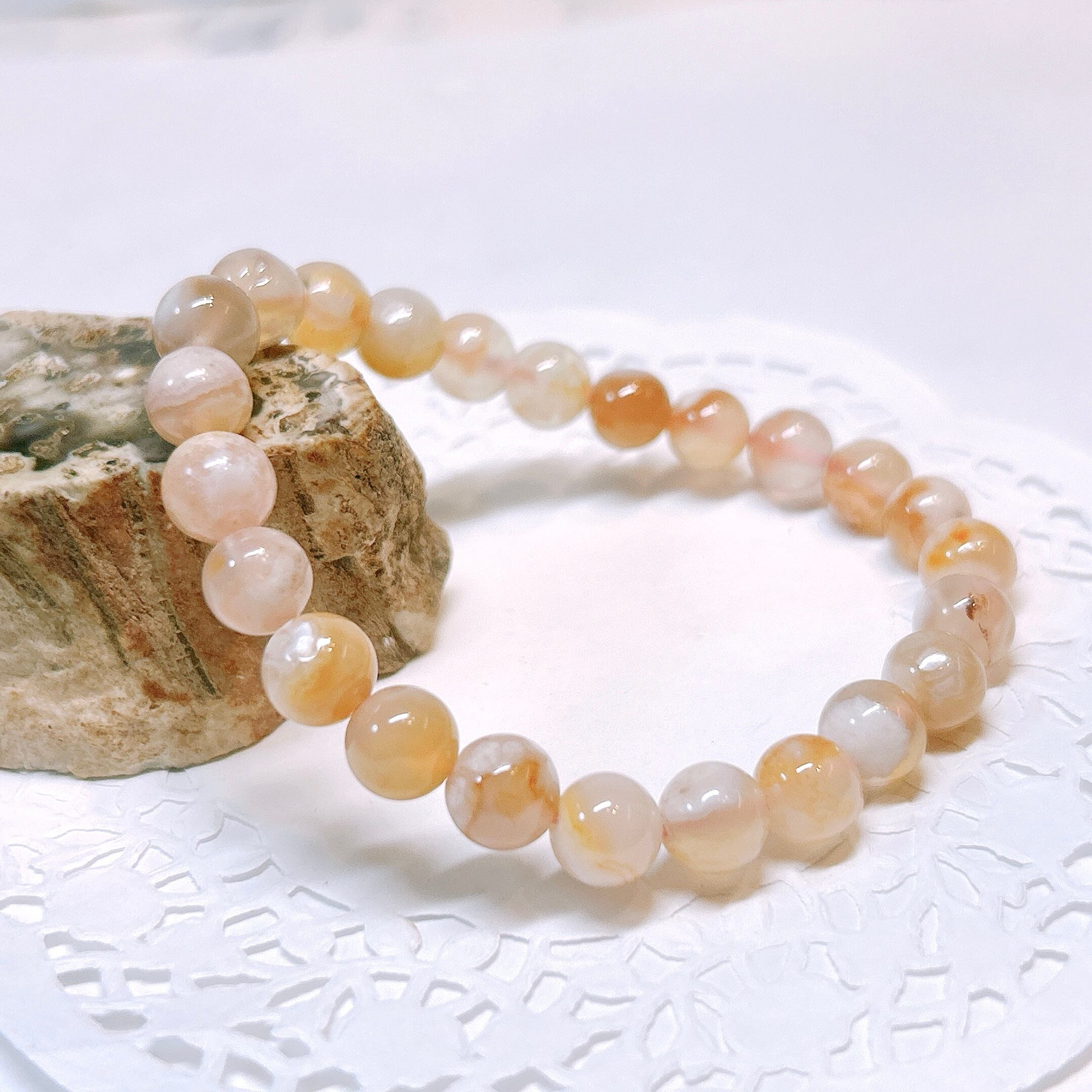 内包される白い模様が桜の様な形をしているので桜アゲートと呼ばれ、人気のブレスレット