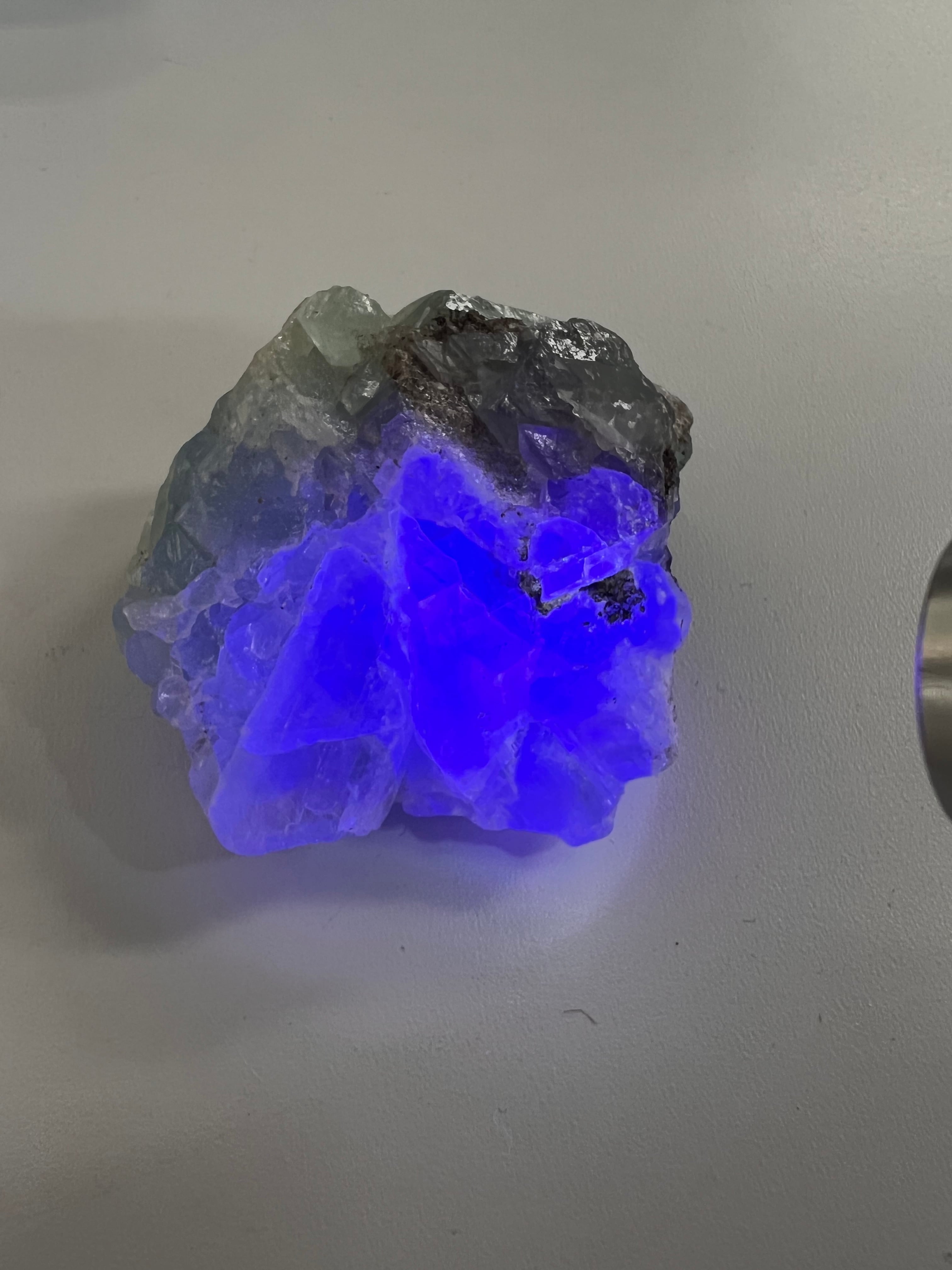 紫外線ライトを当てると蛍光、粉を炭に入れると燐光する性質があります。