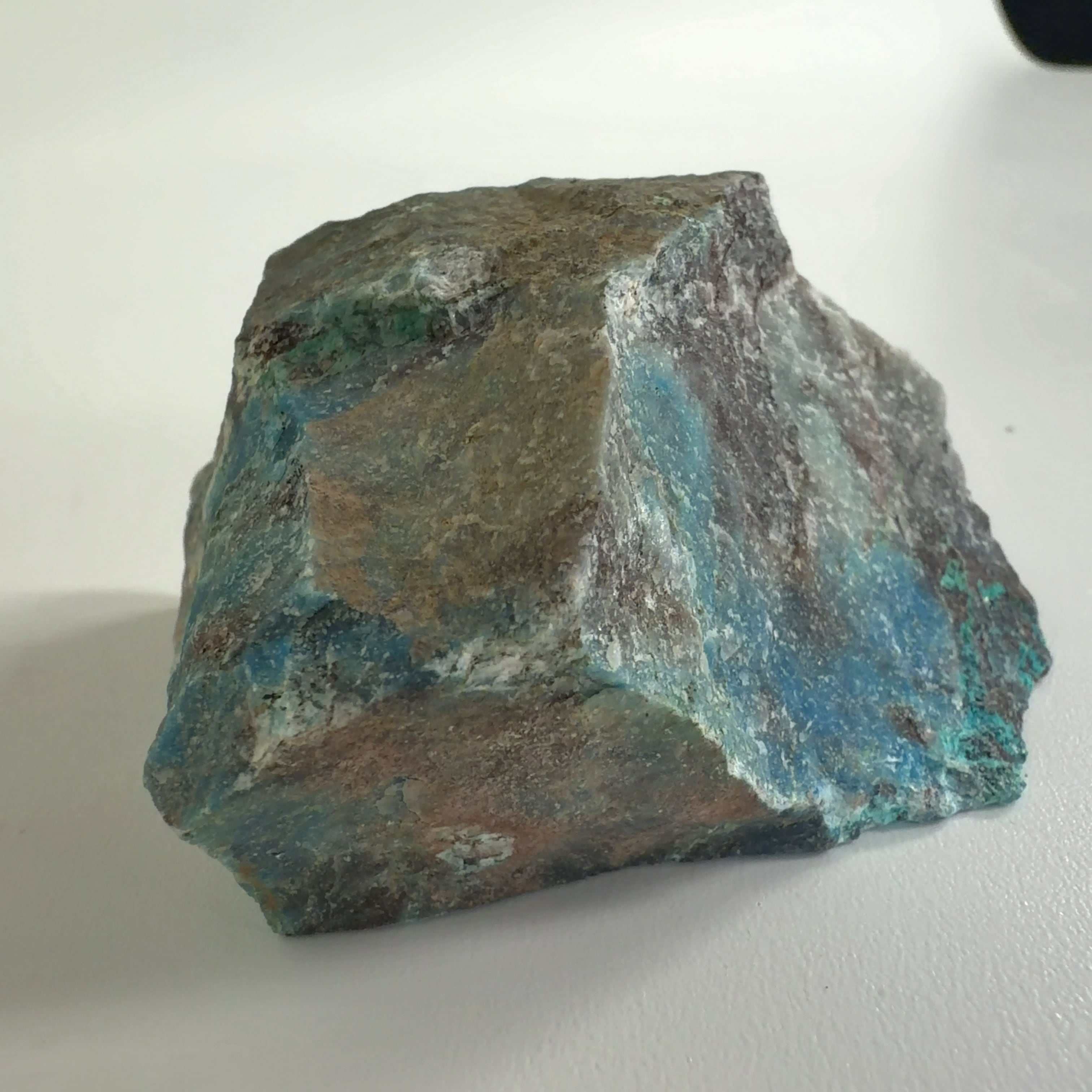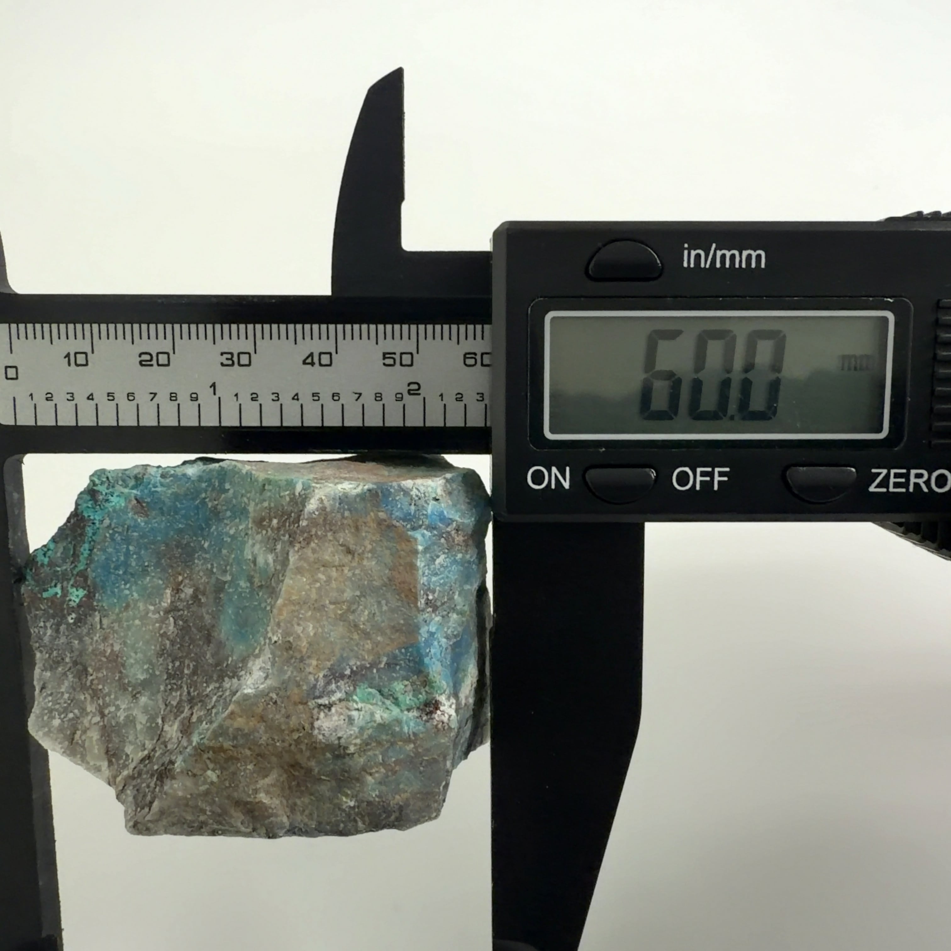 この標本では、クリソコーラ、ダイオプテーズが混在する母岩に青い繊維状又は濃い青色の被膜の箇所が本鉱です。