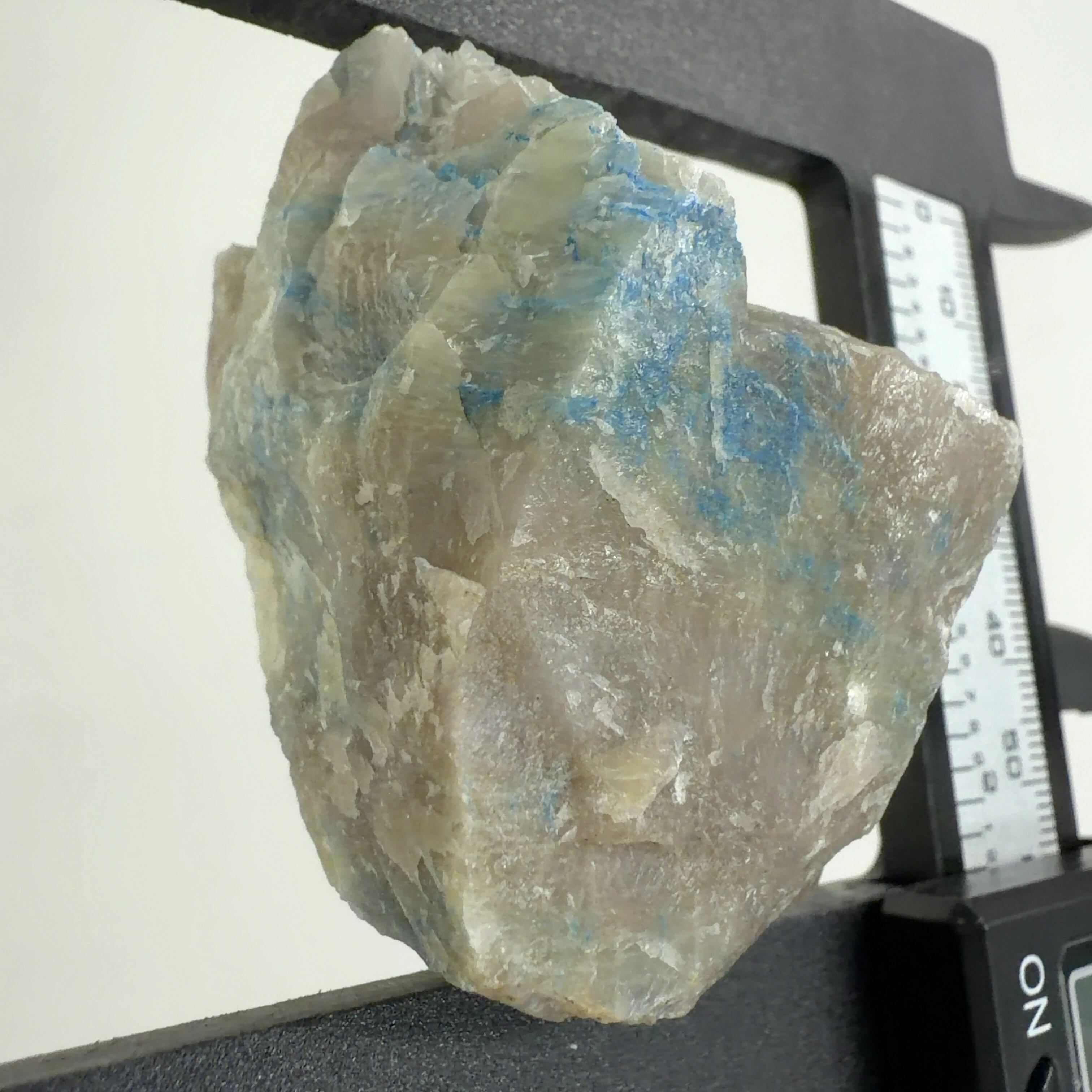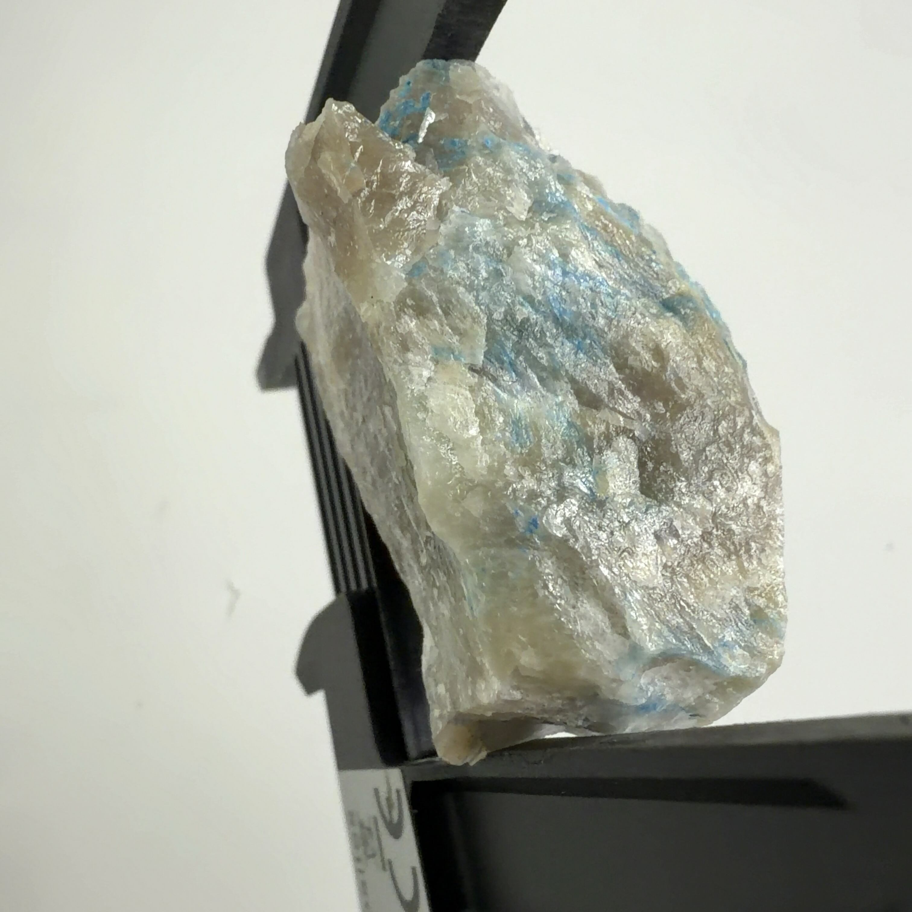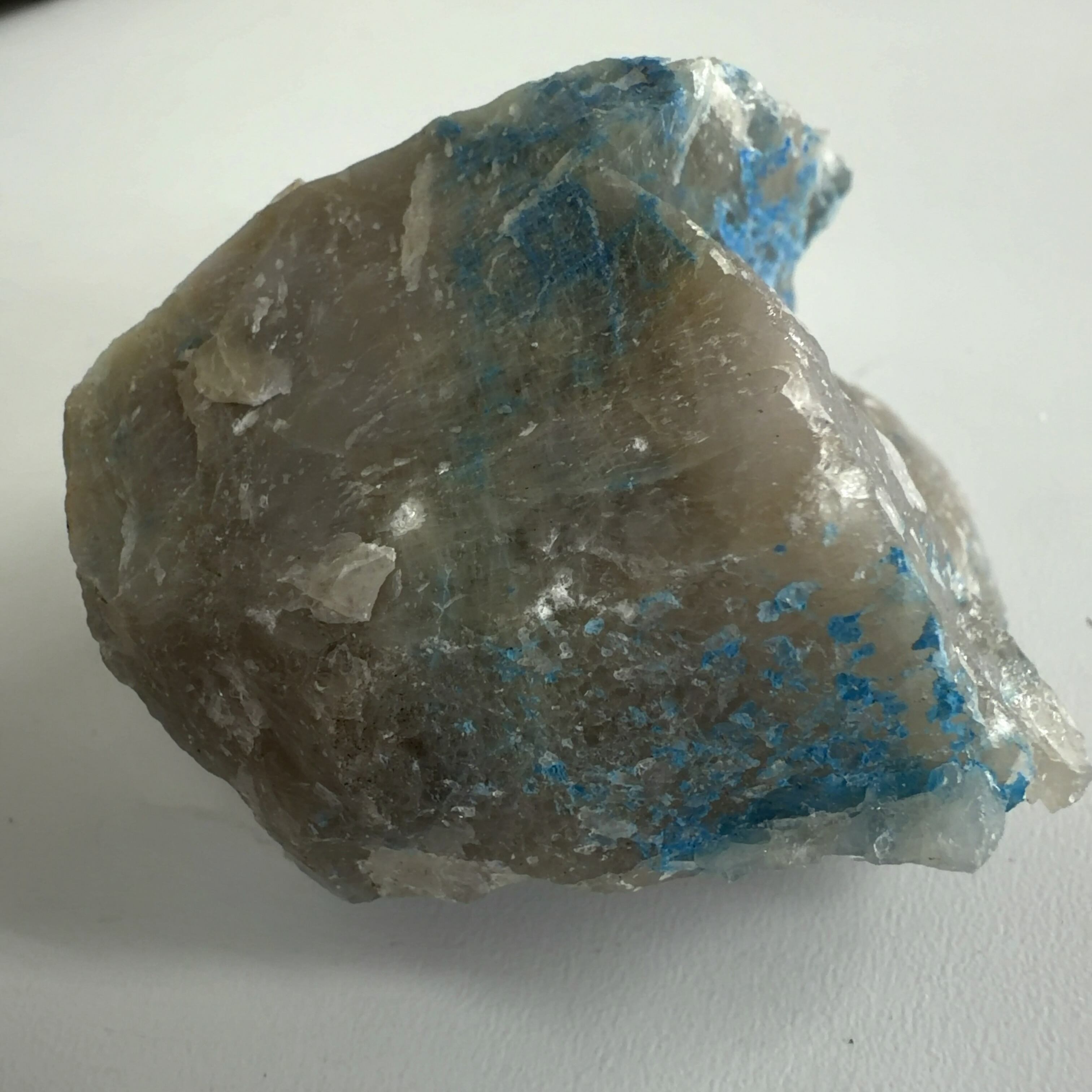 この標本では、クリソコーラ、ダイオプテーズが混在する母岩に青い繊維状又は濃い青色の被膜の箇所が本鉱です。