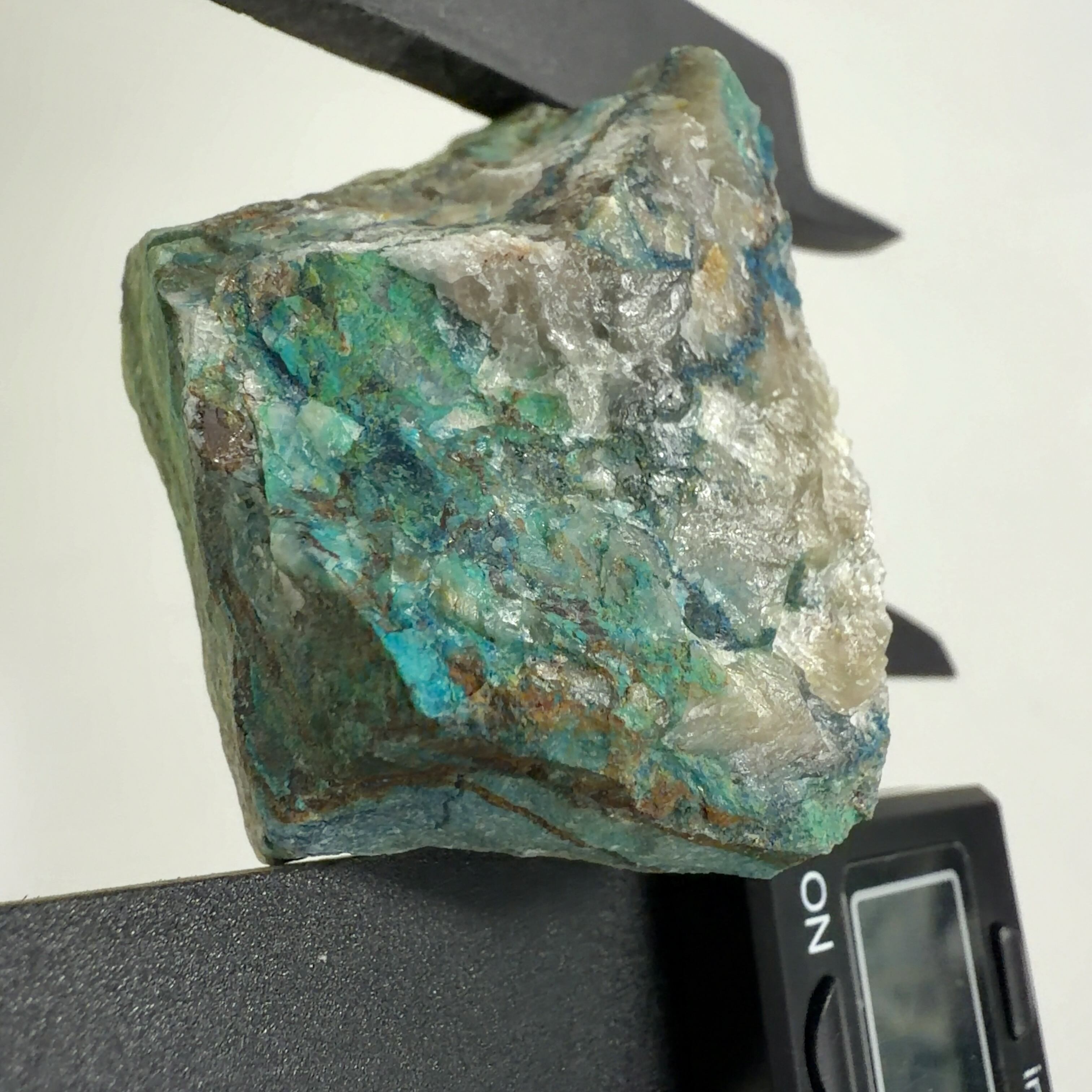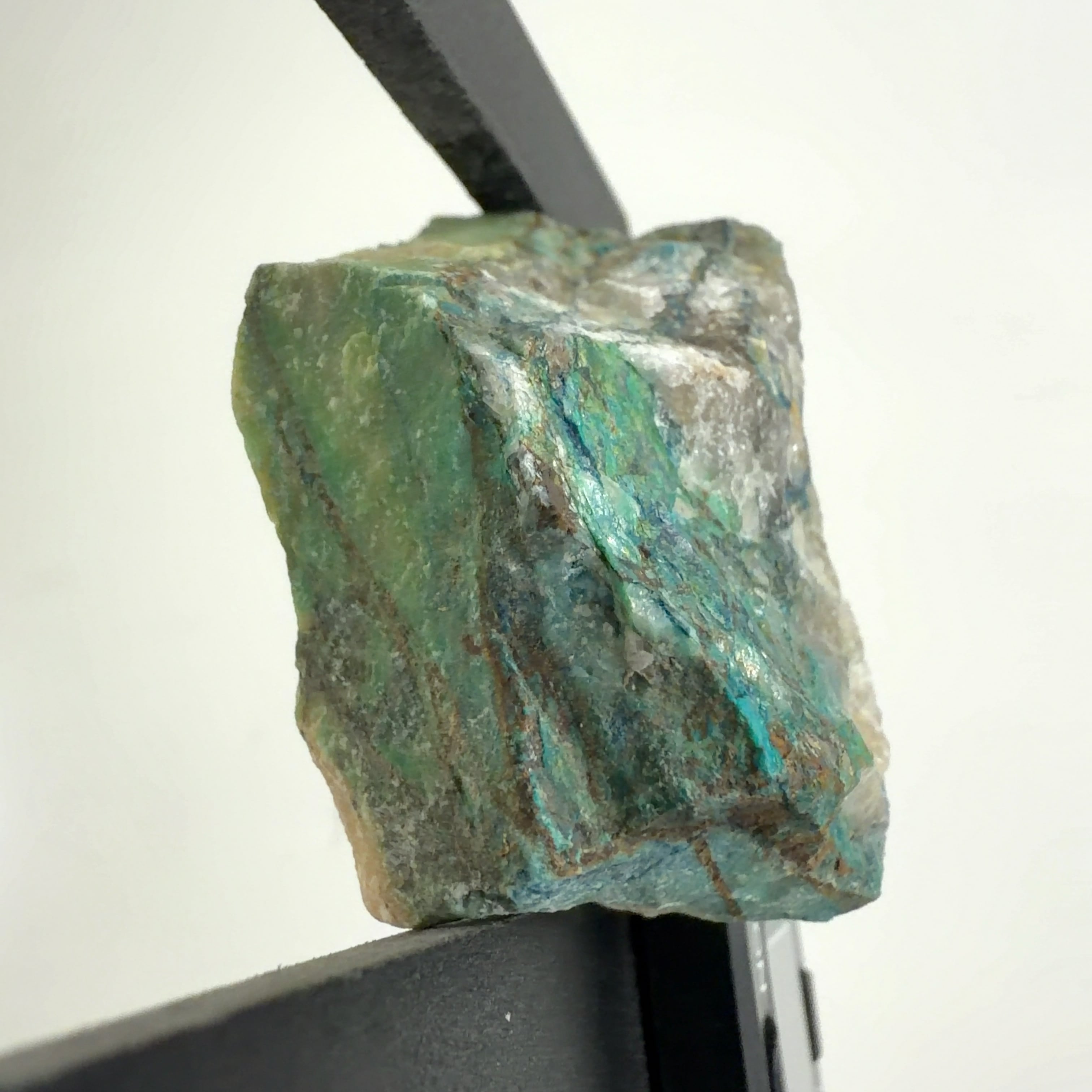 この標本では、クリソコーラ、ダイオプテーズが混在する母岩に青い繊維状又は濃い青色の被膜の箇所が本鉱です。