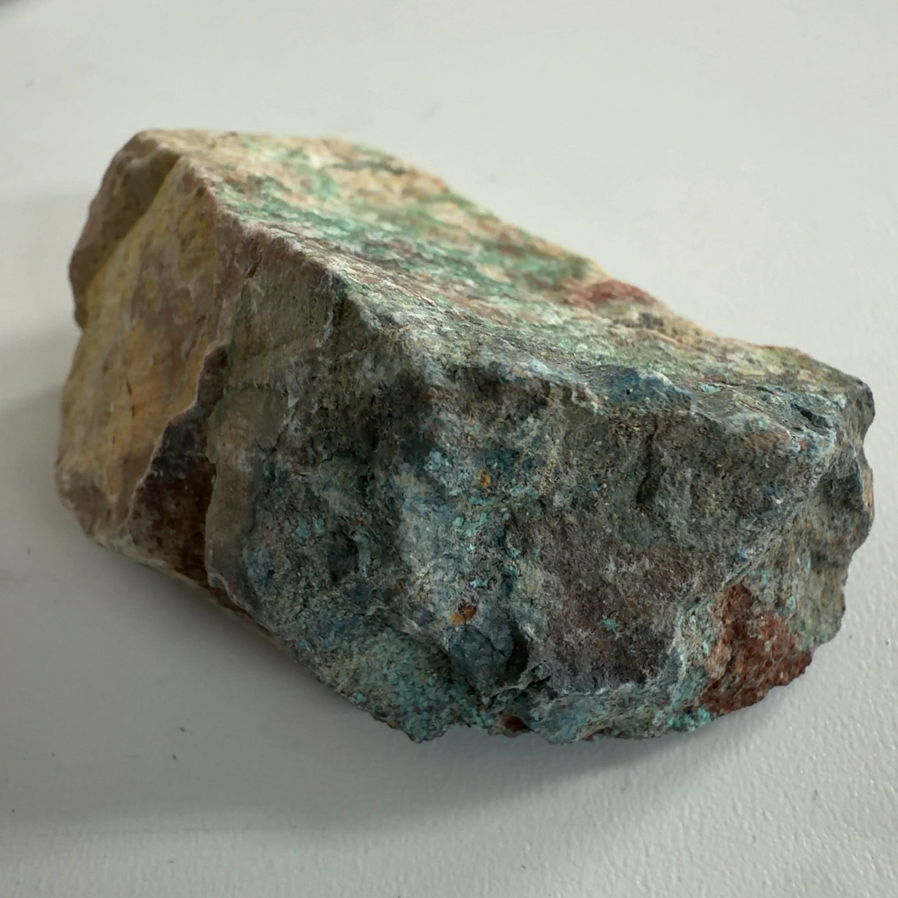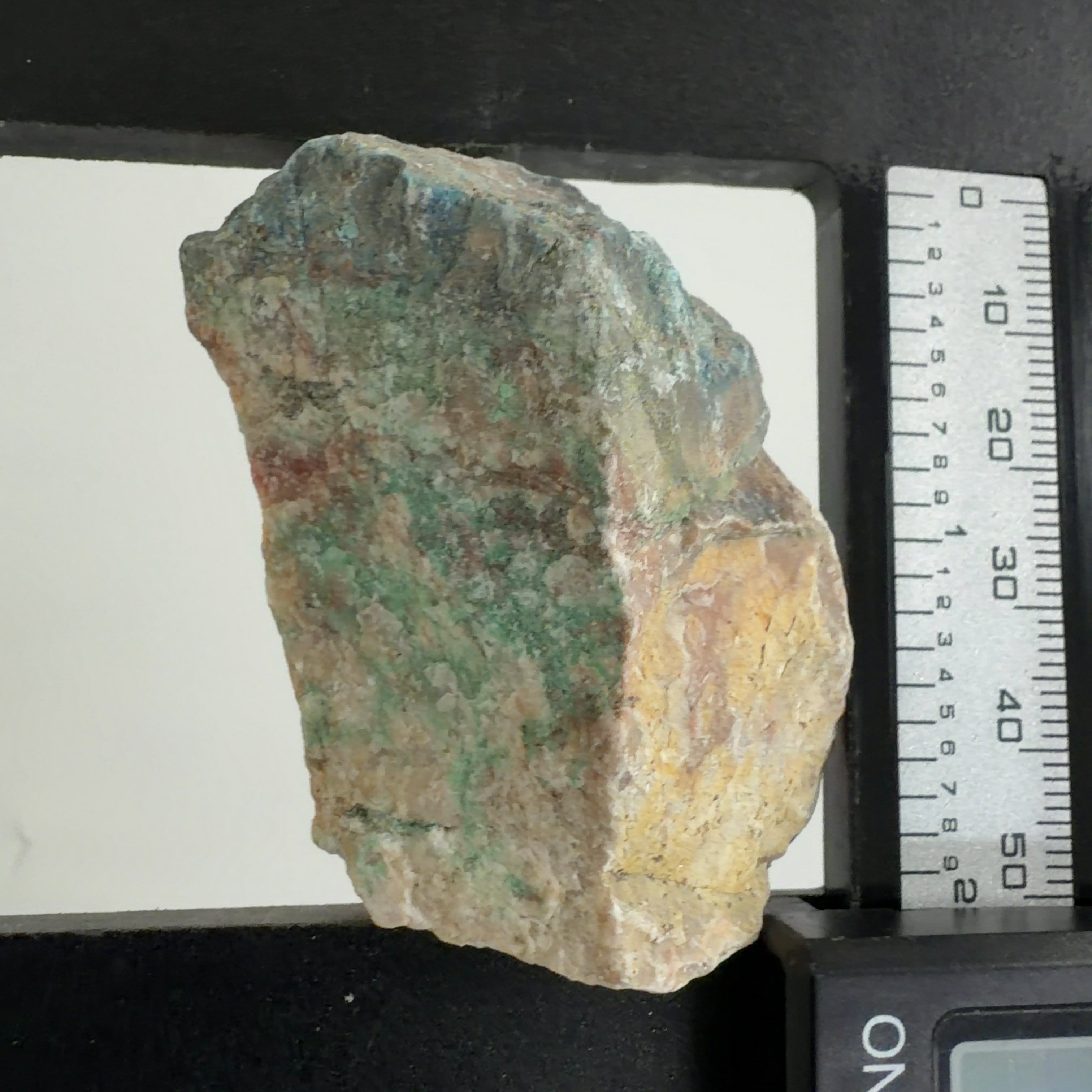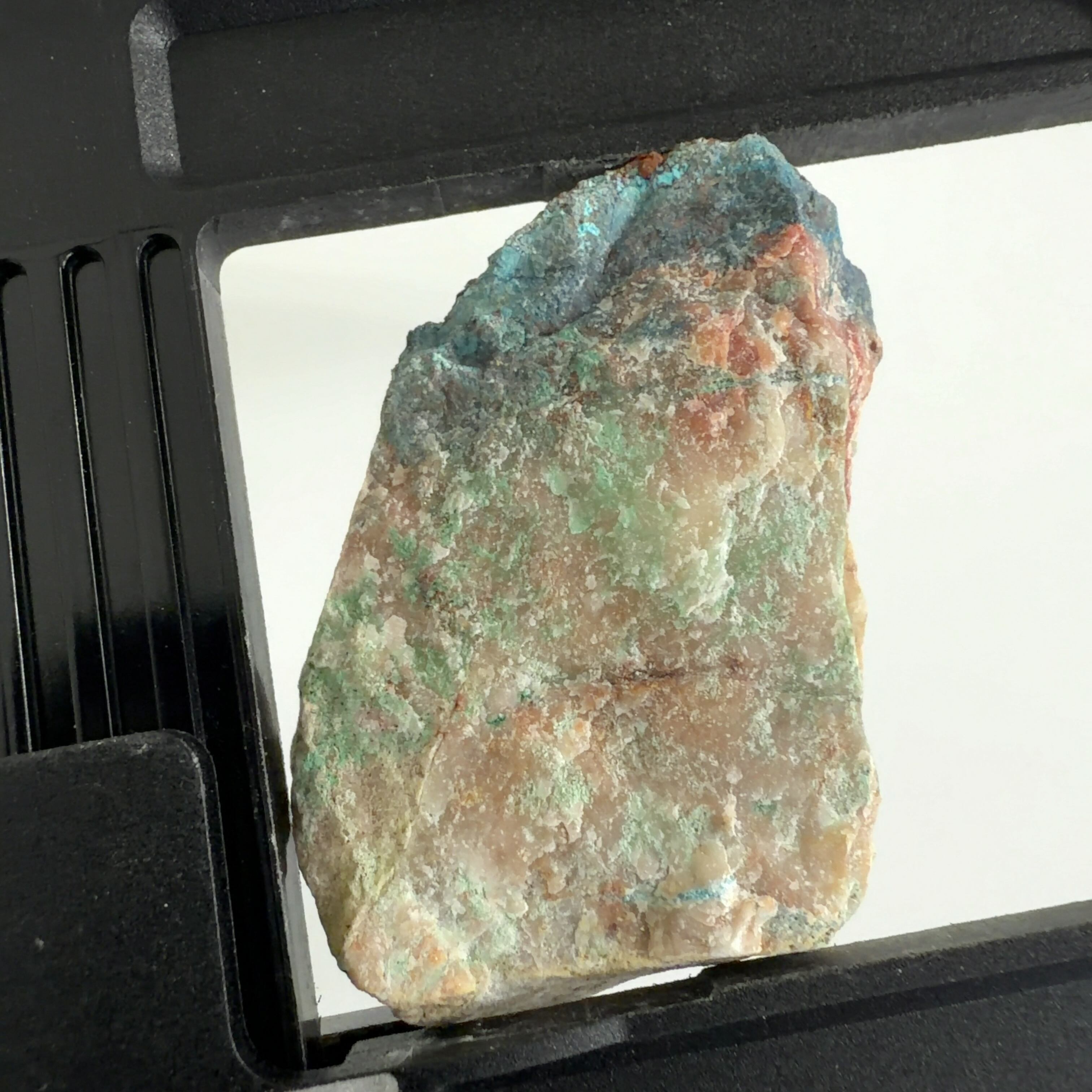 この標本では、クリソコーラ、ダイオプテーズが混在する母岩に青い繊維状又は濃い青色の被膜の箇所が本鉱です。