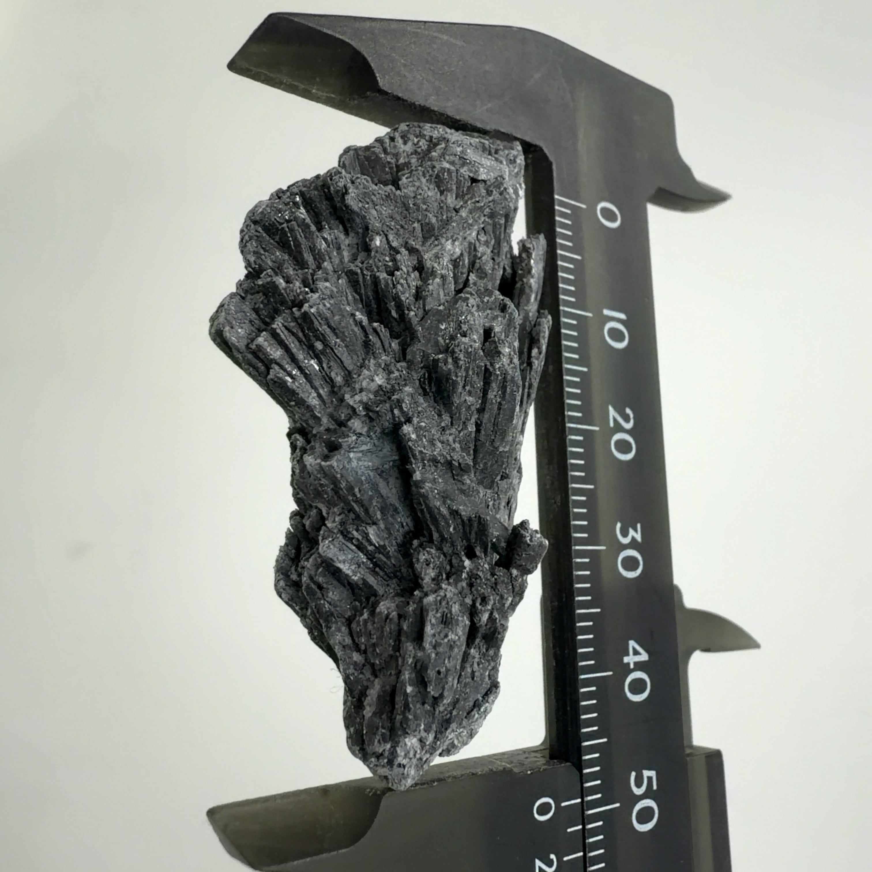 和名は「らんしょうせき」。アルミのケイ酸塩鉱物。向きによってモース硬度が異なる性質(二硬性)を示す。微量に含まれる成分によって、青、緑、橙、黒などの色があります。扇状の形から”Vassoura de Bruxa”(魔女のほうき)とも呼ばれています。
