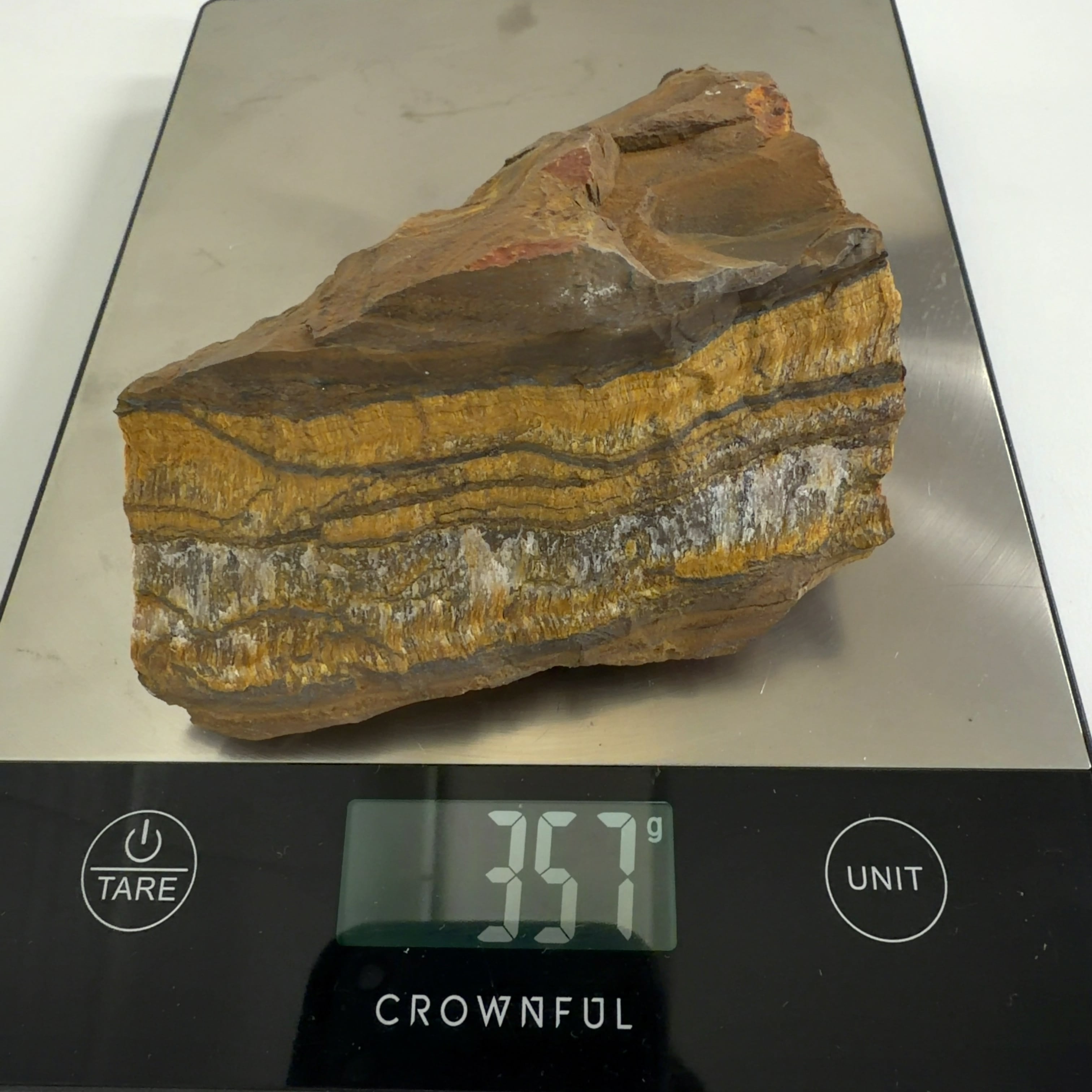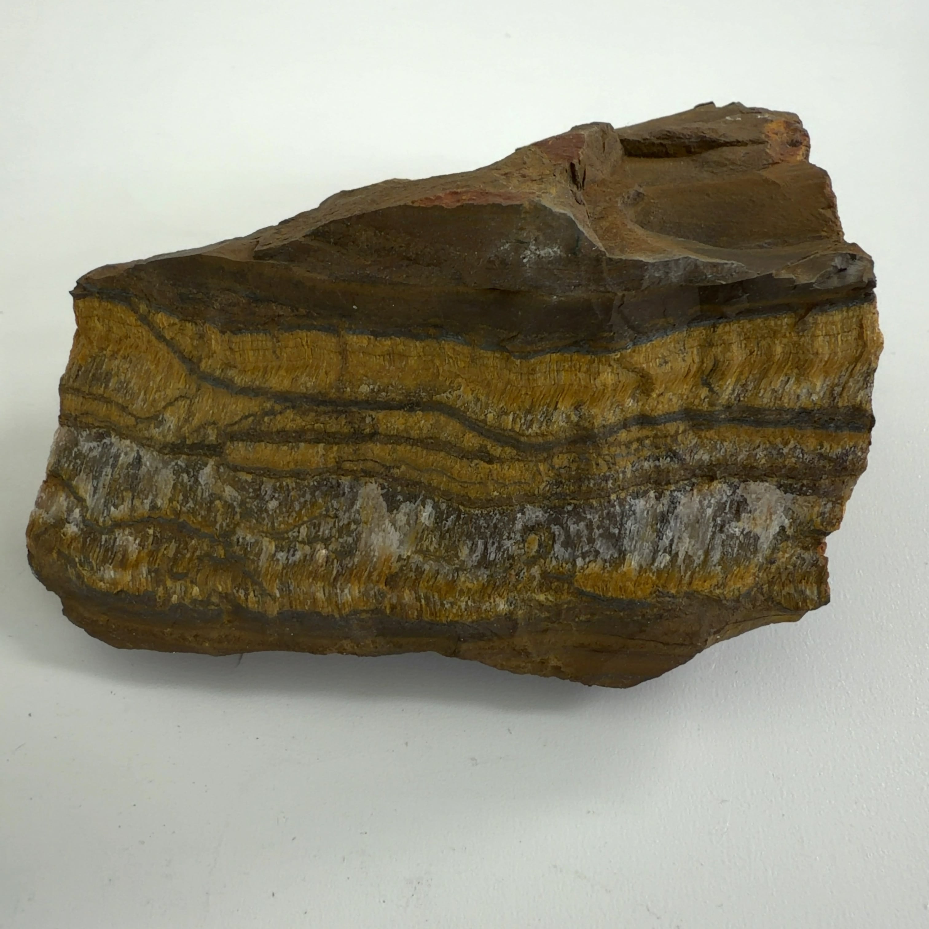 アンフィボール(Amphibole) 「角閃石」の一種のクロシドライト (Crocidolite) 「青石綿」という鉱物に石英が浸み込んで硬くなり、その原石の青色が酸化して、金褐色や黄褐色に変化したもの。
