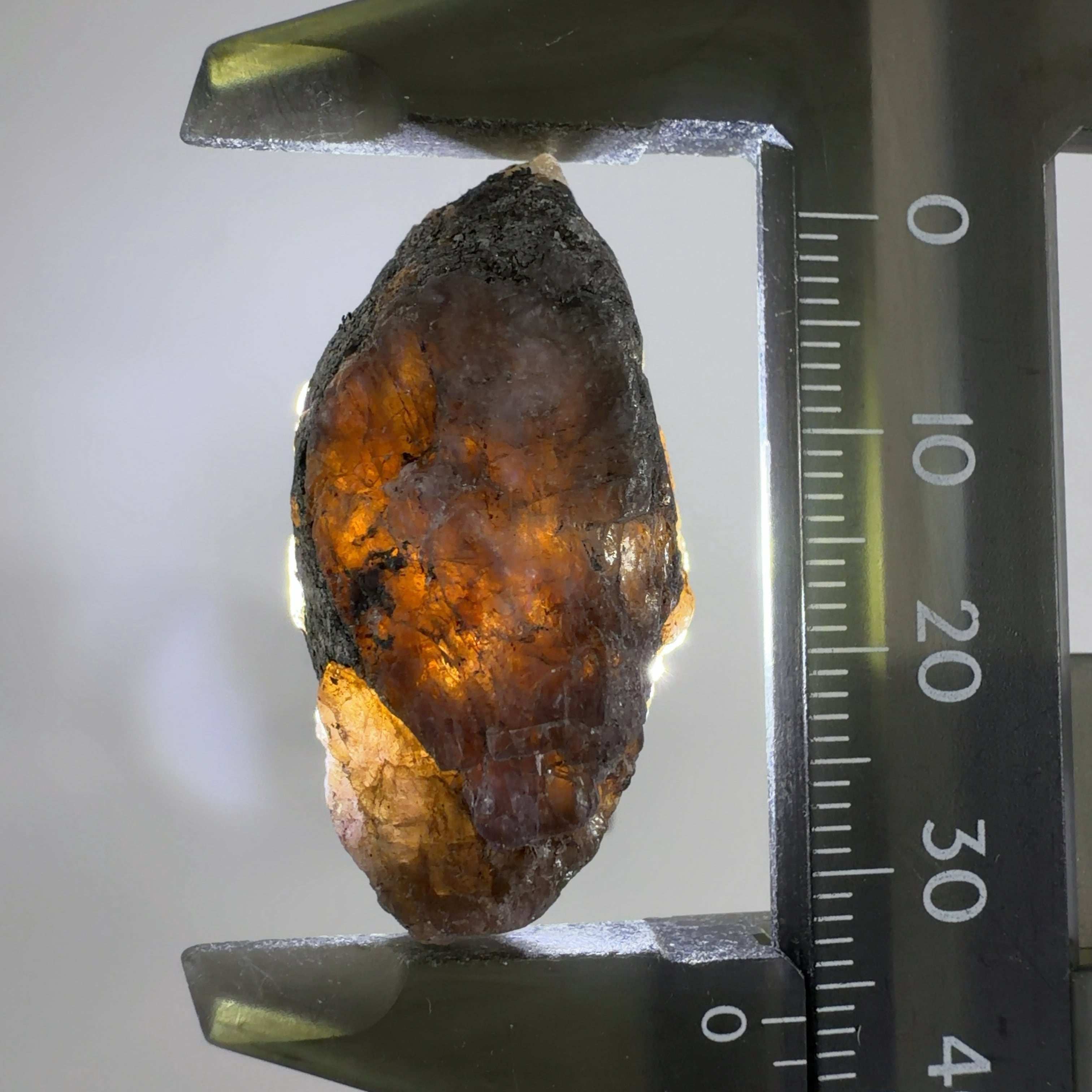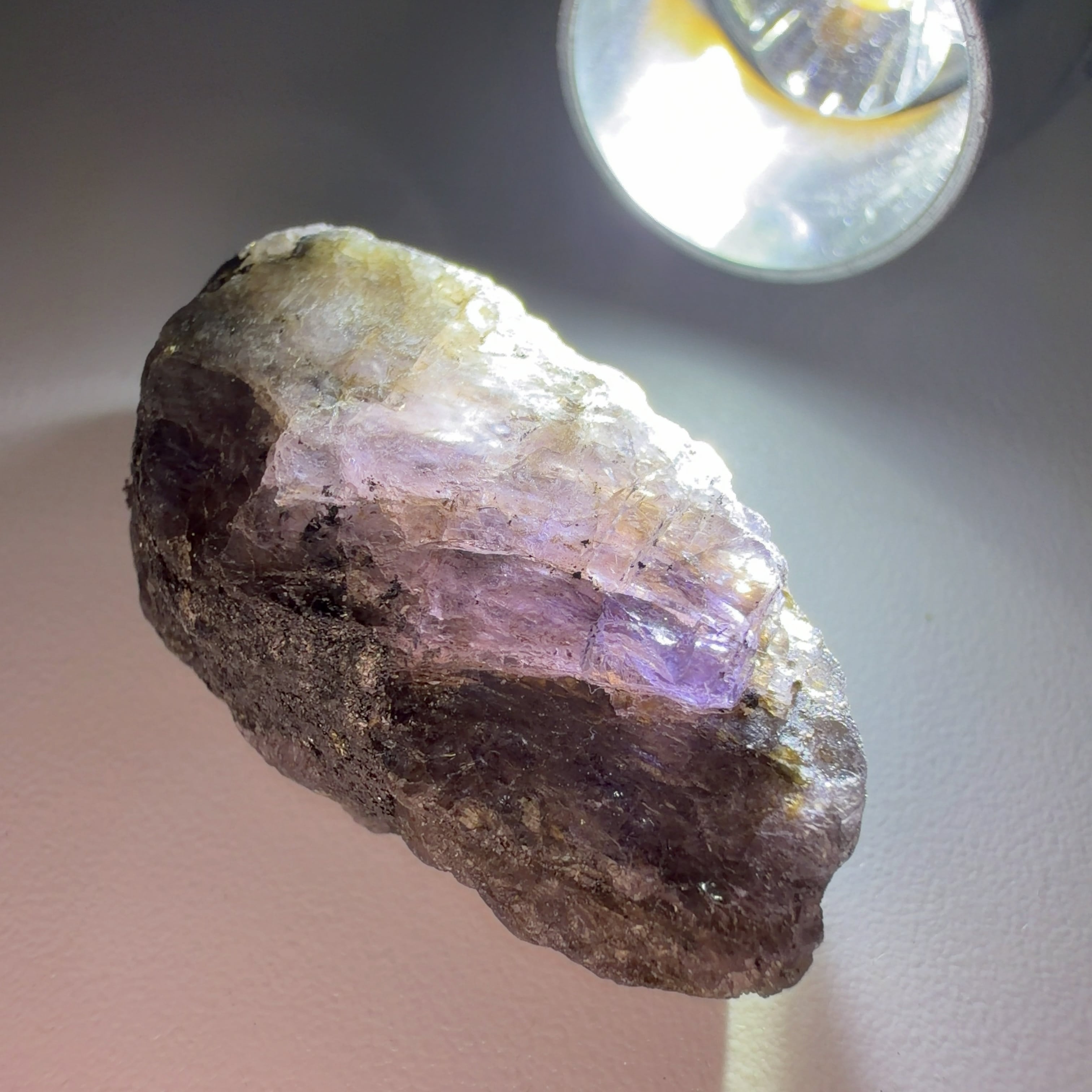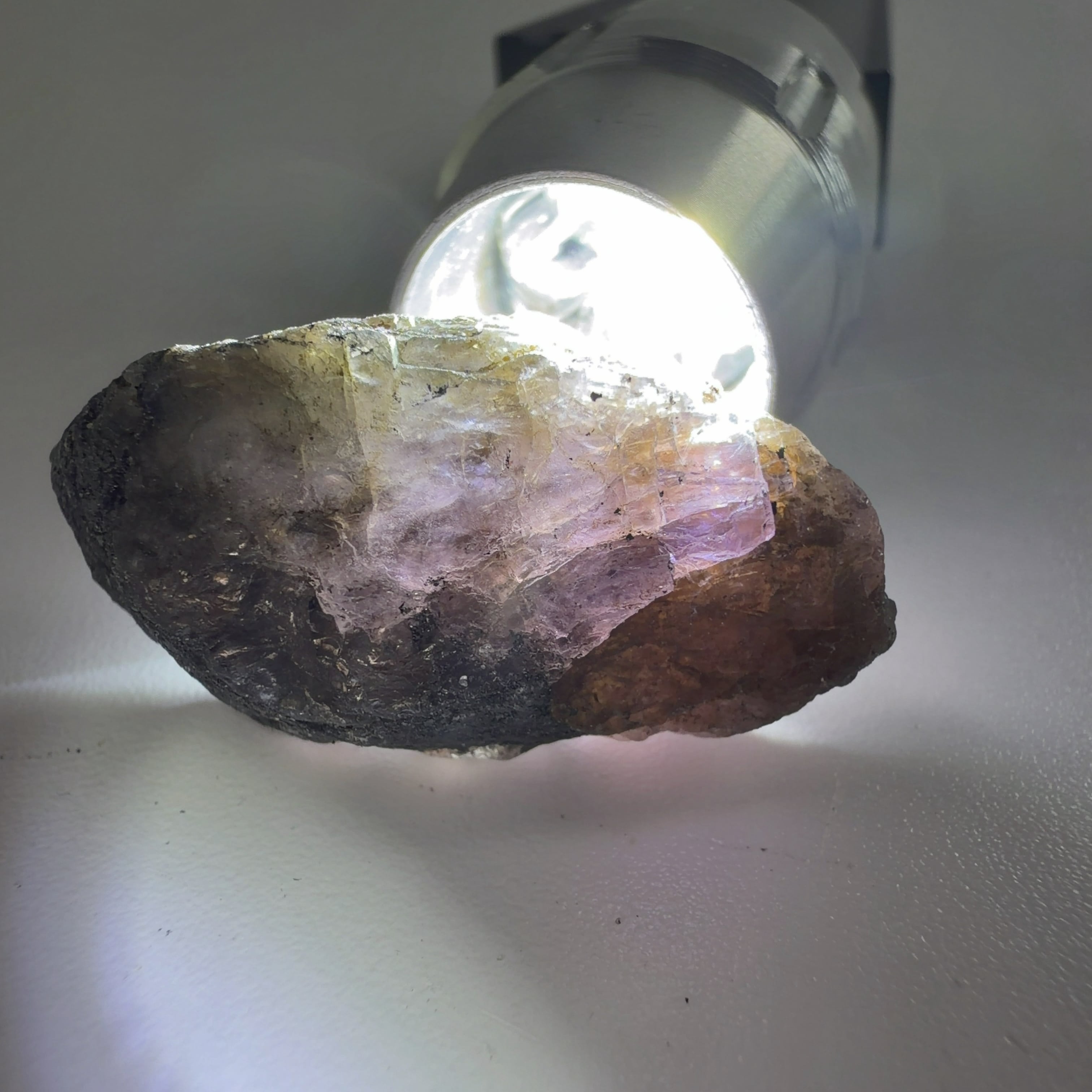 未処理の原石です。背後からペンライトで透明度と色を確認してください。