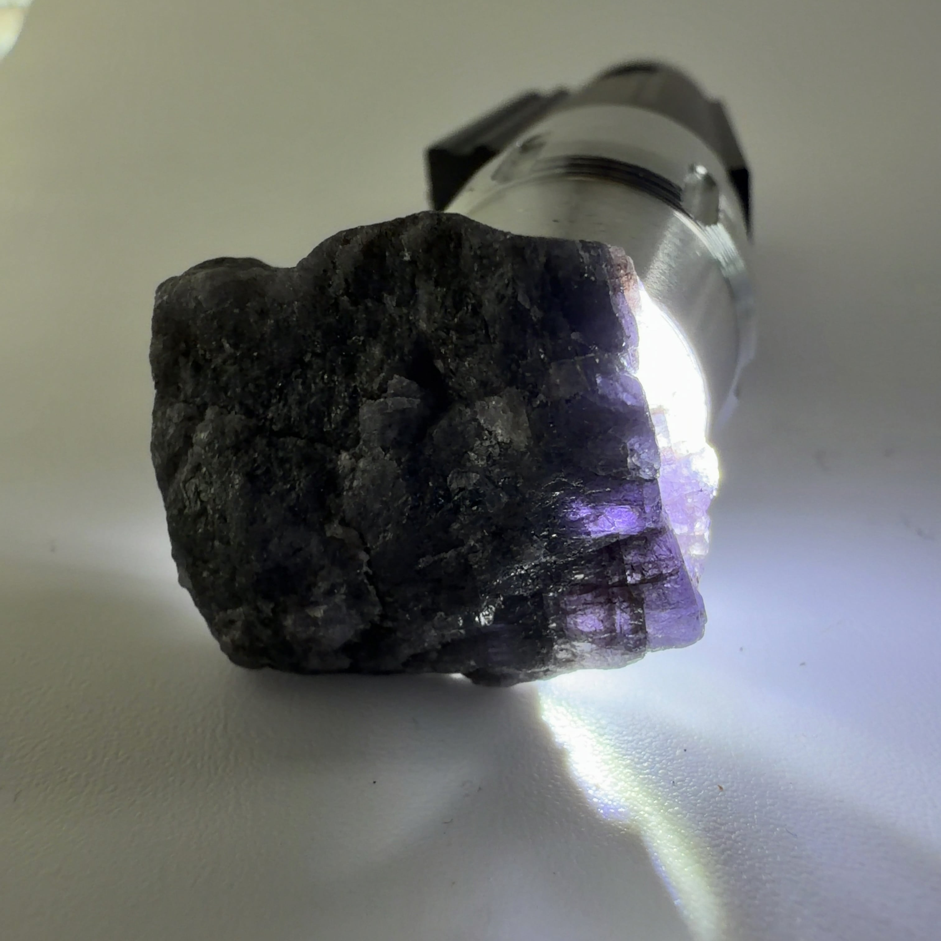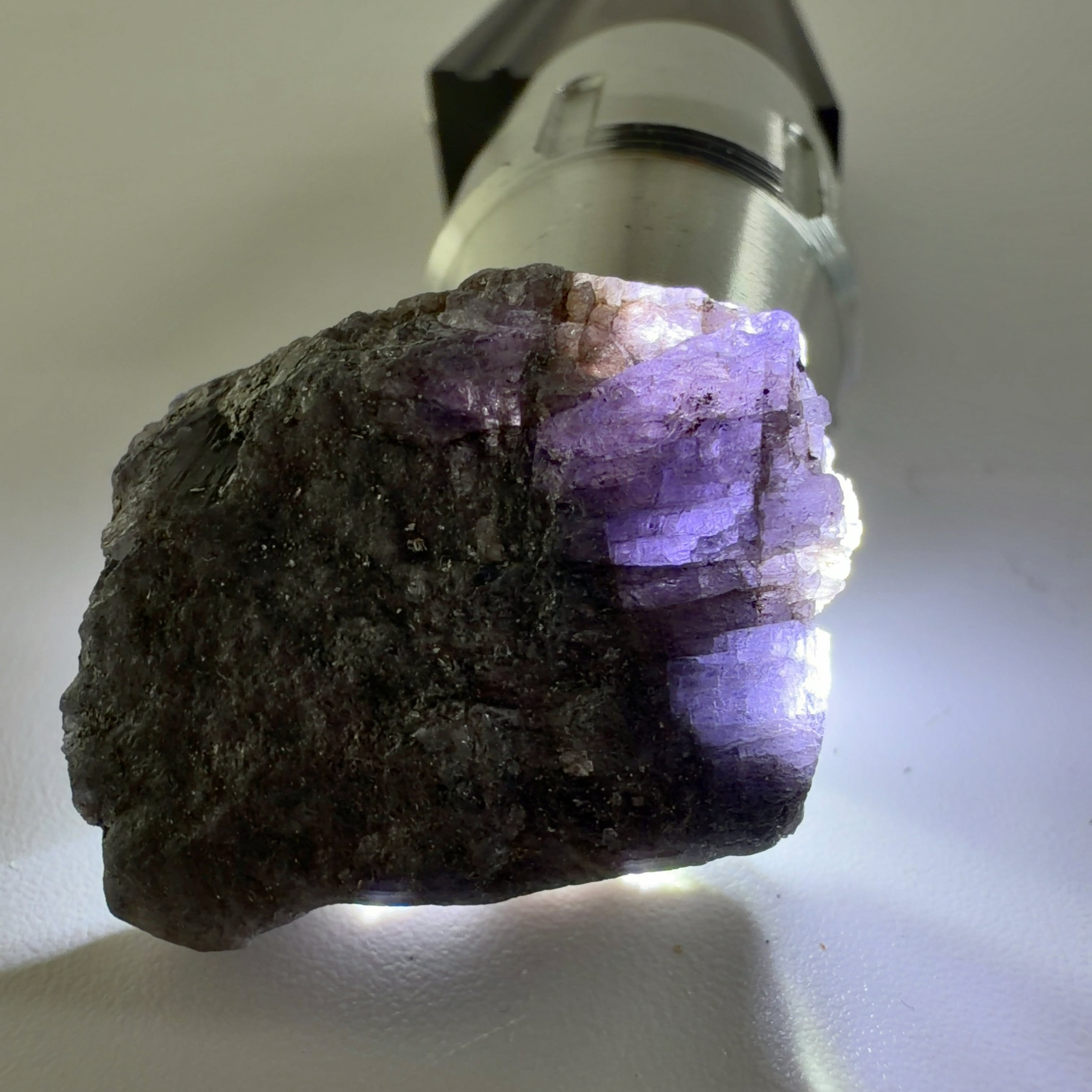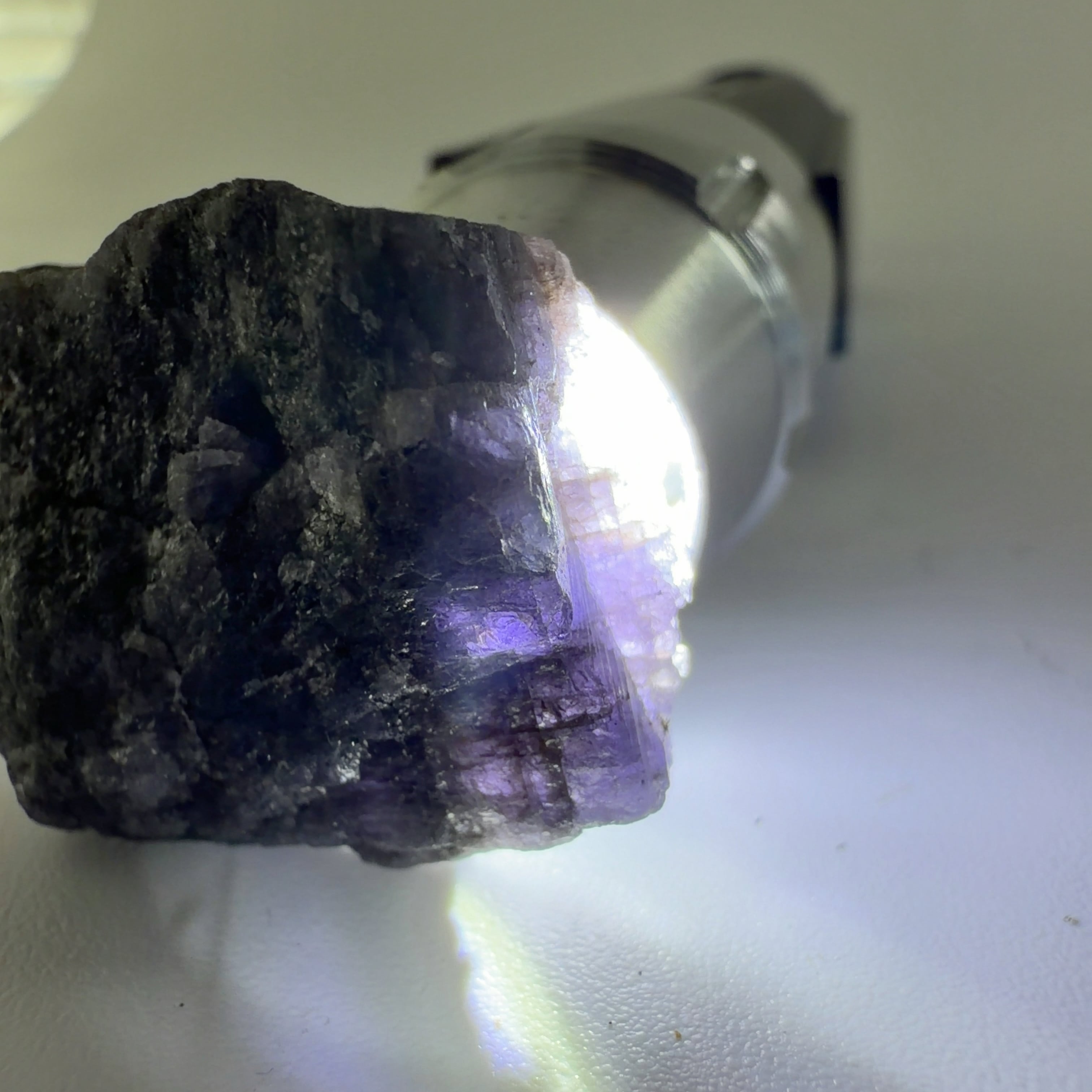 未処理の原石です。背後からペンライトで透明度と色を確認してください。