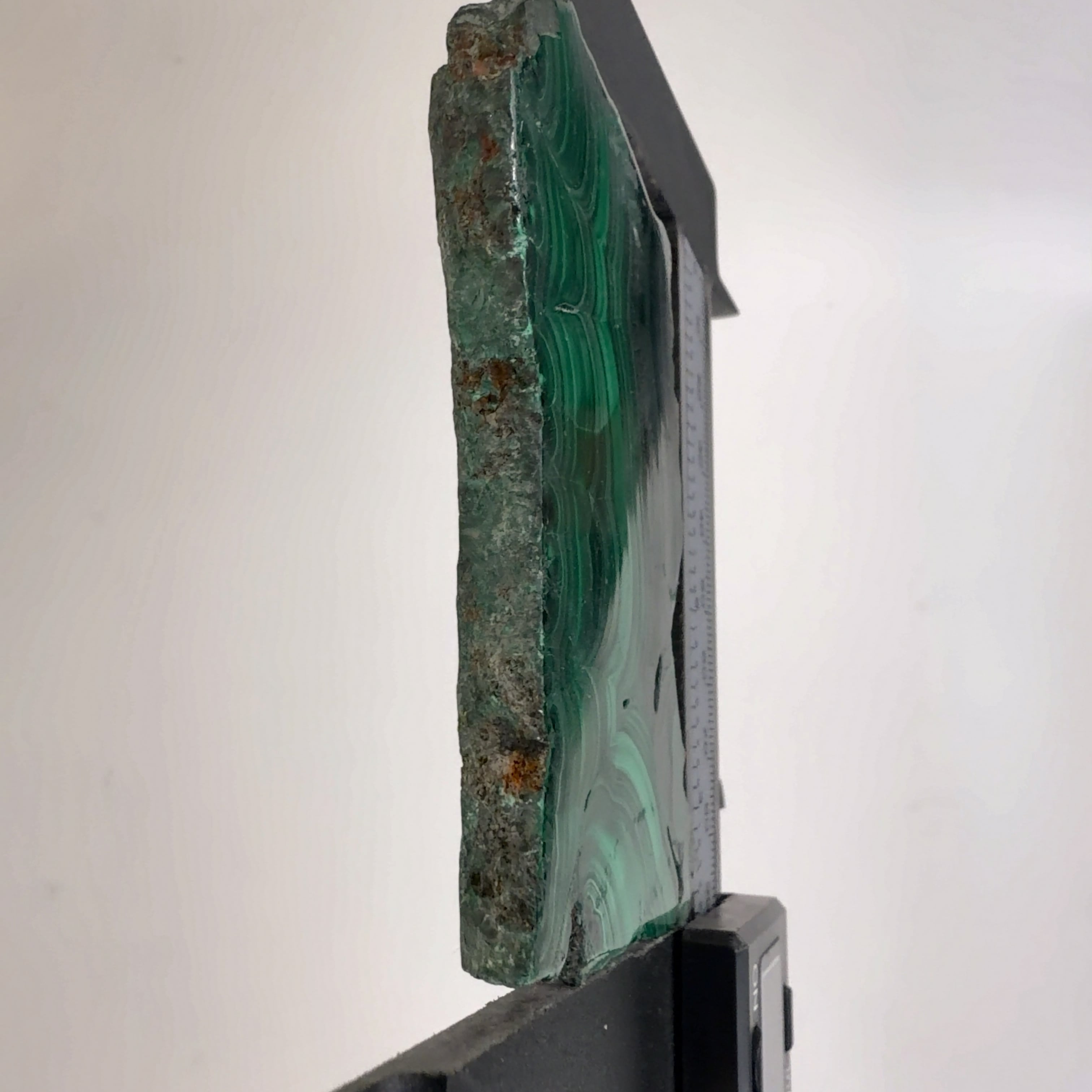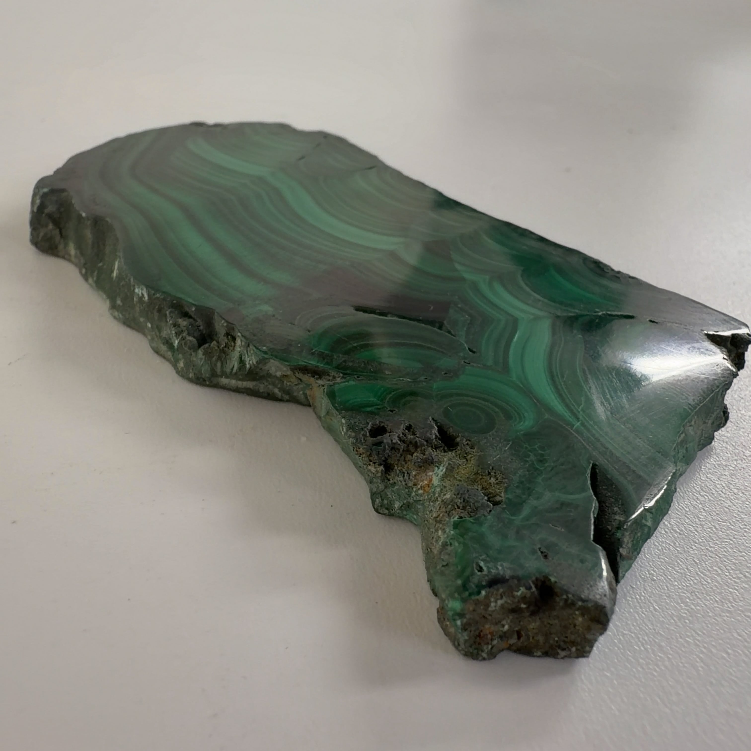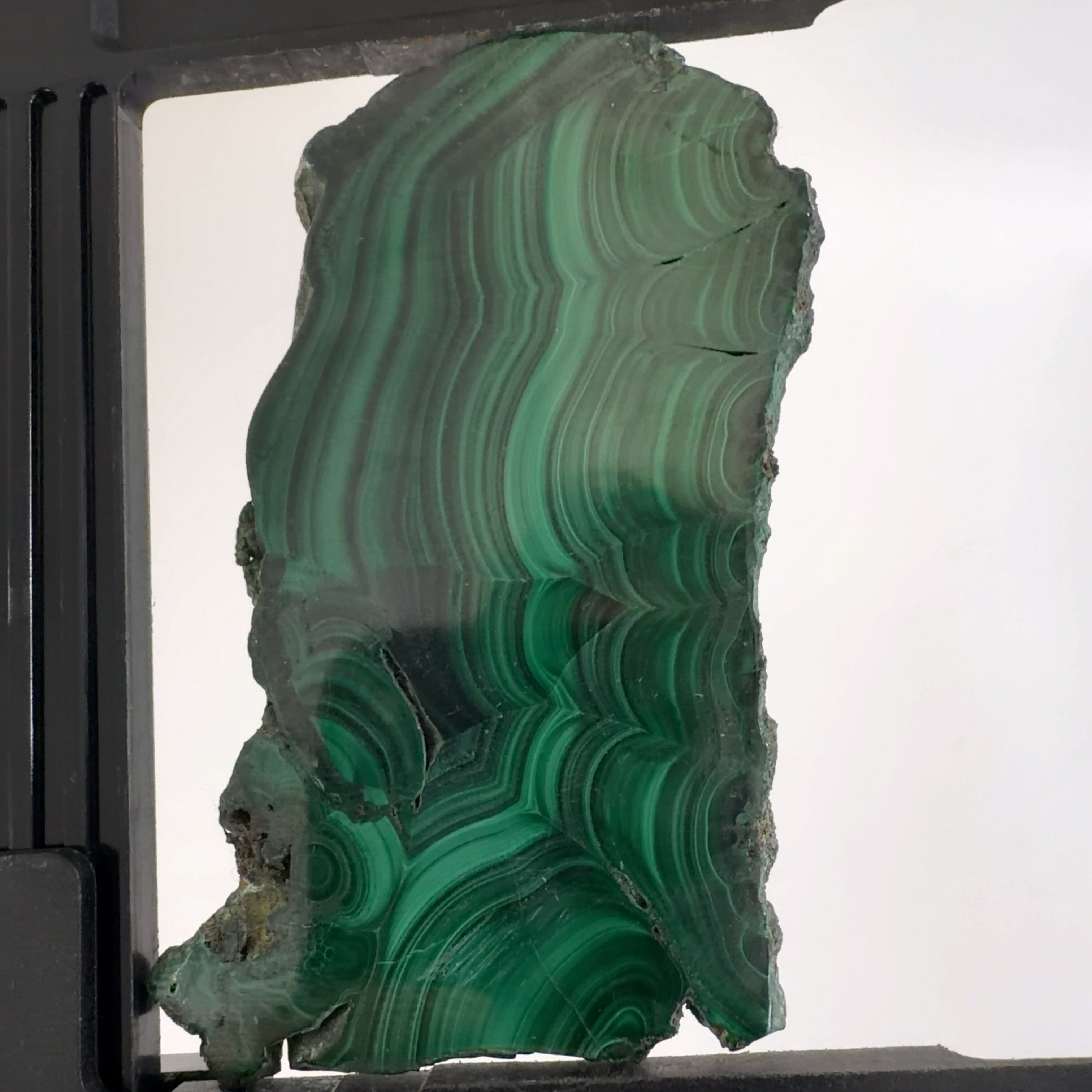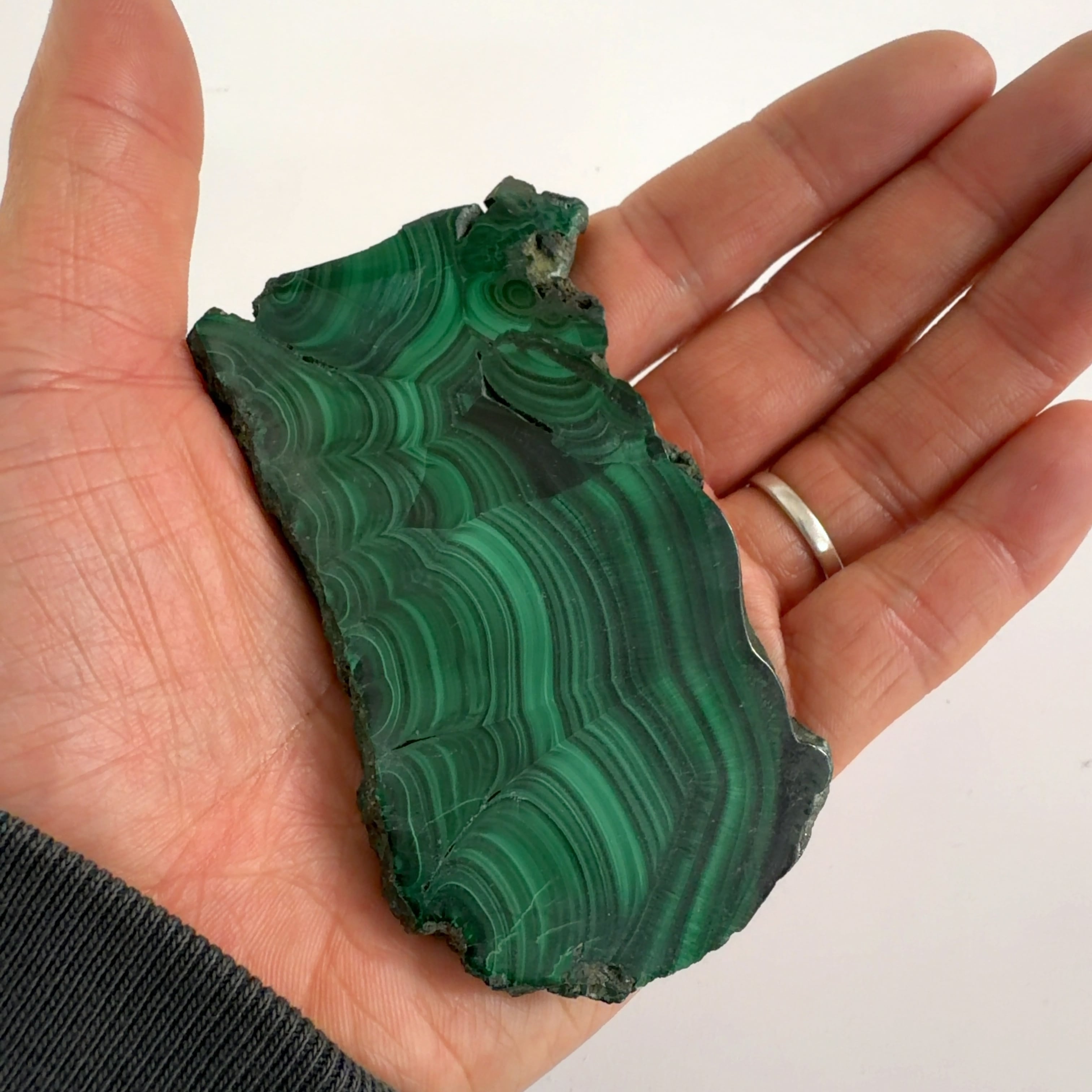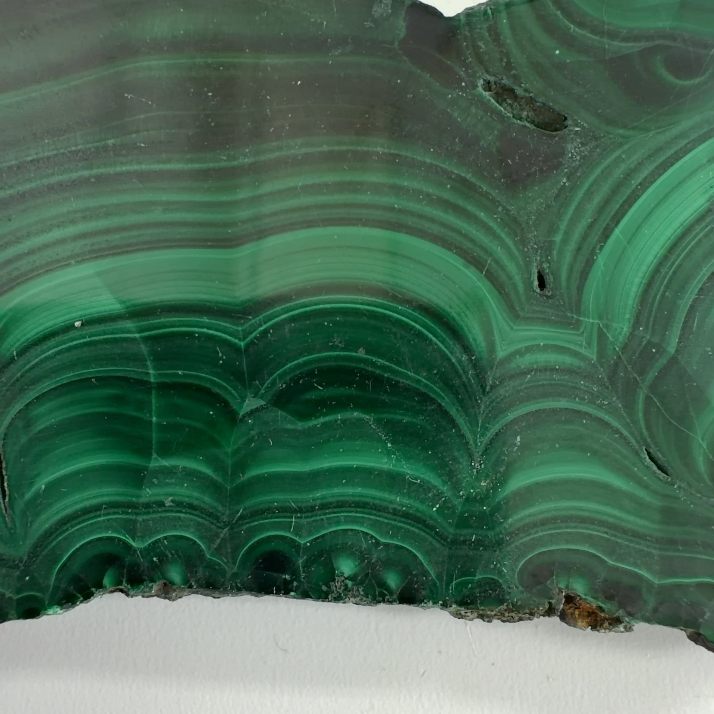 水に溶けた黄銅鉱と水に溶けた二酸化炭素が反応してできる鉱物で、斜めから光を反射させると孔雀の羽のように見えるので和名は孔雀石と名付けられています。