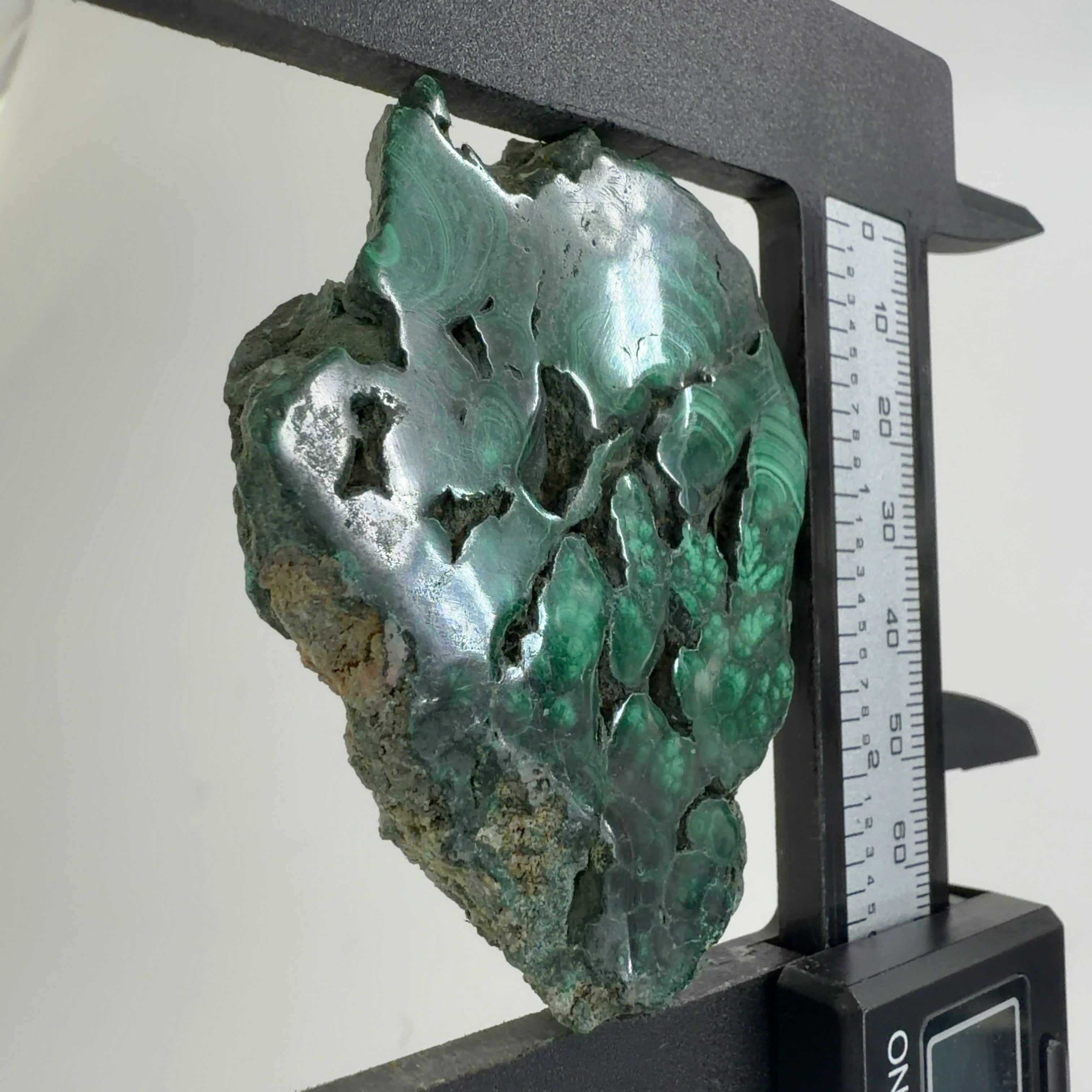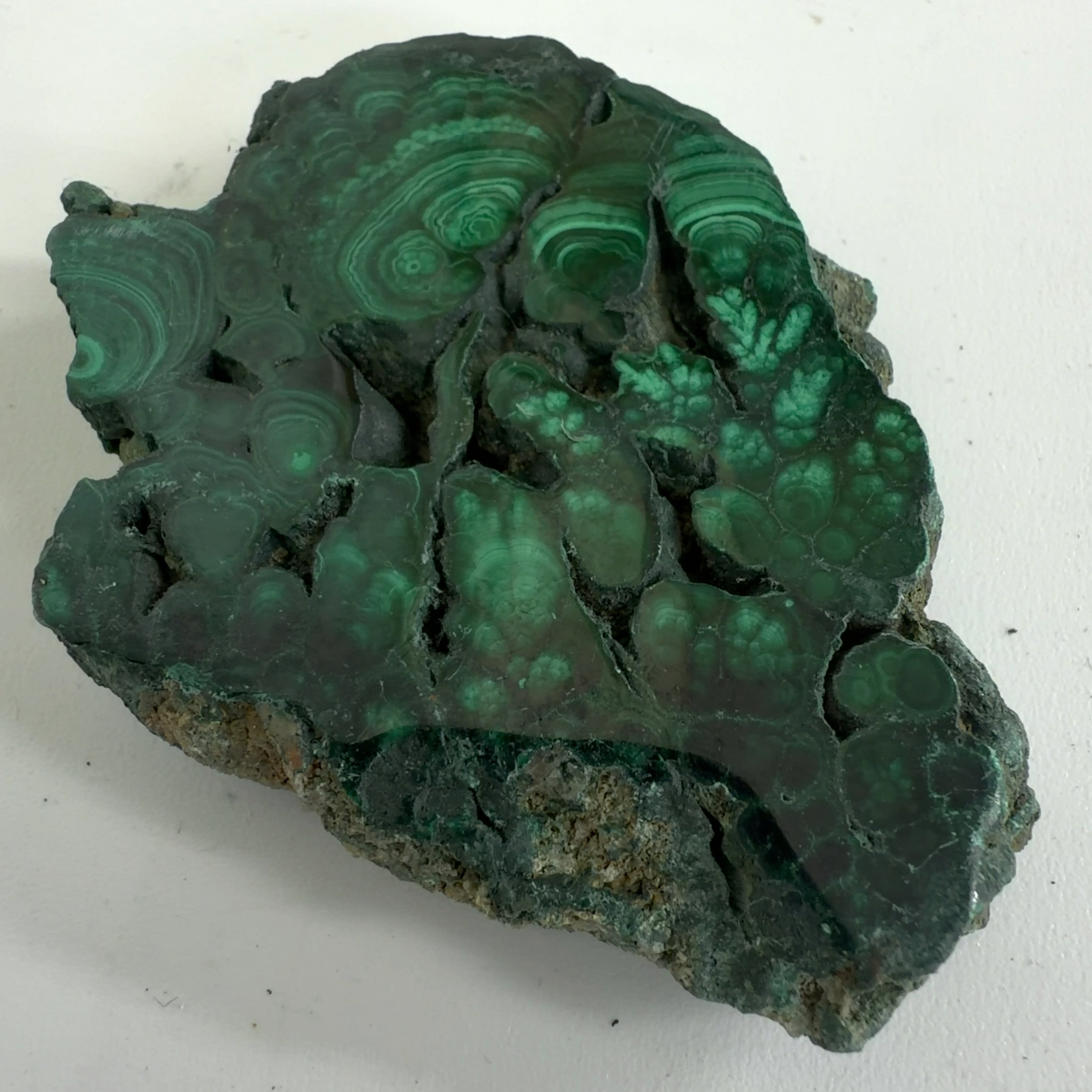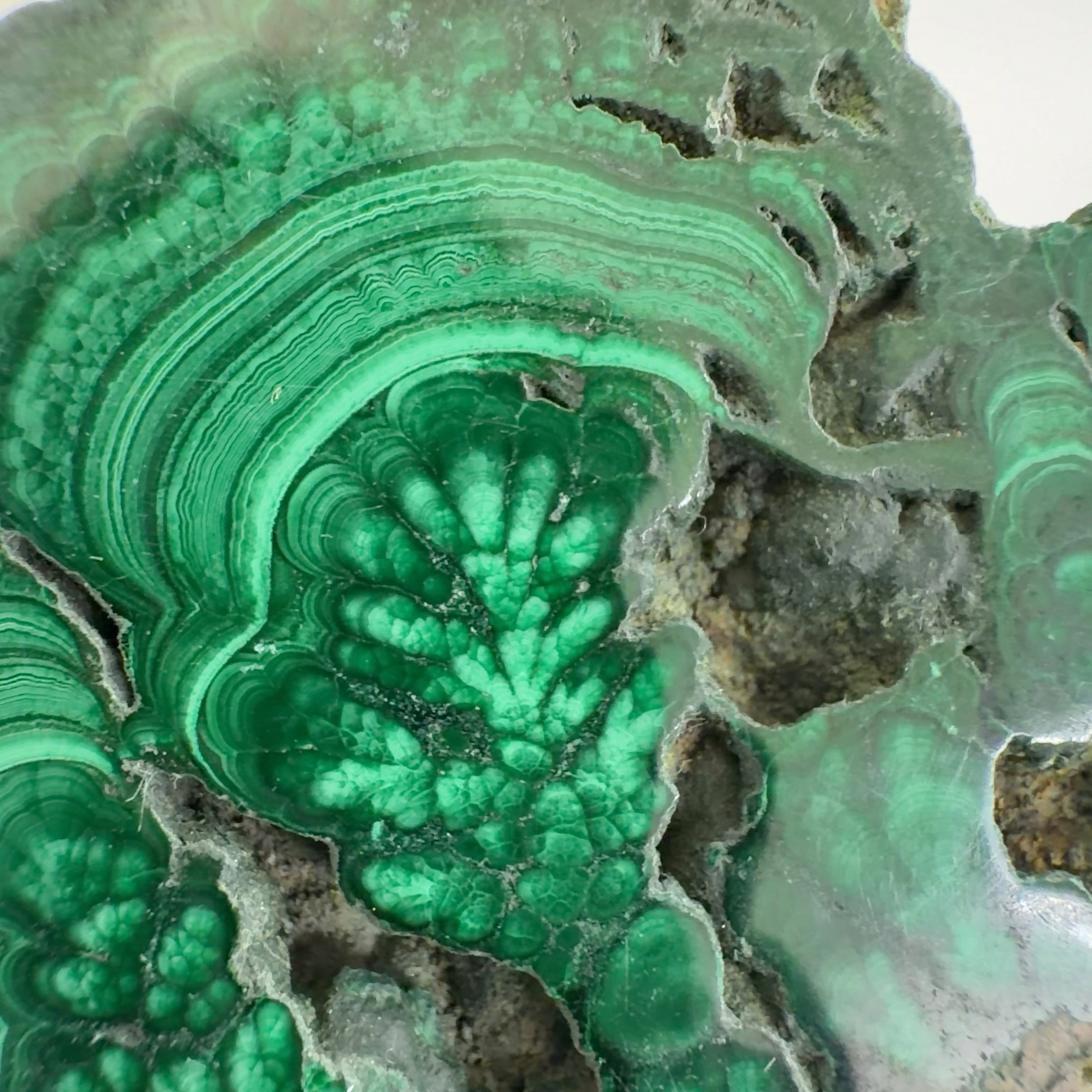 水に溶けた黄銅鉱と水に溶けた二酸化炭素が反応してできる鉱物で、斜めから光を反射させると孔雀の羽のように見えるので和名は孔雀石と名付けられています。