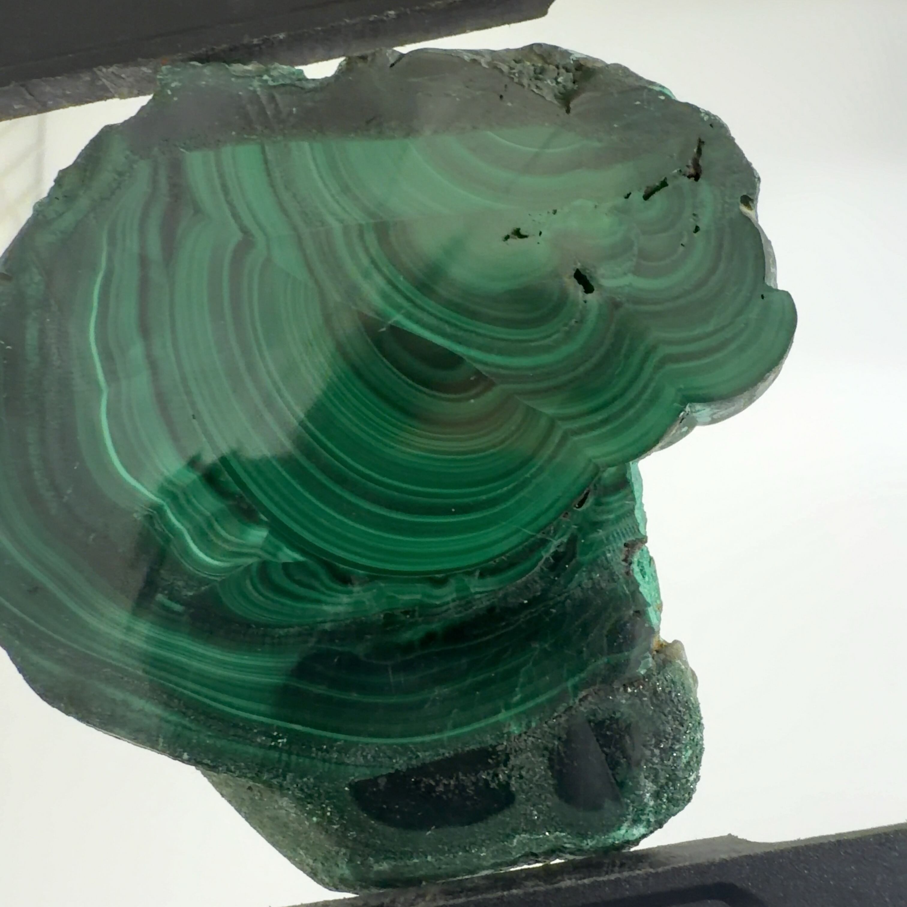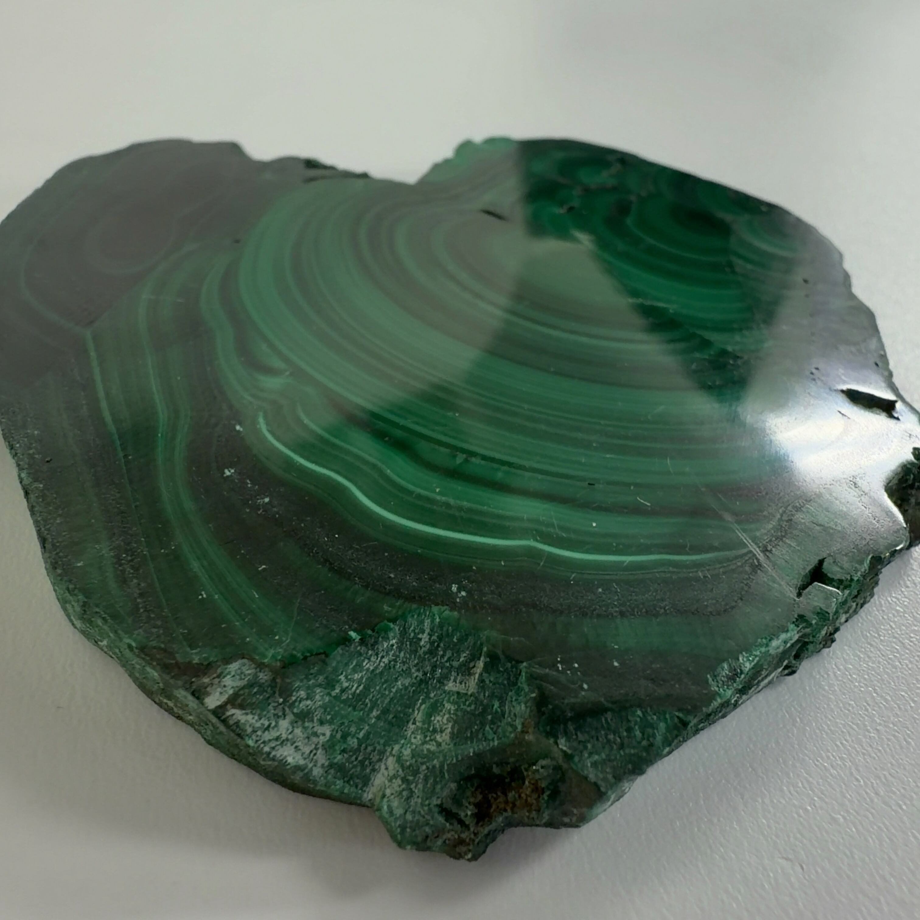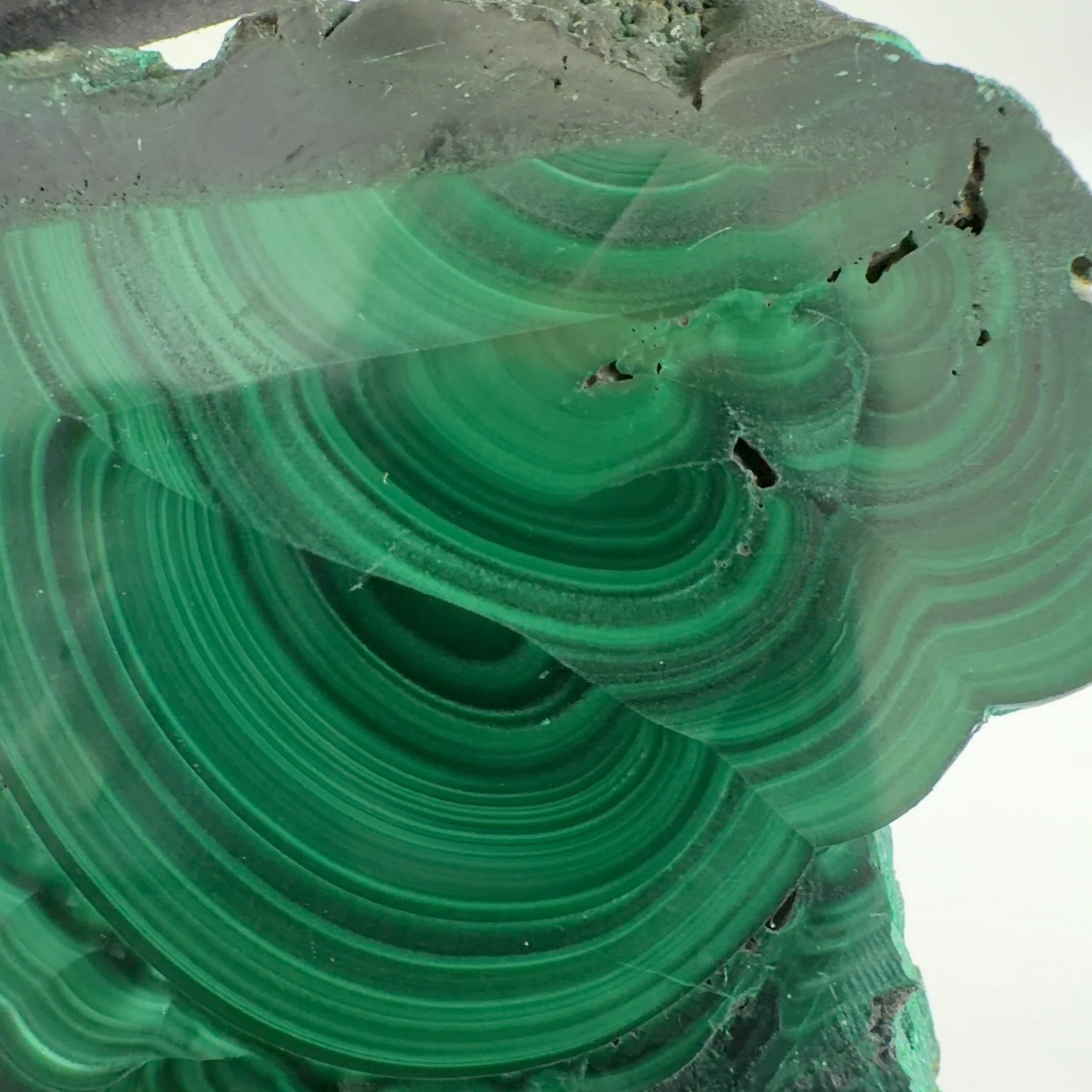水に溶けた黄銅鉱と水に溶けた二酸化炭素が反応してできる鉱物で、斜めから光を反射させると孔雀の羽のように見えるので和名は孔雀石と名付けられています。